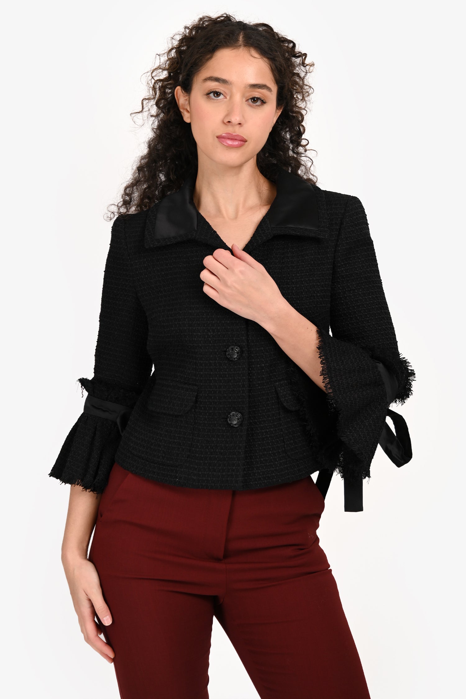 Pre-Loved Chanel™ Spring 2009 Black Fantasy Tweed Evening Jacket with Ribbon Detail. Slip-on. Pointed collar. Button and hook-and-eye closure in the front. 2 pockets with fold-over closure in the front. Bow detailing on the sleeves. Lined. Tonal hardware. Tonal stitching.