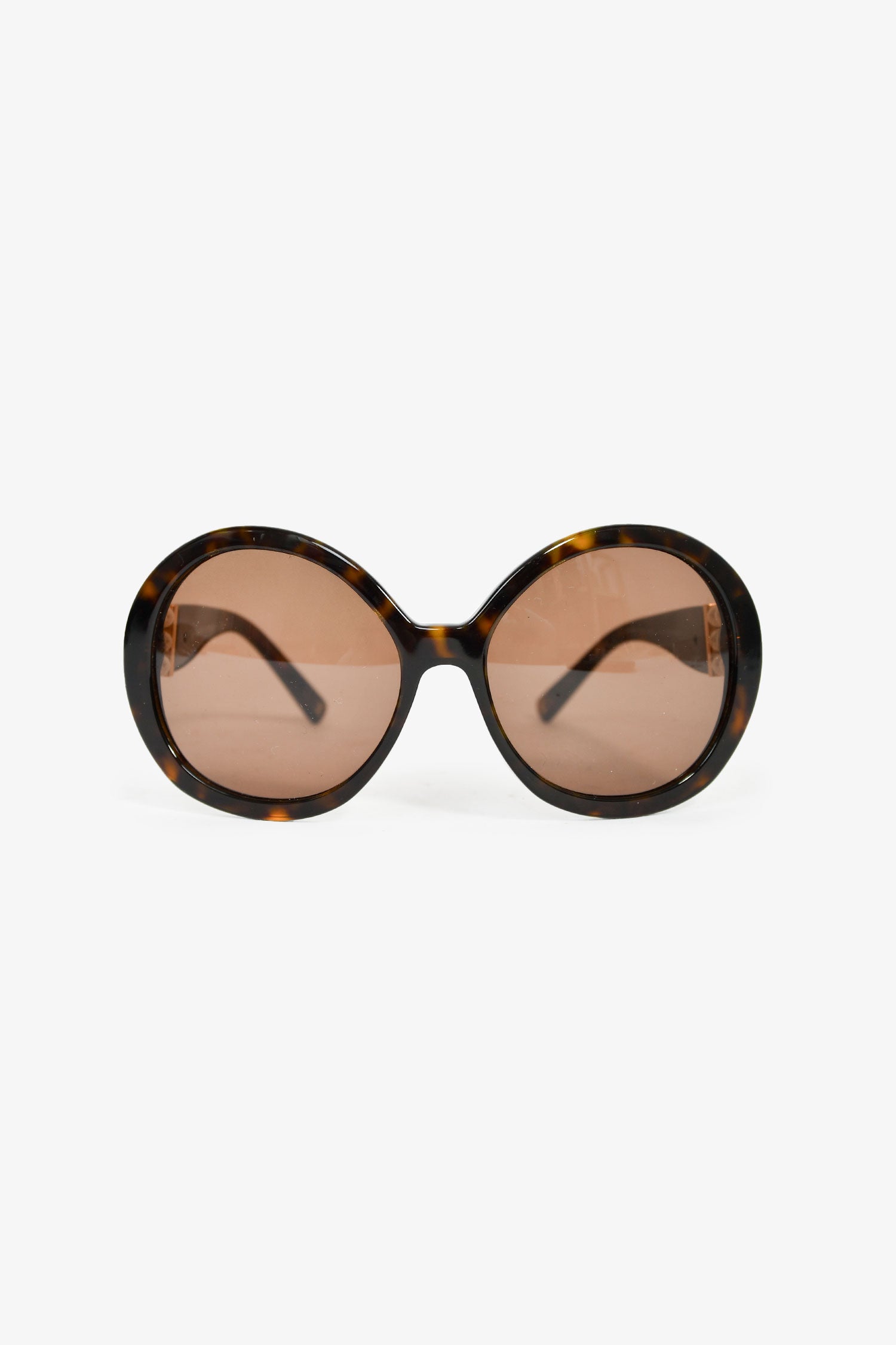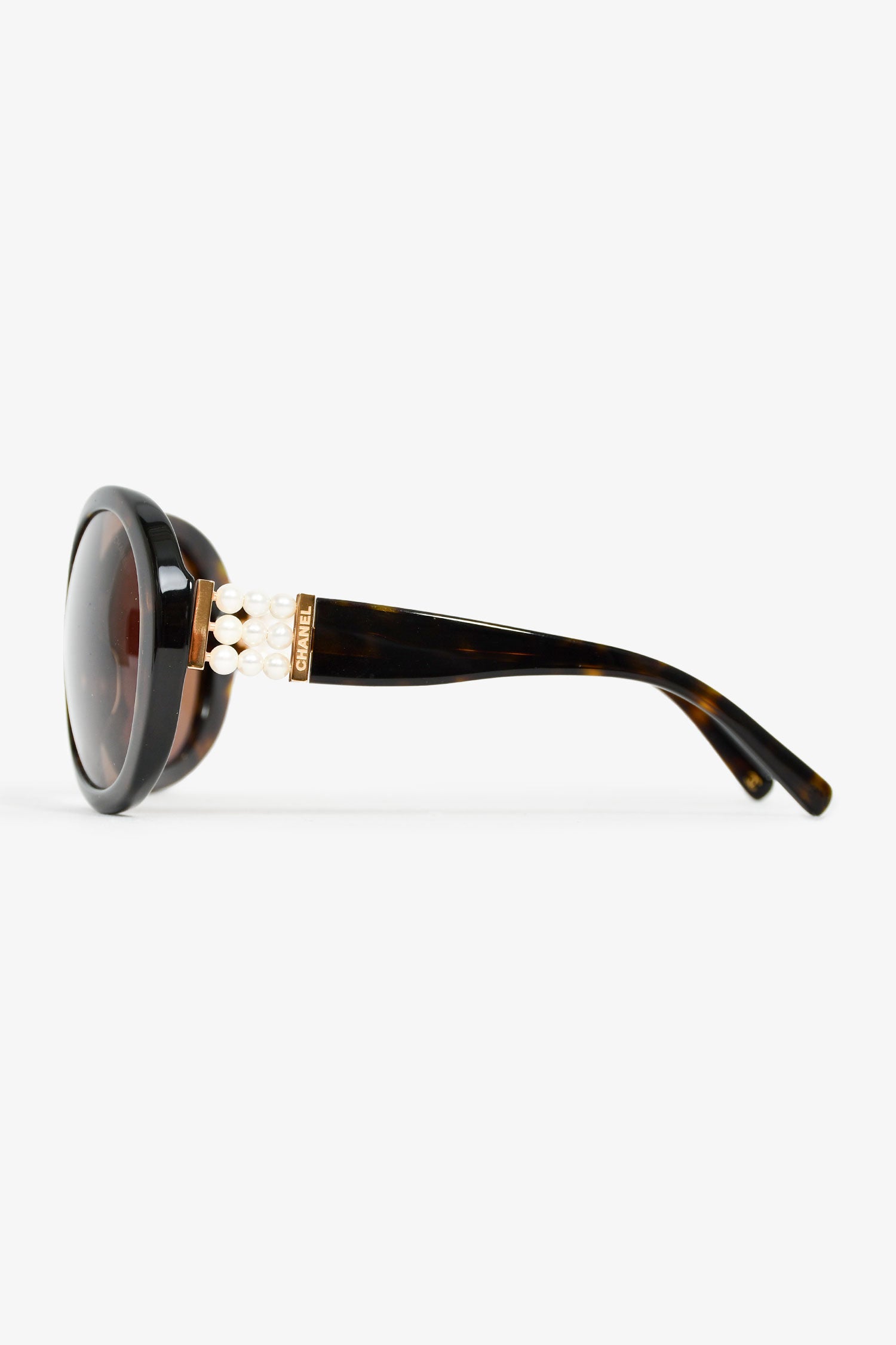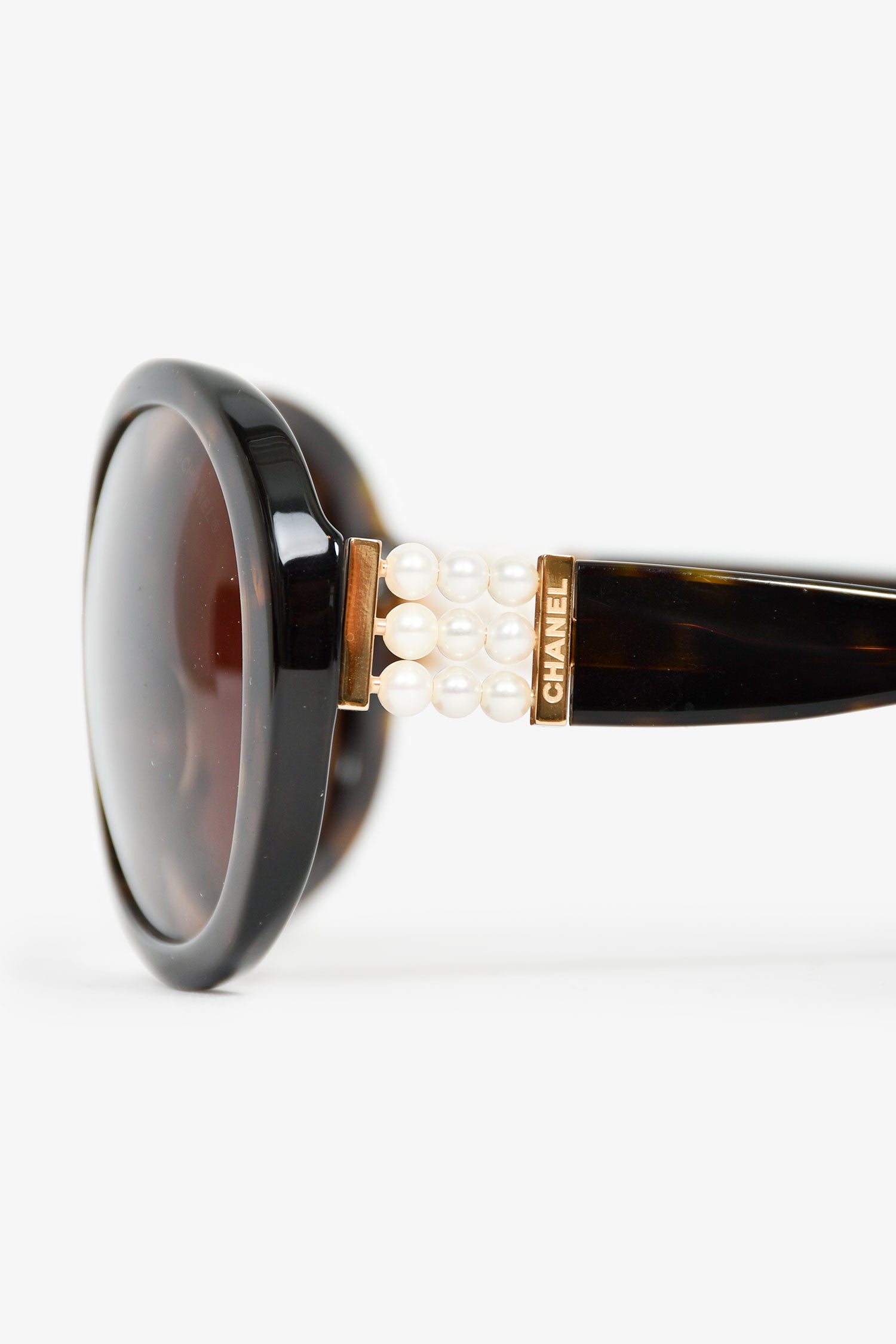 Refresh availabilityPre-Loved Chanel™ Tortoiseshell Faux Pearl Detail Round Sunglasses. Frame nose pads. Gold-tone hardware.