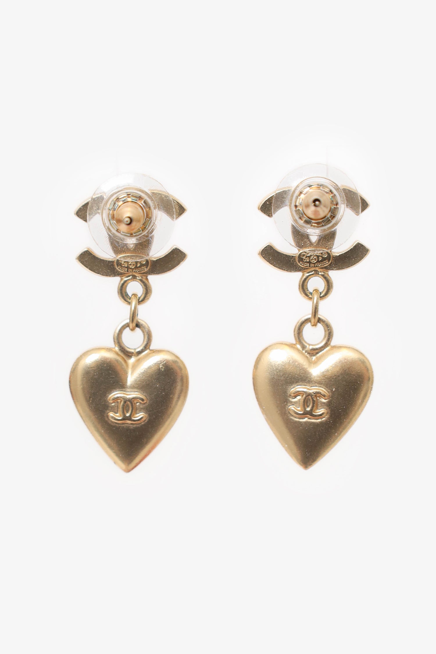 Refresh availabilityPre-Loved Chanel™ Vintage 2002 Rhinestone & Metal CC Heart Dangle Stud Earrings. Rear push-pin backing. Gold-tone hardware.