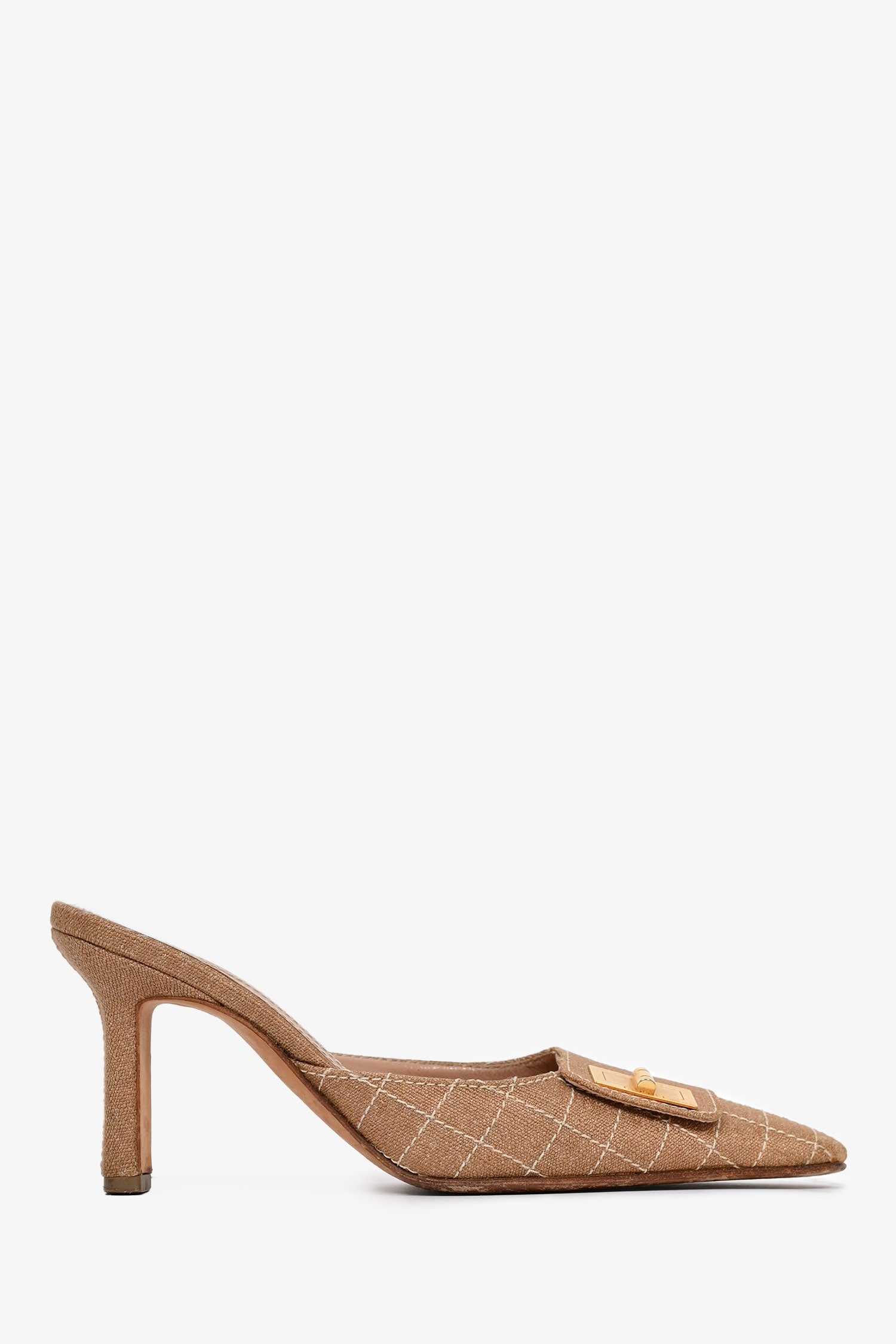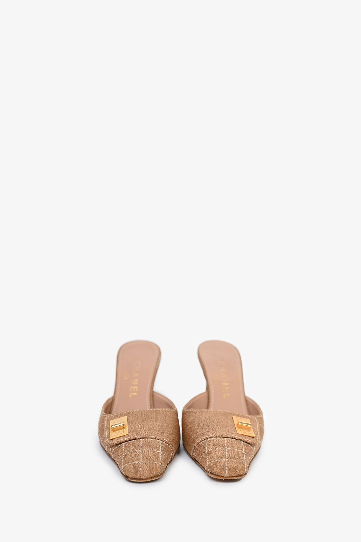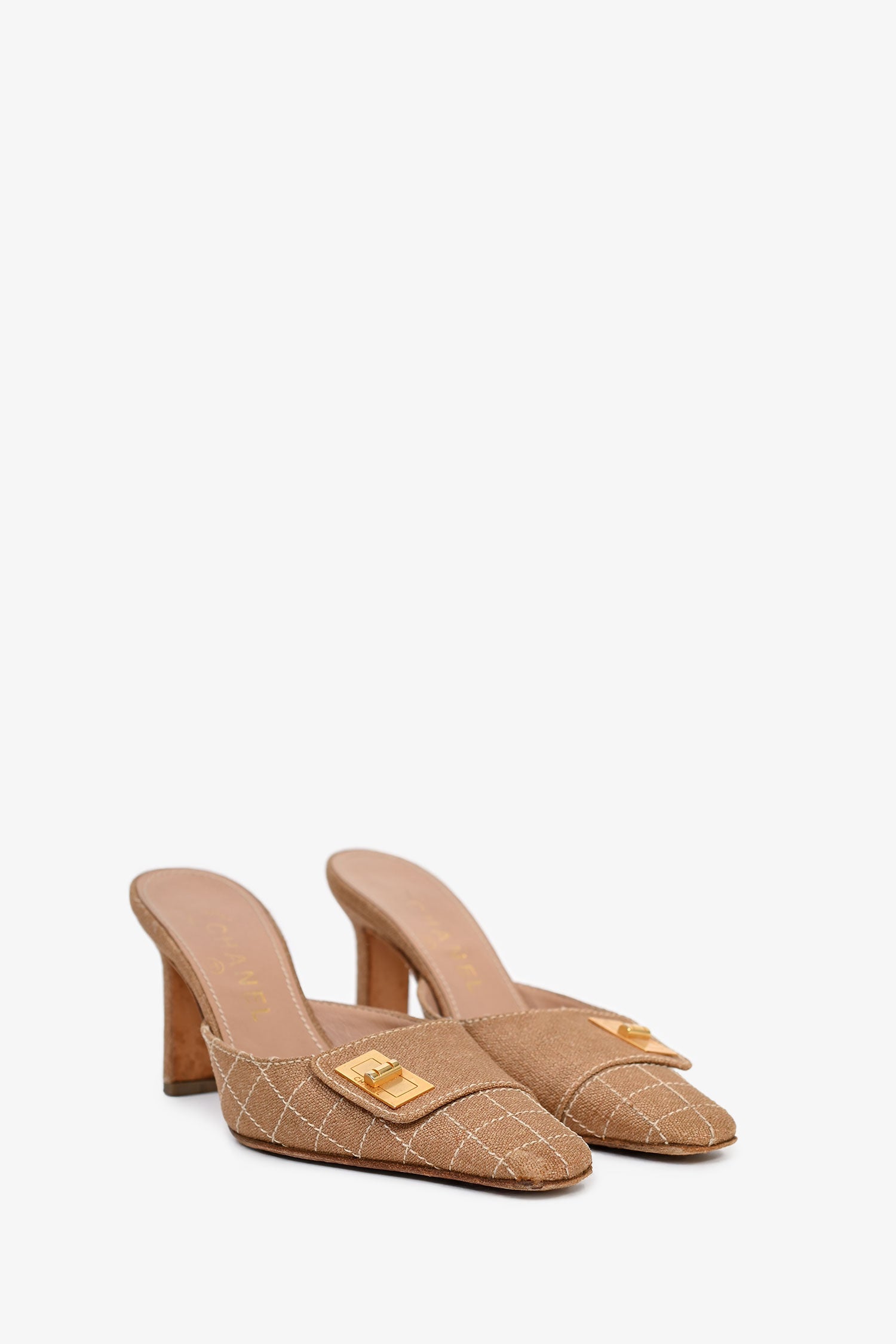 Refresh availabilityPre-Loved Chanel™ Vintage Beige Gold Lock Mules. Covered tweed exterior and heels. Gold-tone hardware. Leather insole. Contrast stitching.