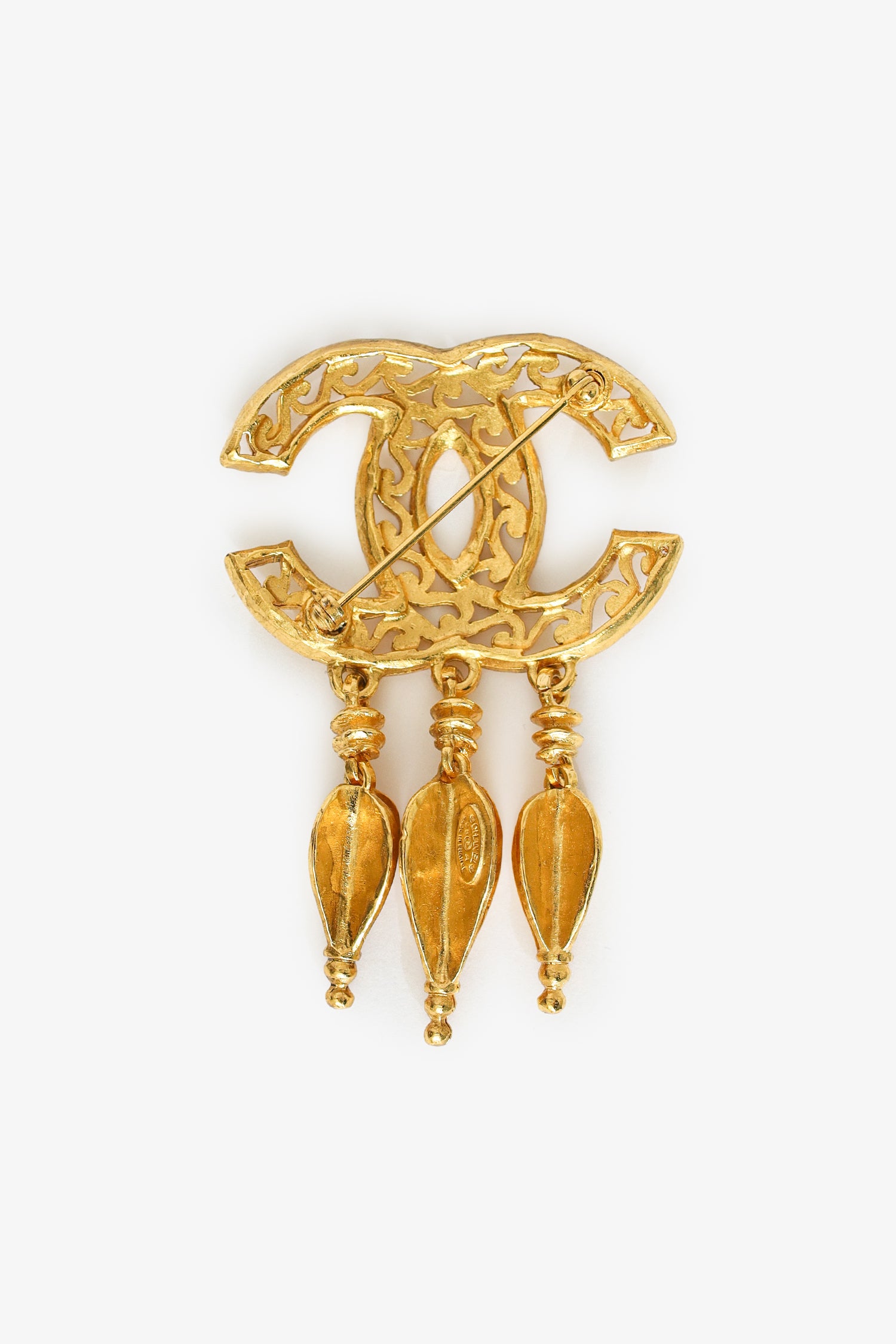 Refresh availabilityPre-Loved Chanel™ Vintage Gold-tone Coco Mark Fretwork Fringe Brooch. Rear turn-lock push-pin closure.
