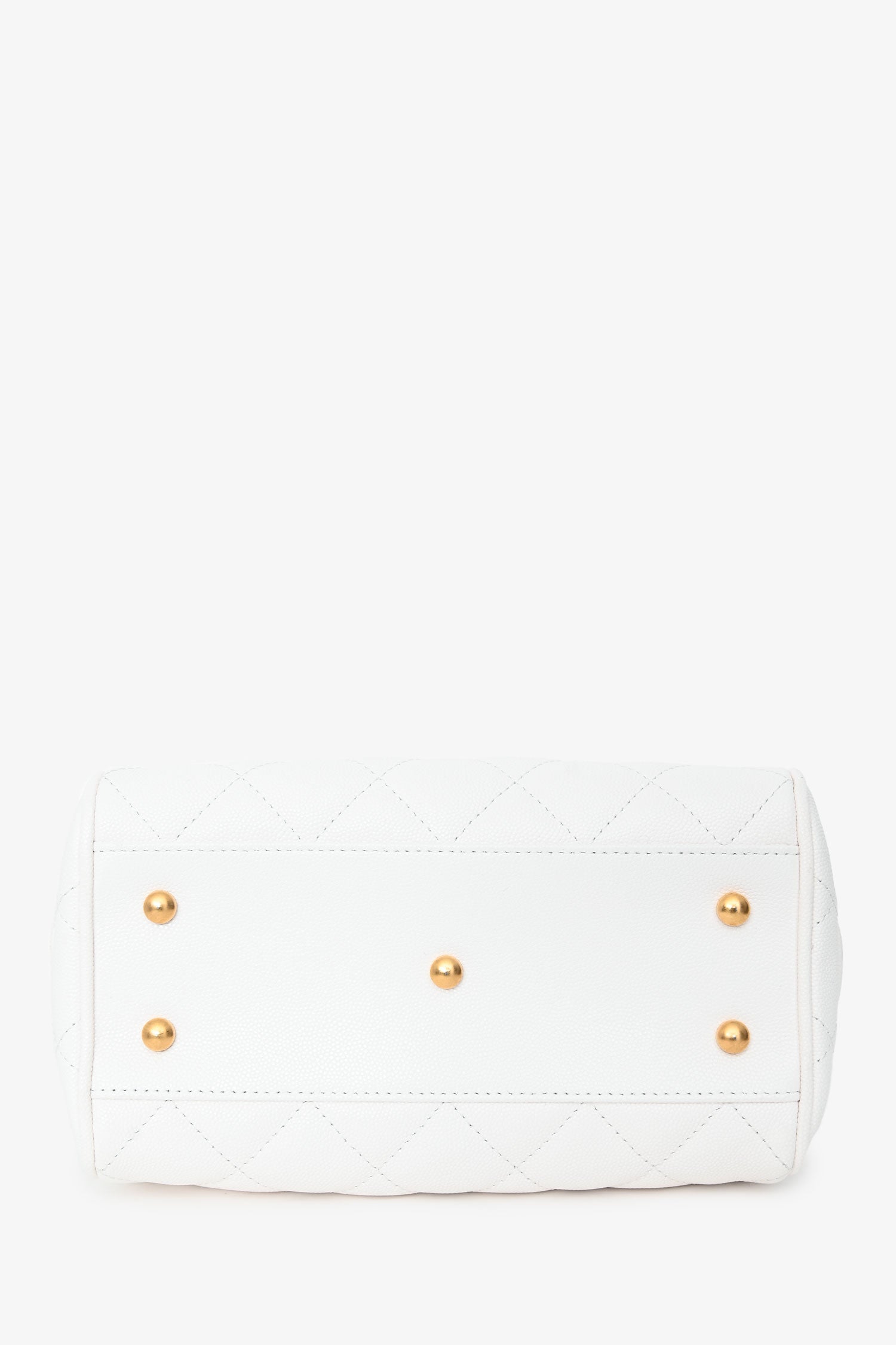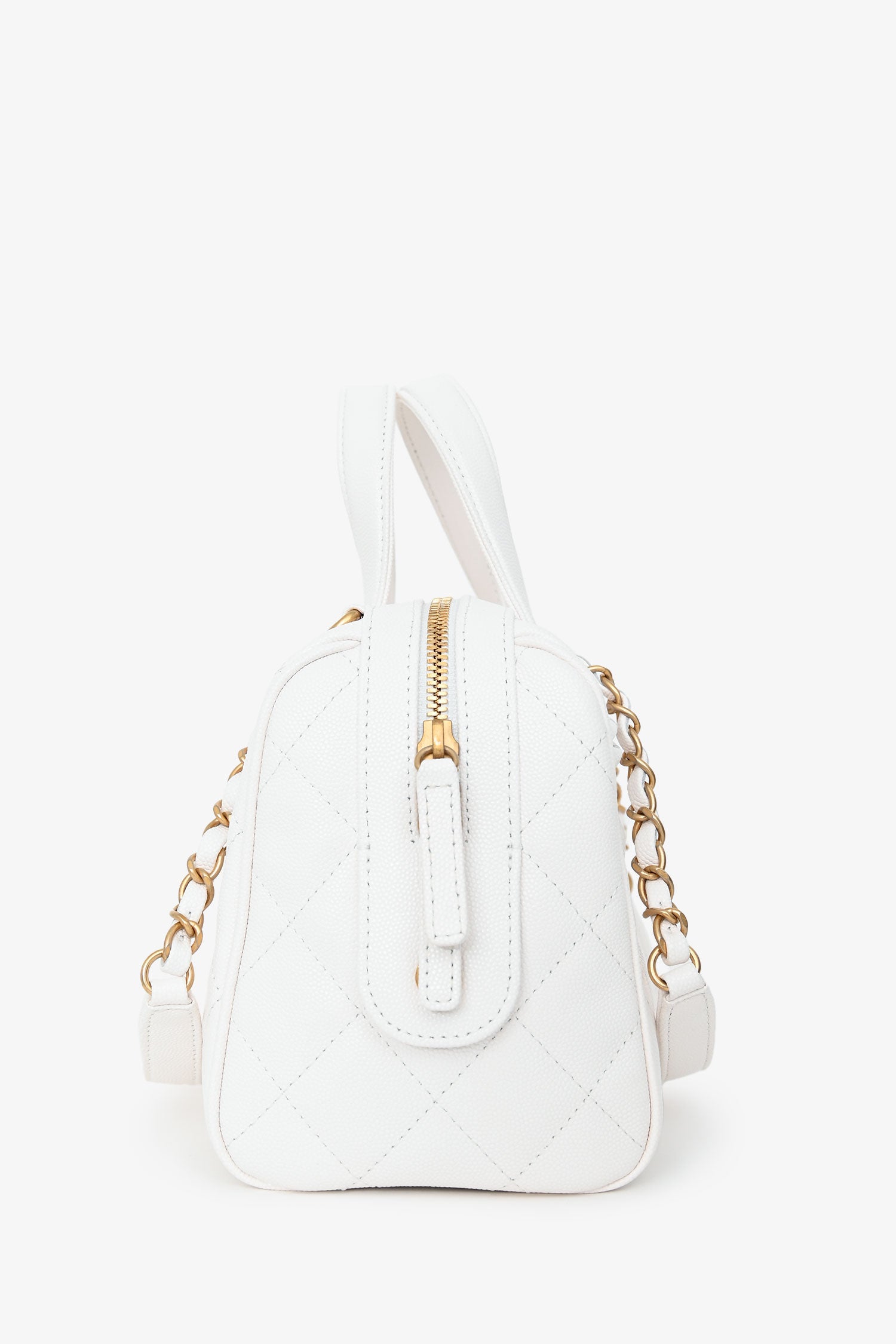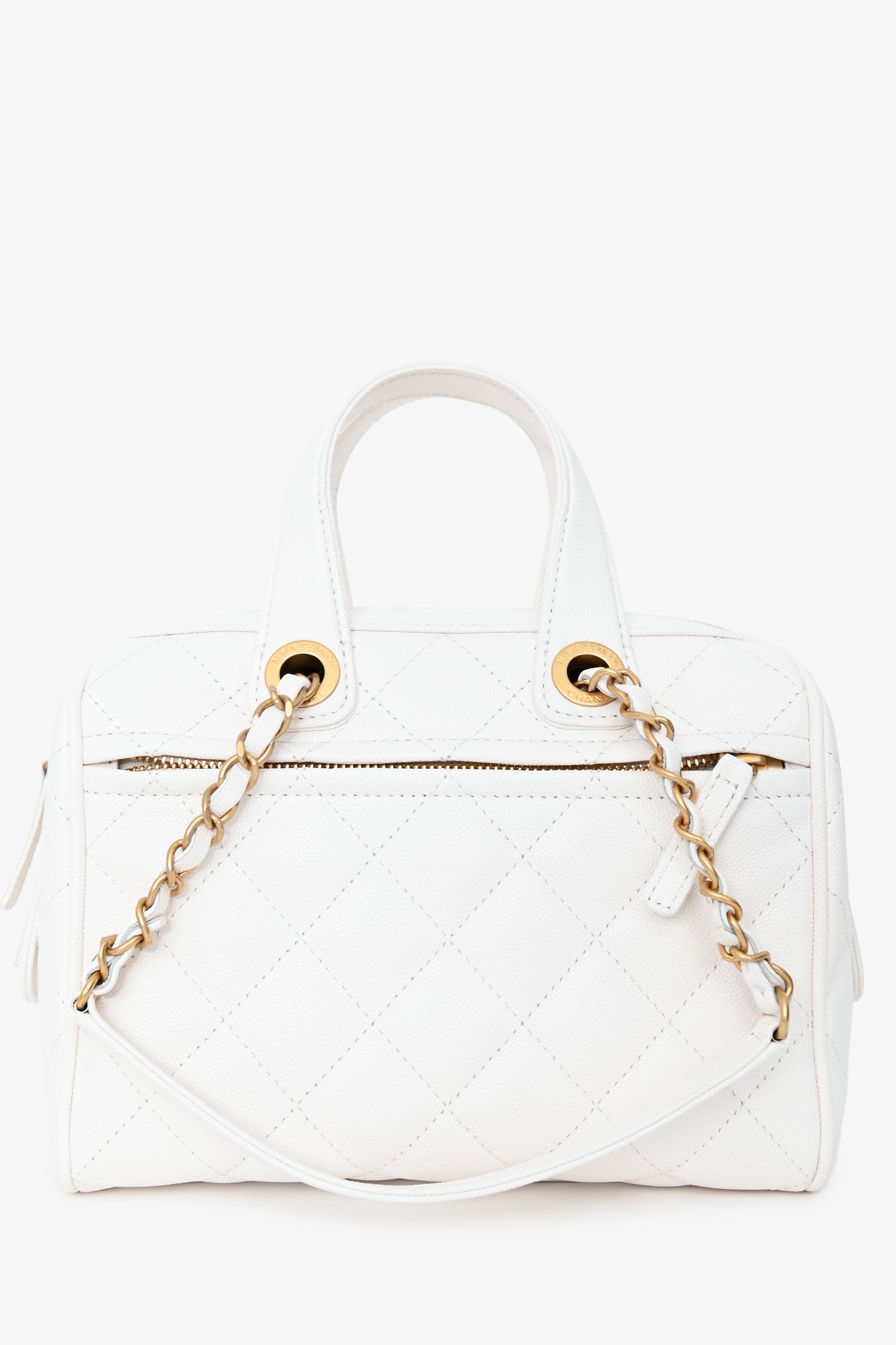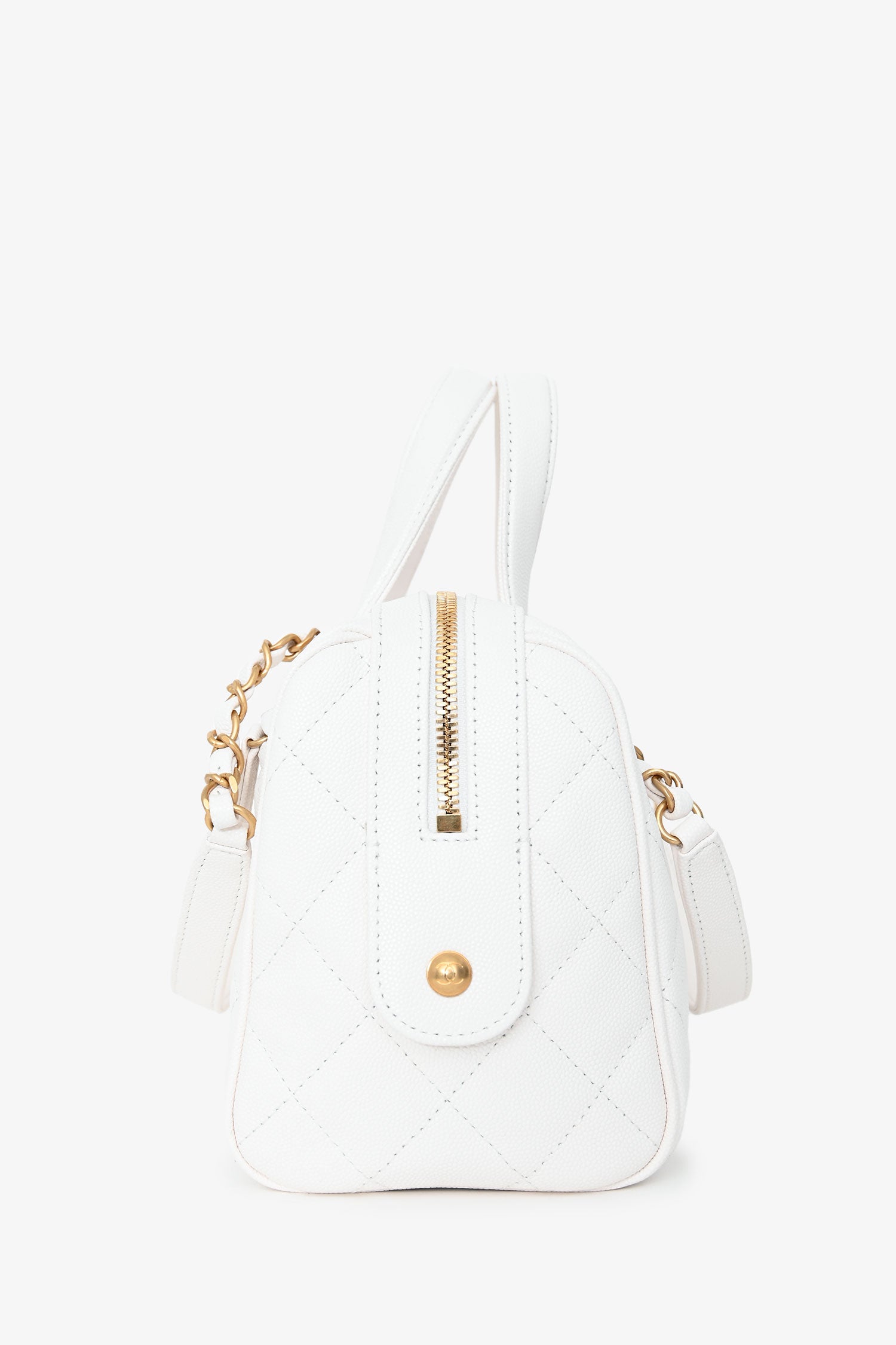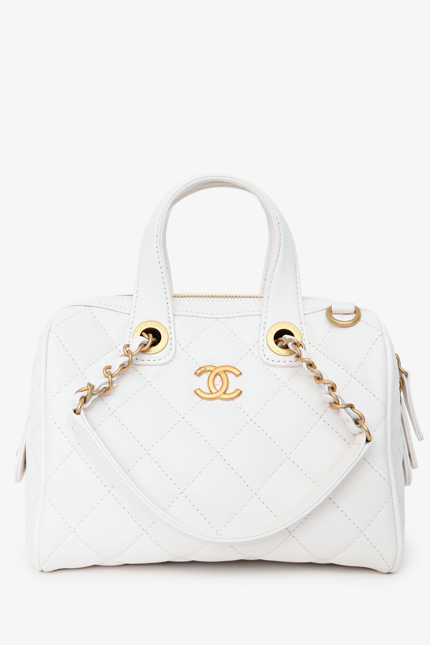 Refresh availabilityPre-Loved Chanel™ White Caviar Leather Bowling Bag with Gold Hardware. Zip-around top closure. Dual rolled top handles and shoulder straps. 1 exterior zip pocket; 2 interior zip pockets; 1 interior slip pocket. 5 protective base studs. Gold-tone hardware. Tonal stitching.