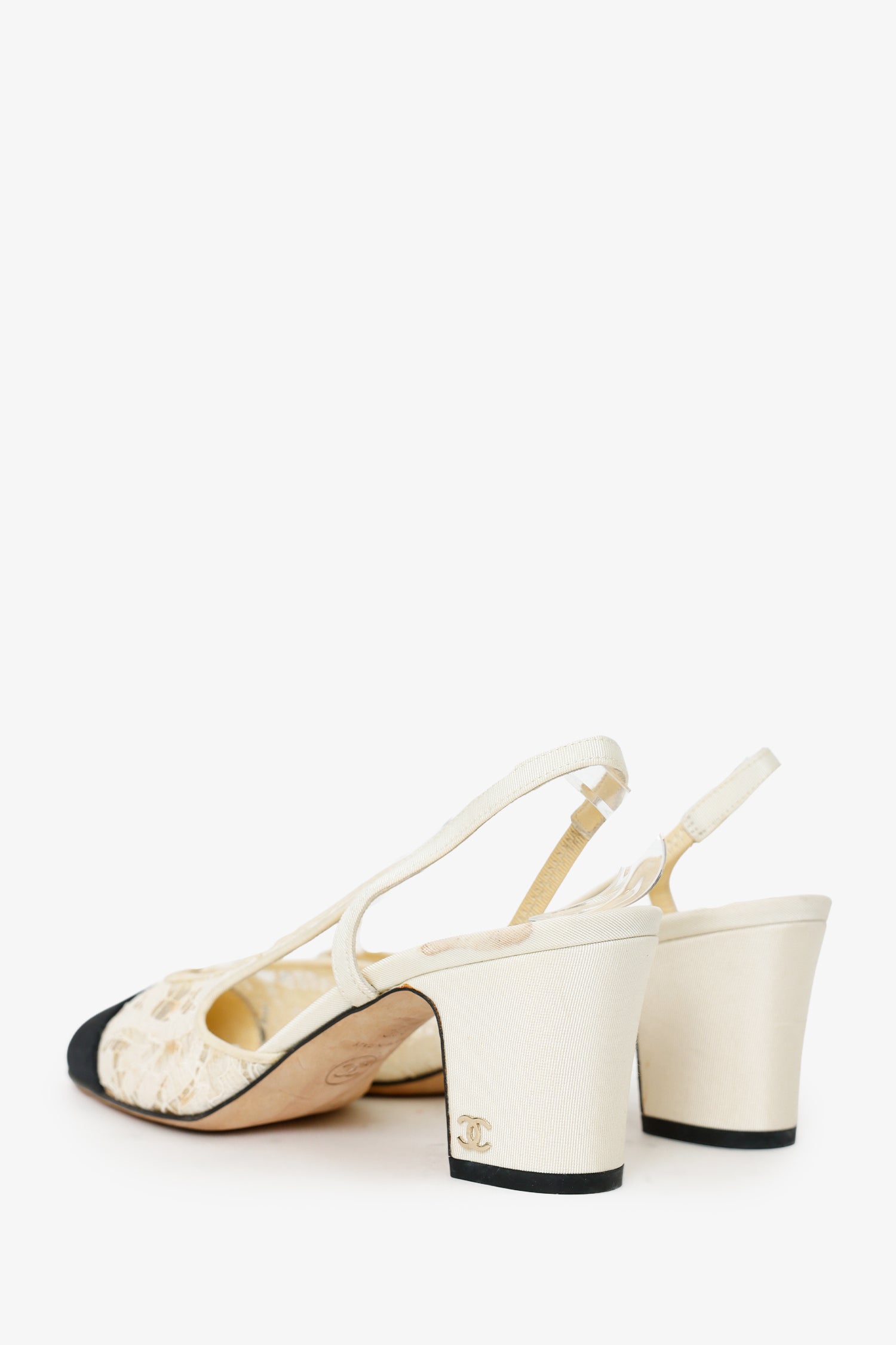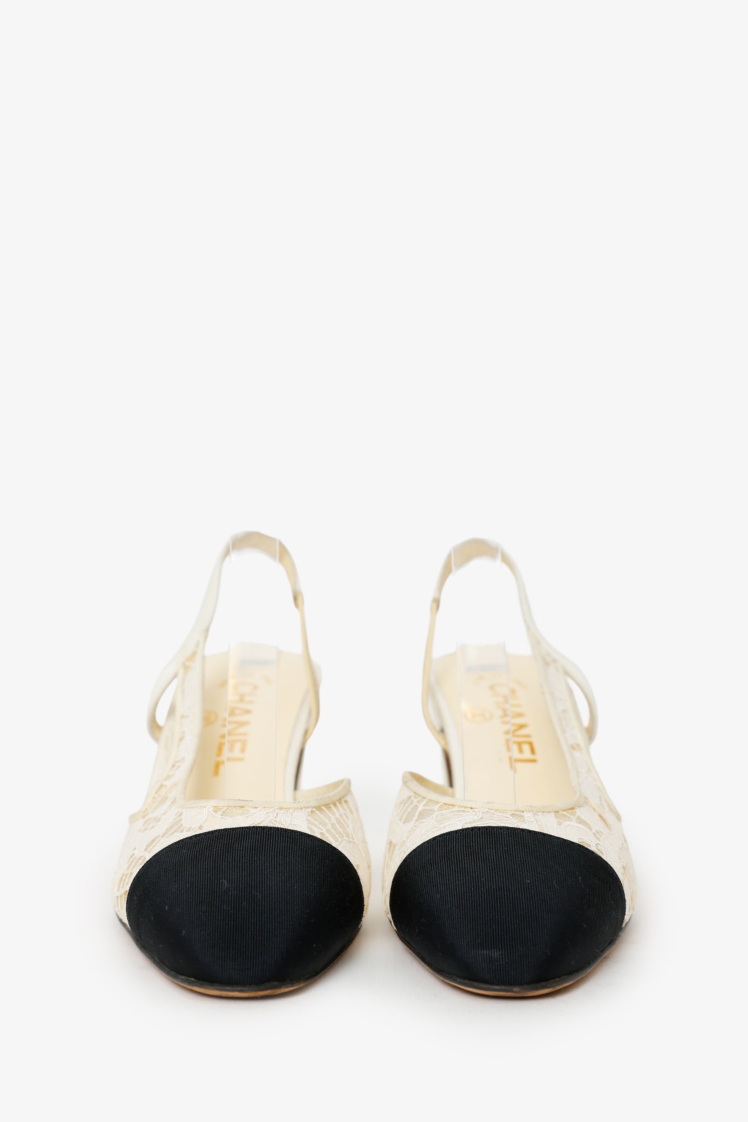 Refresh availabilityPre-Loved Chanel™ White/Black Lace Cap Toe Slingback Sandals. Round toe. Block heel. Lined interior. Tonal stitching.