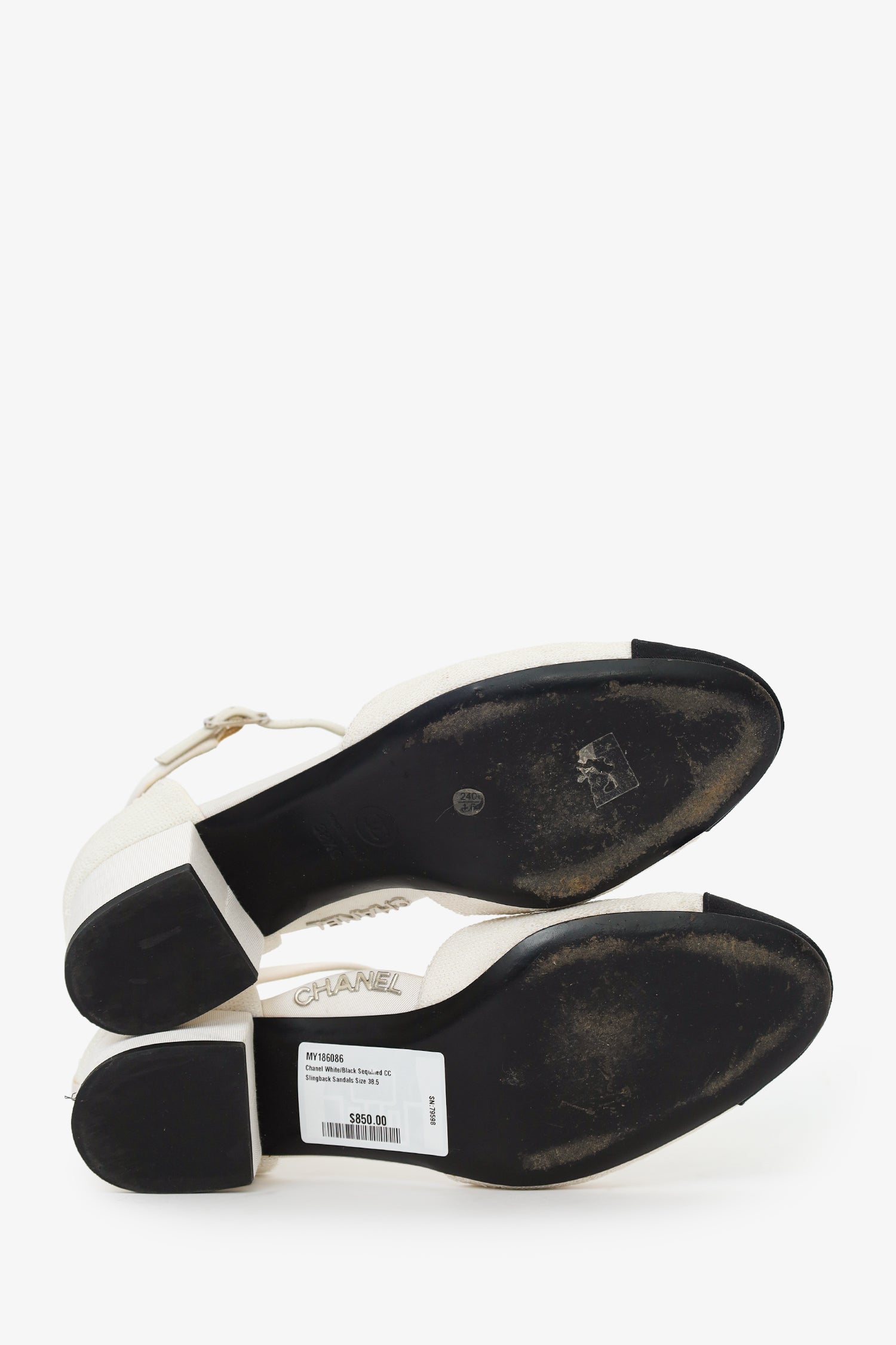 Refresh availabilityPre-Loved Chanel™ White/Black Sequined CC Slingback Sandals. Rounded toe. Adjustable push-pin buckle closure. Silver-tone hardware. Tonal stitching.