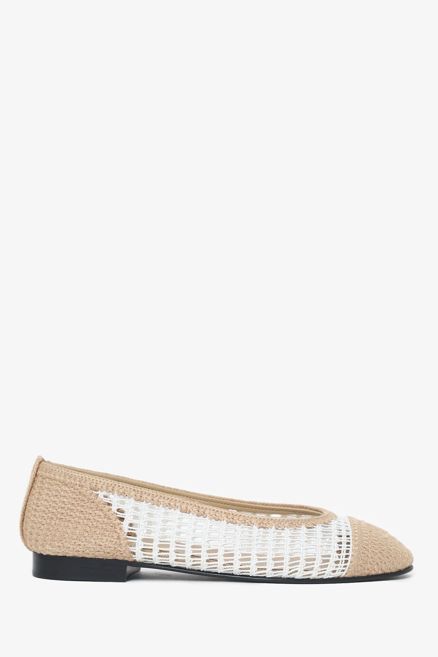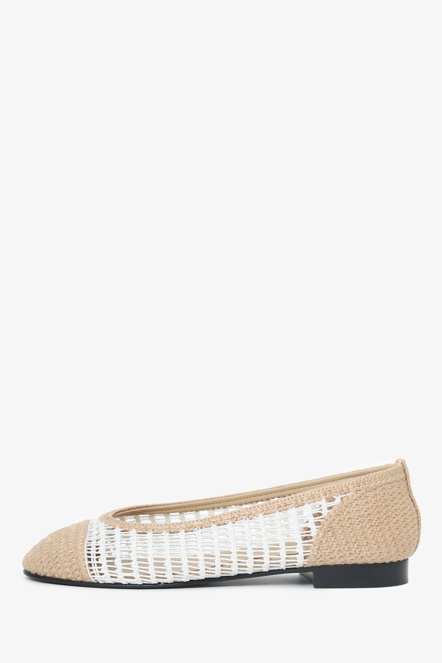 Refresh availabilityPre-Loved Chanel™ White/Brown Raffia CC Cap Toe Ballerina Flats. Slip-on. Round-toe. Tonal stitching.