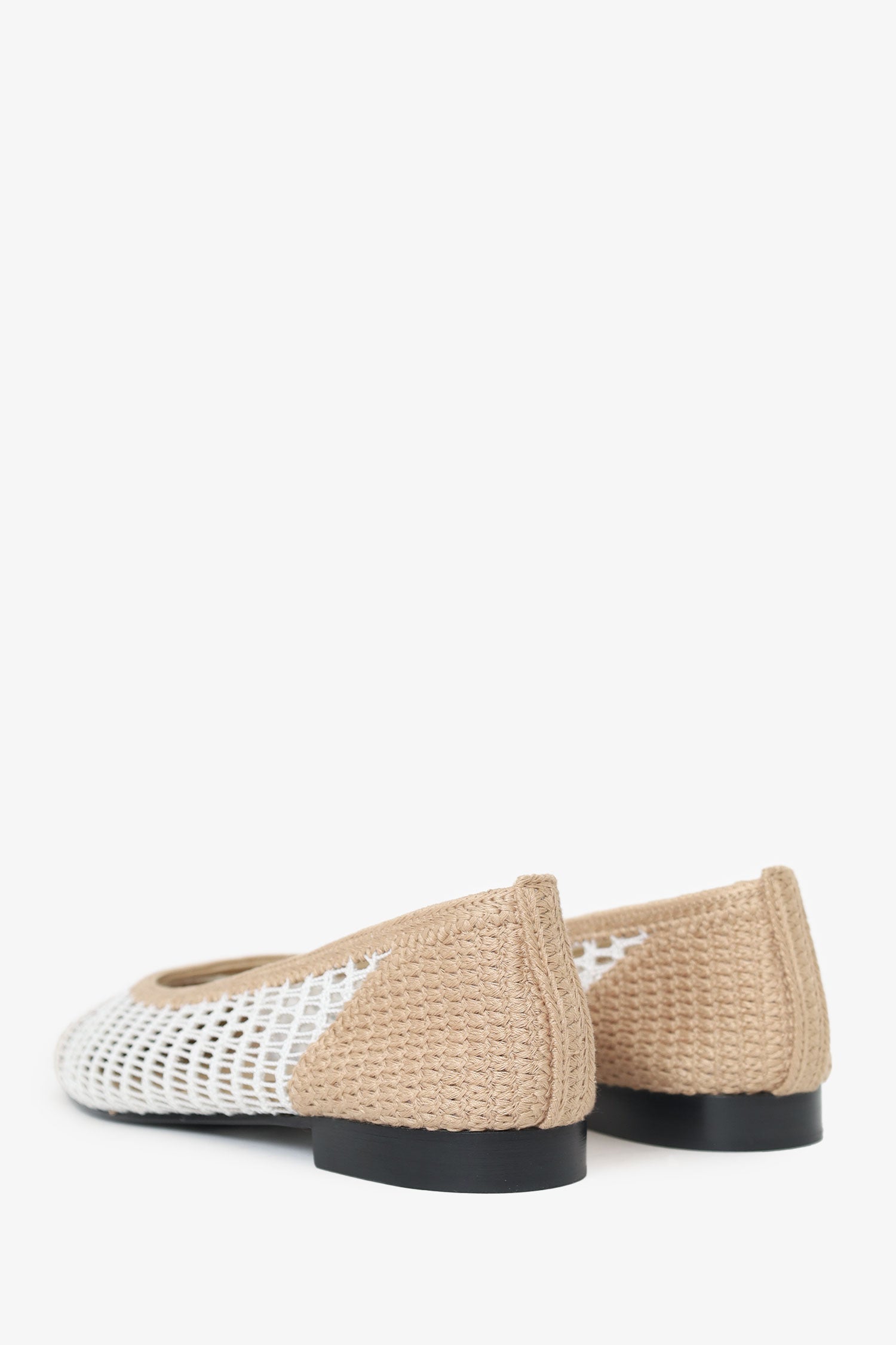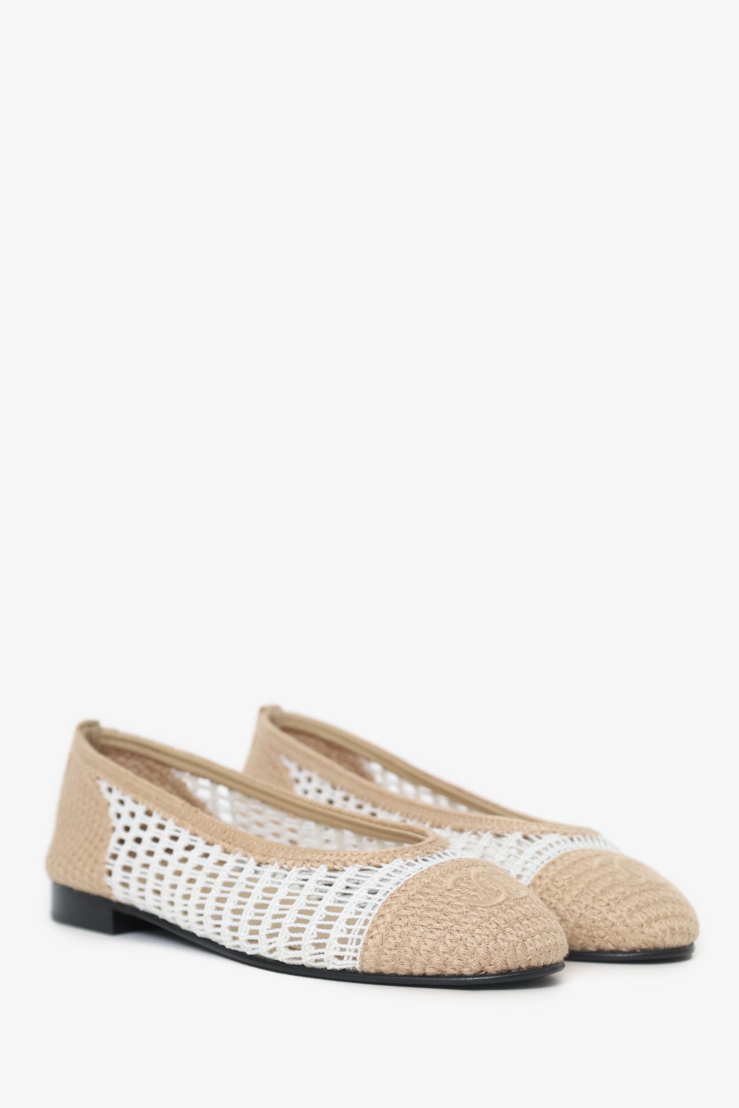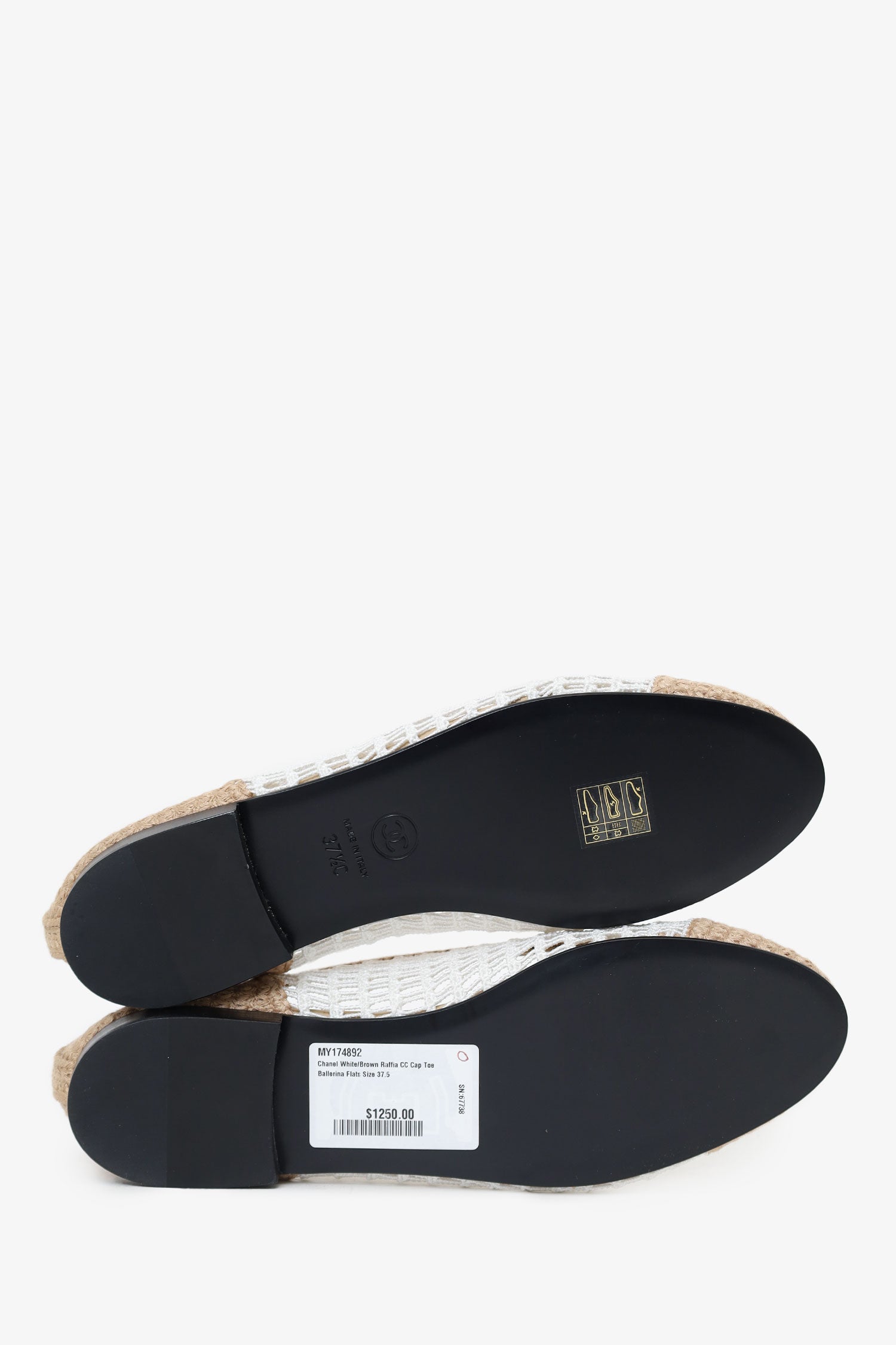 Pre-Loved Chanel™ White/Brown Raffia CC Cap Toe Ballerina Flats Size 37.5