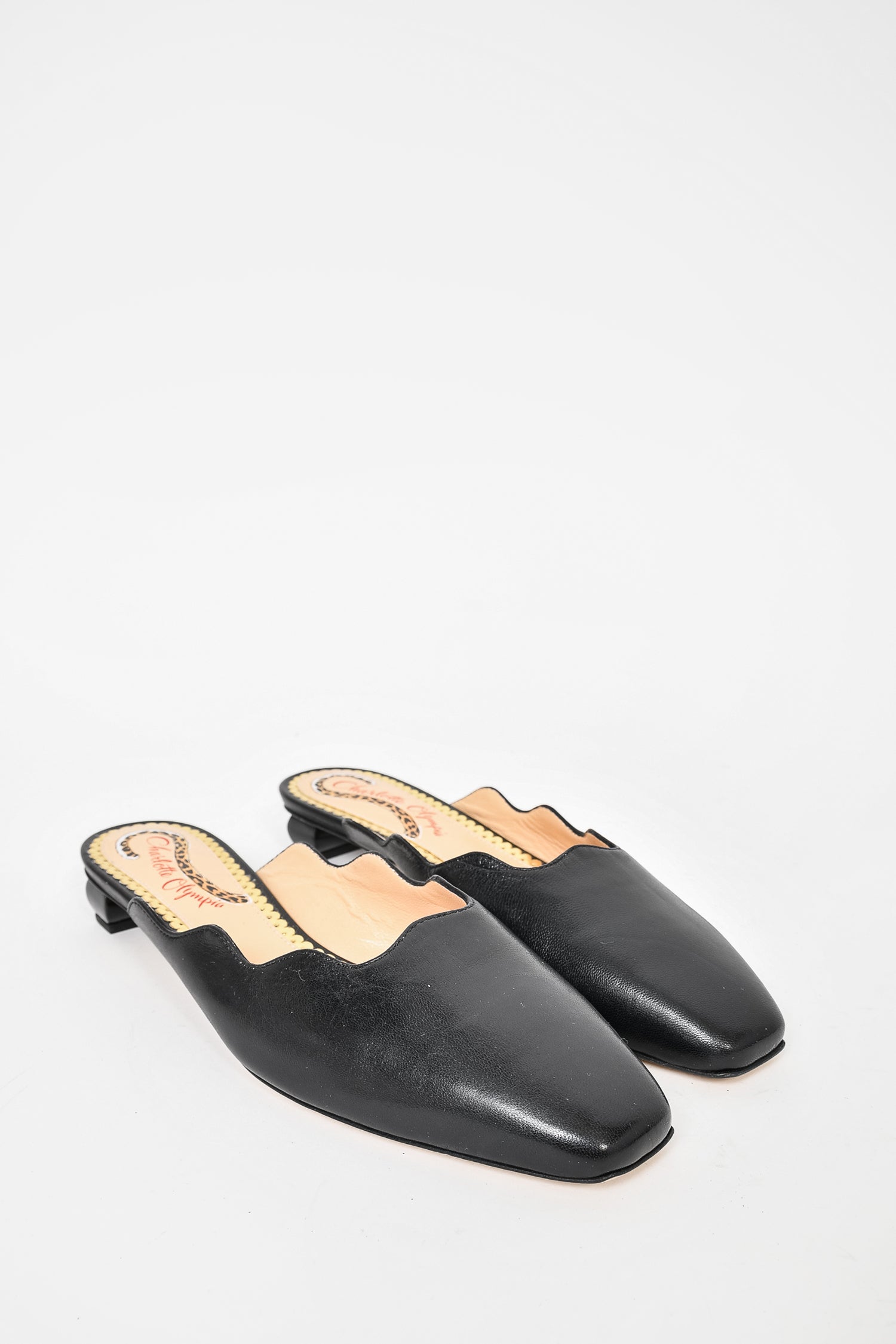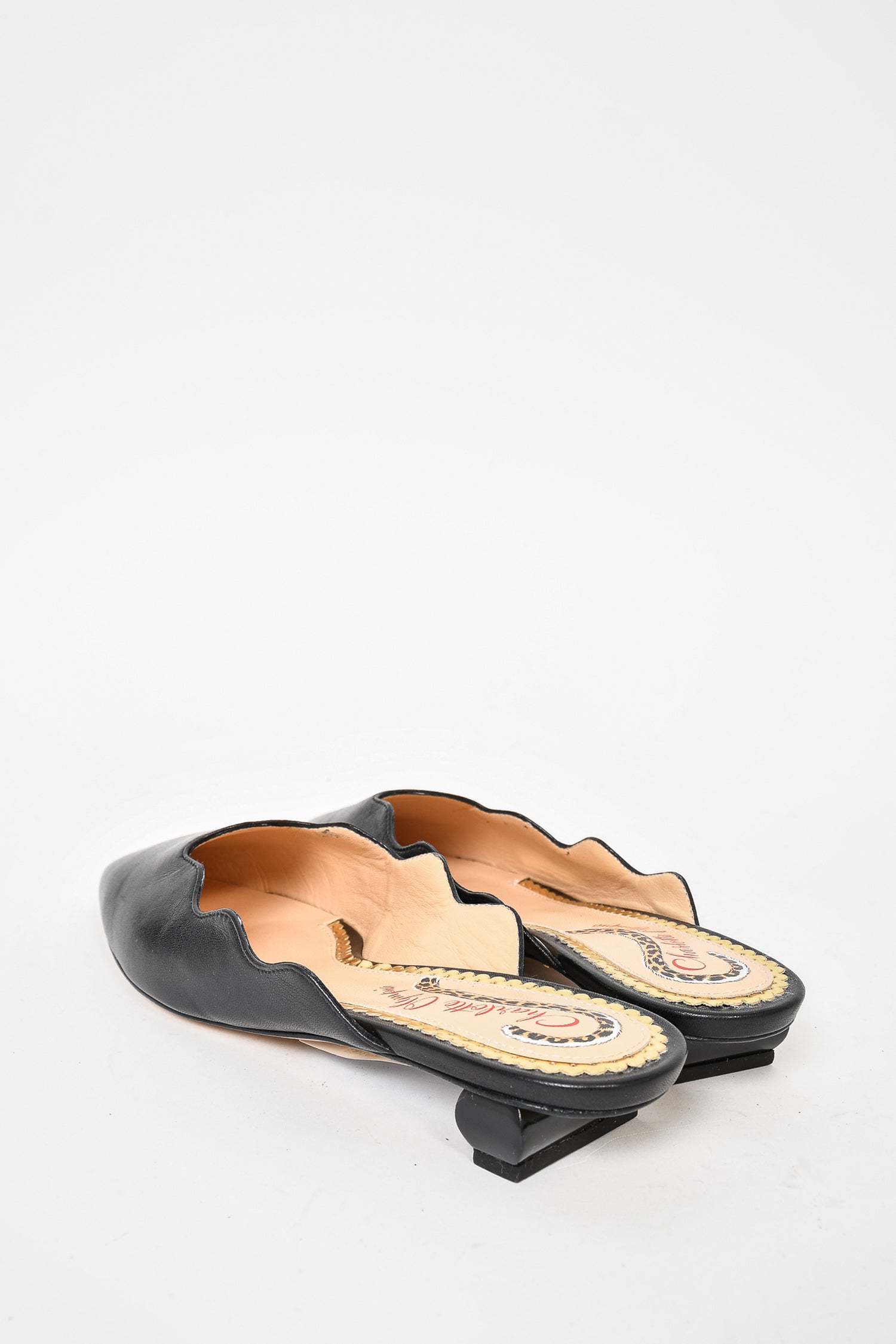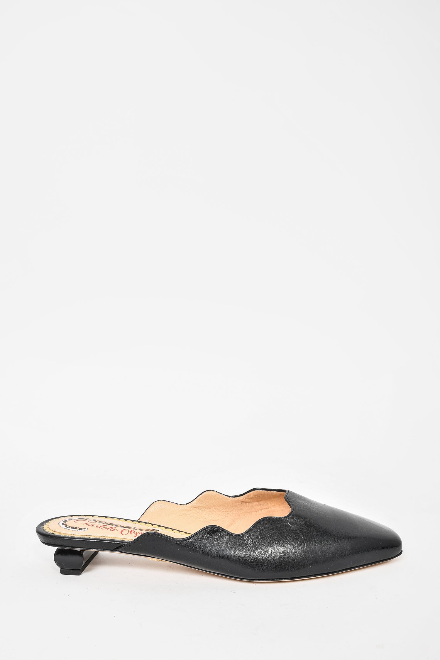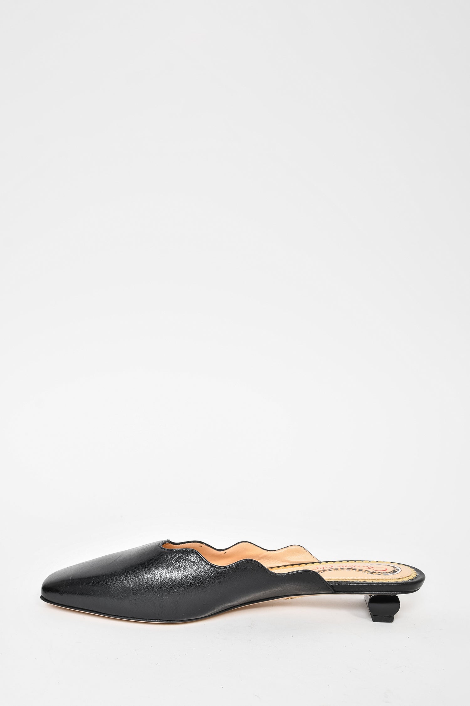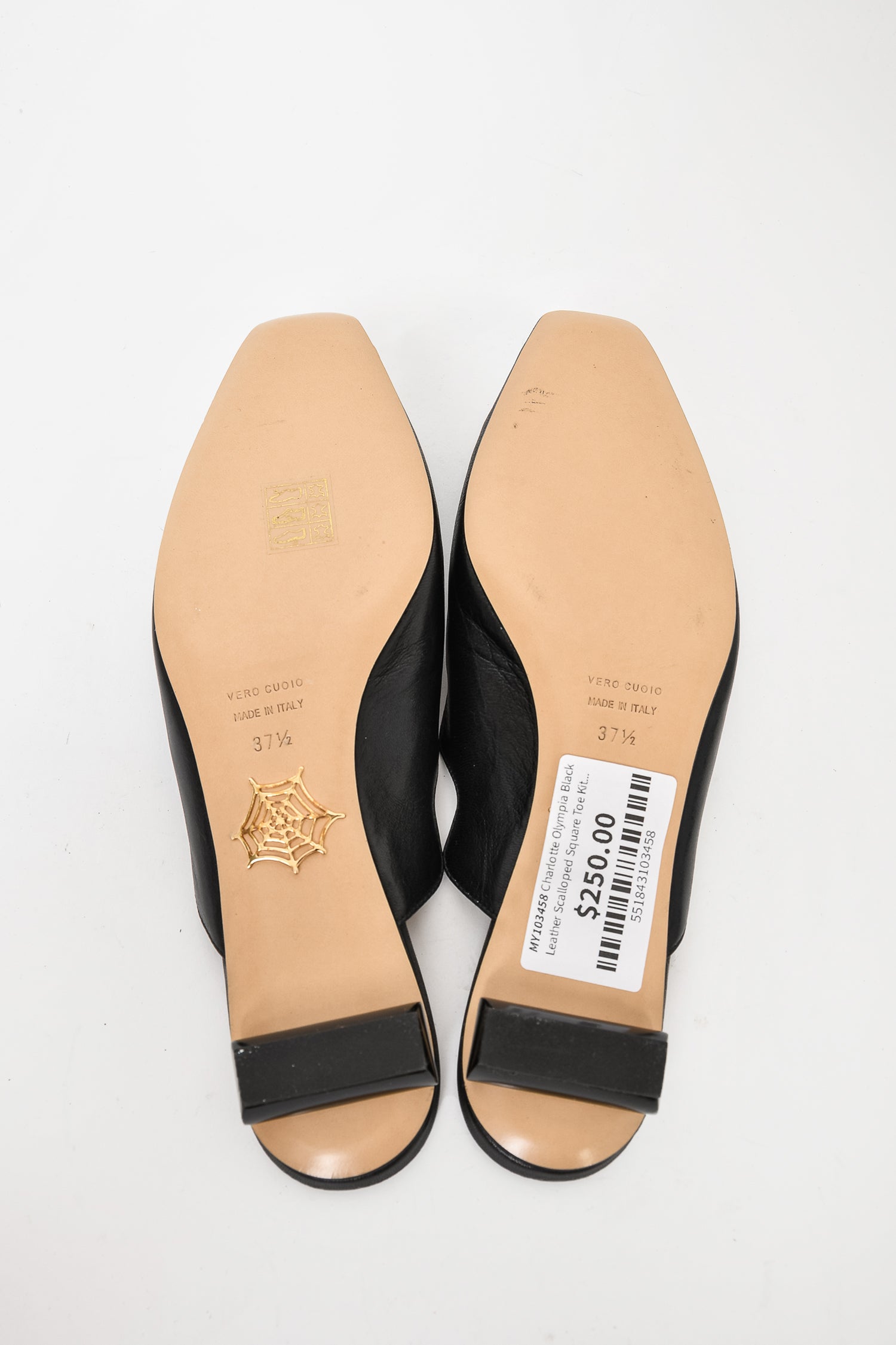 Refresh availabilityCharlotte Olympia Black Leather Scalloped Square Toe Kitten Heels. Slip on. Square toe. Tonal stitching.