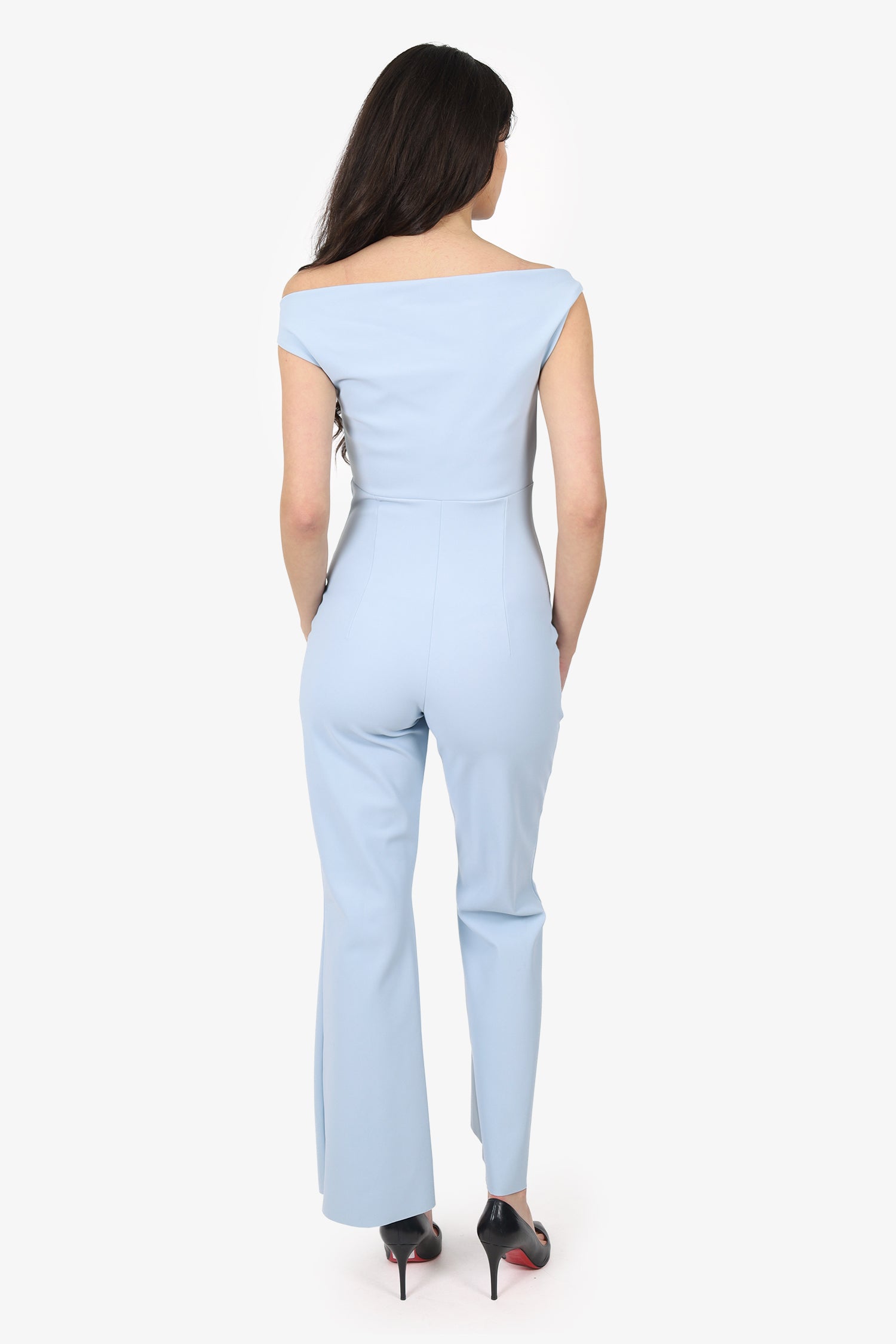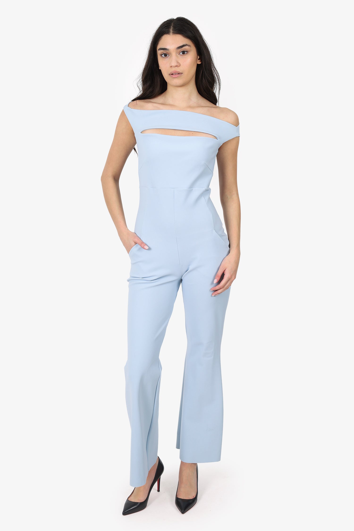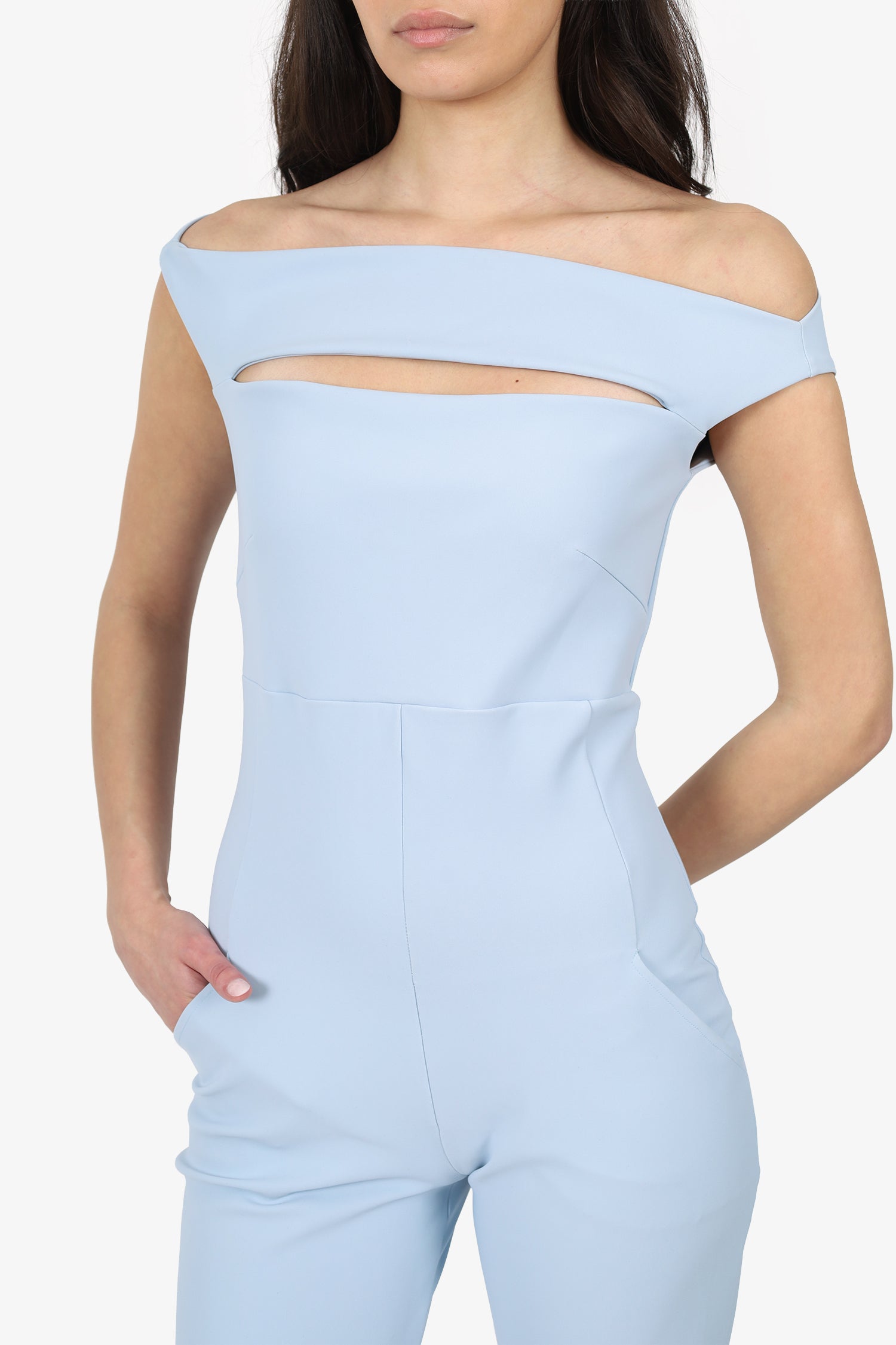 Refresh availabilityChiara Boni Blue Cowel Neck Jumpsuit. Pull-on. Off-the-shoulder neckline. 2 exterior side slip pockets. Tonal stitching.