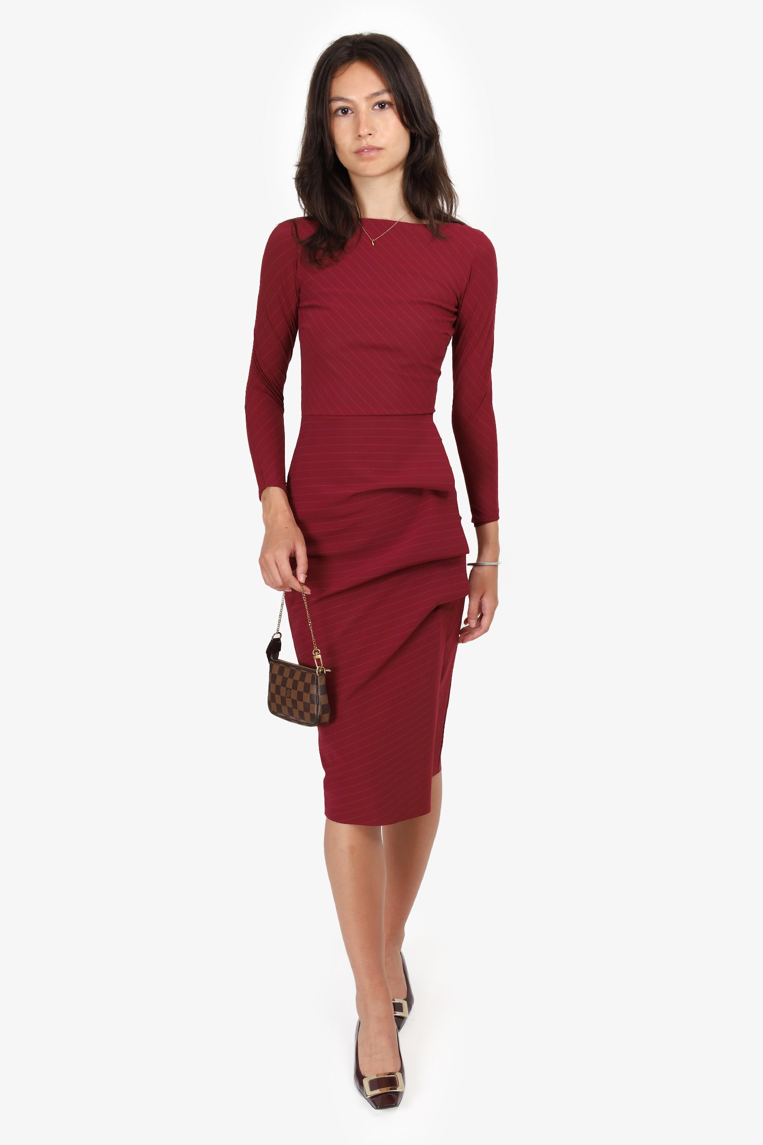 Chiara Boni La Petite Robe Red Striped Long Sleeve Midi Dress. Round neckline. Slip-on. Unlined. Tonal stitching.
