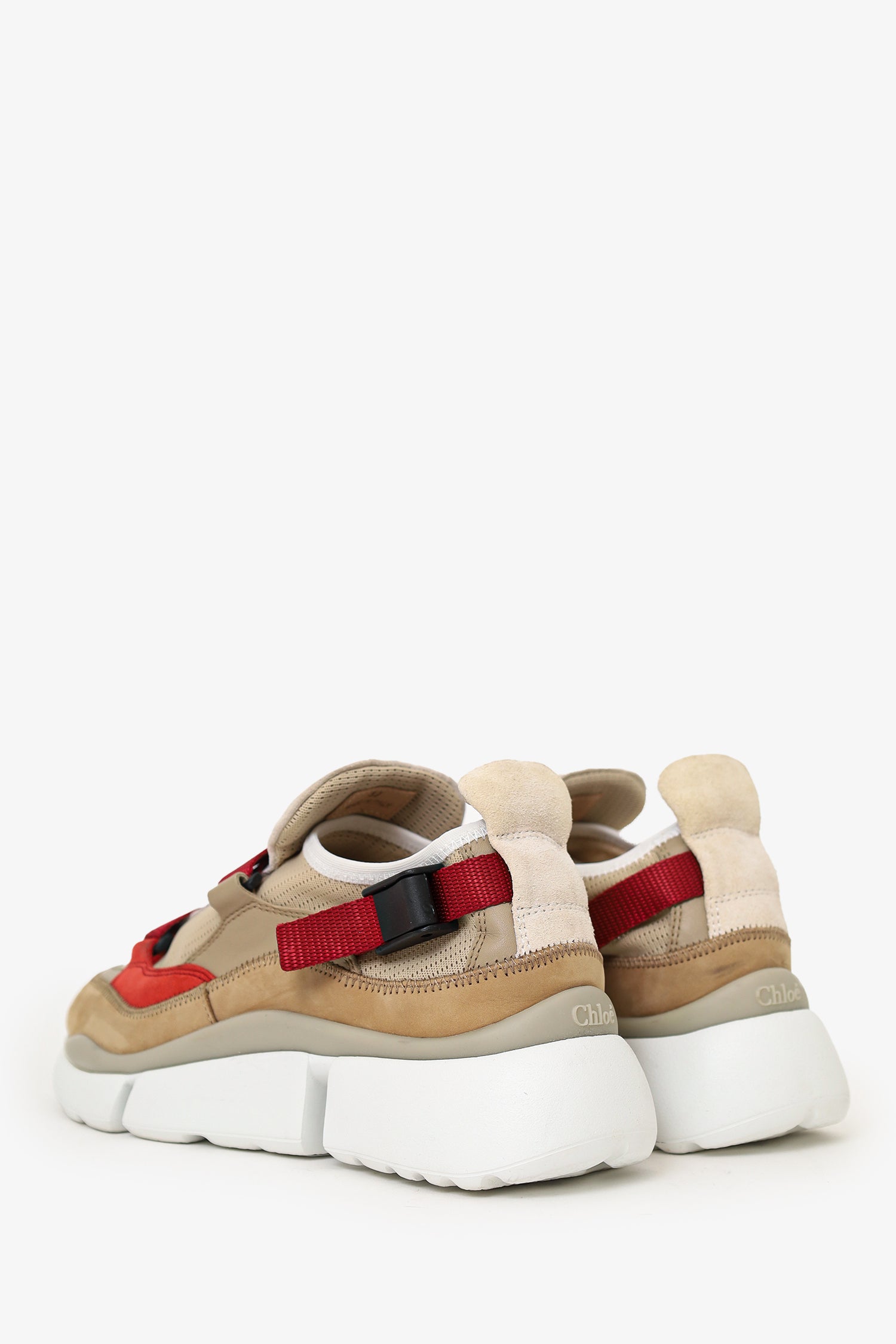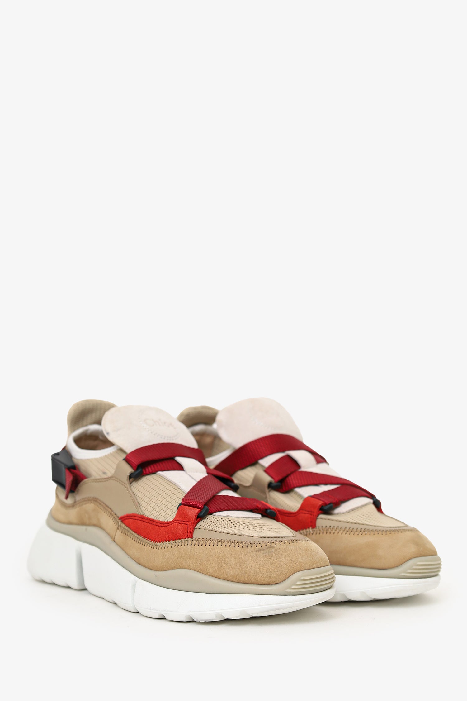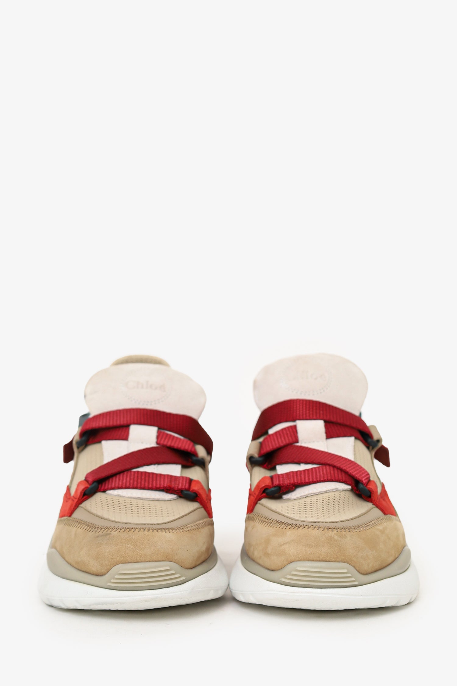 Refresh availabilityChloe Beige/Red Suede Sneakers. Pull-on. Pointed-round toe. Adjustable pull-through closure. Tonal stitching.