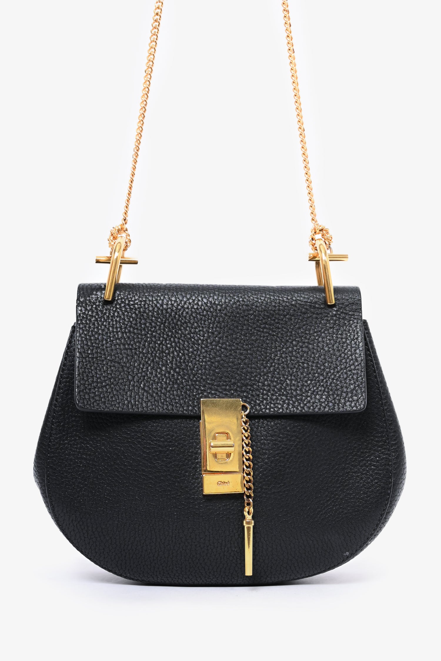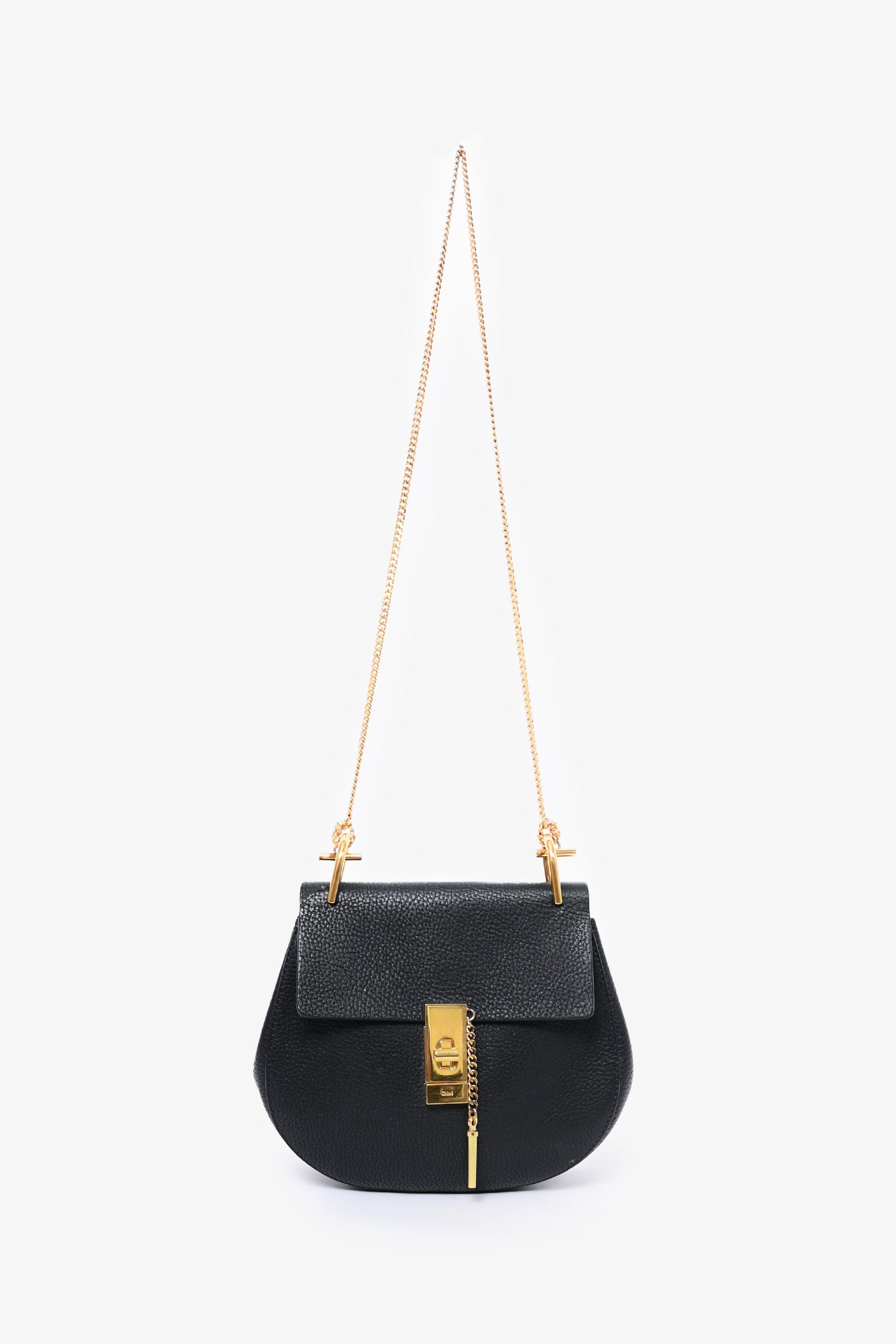 Refresh availabilityChloe Black Grained Leather Drew Bag. Front fold-over flap with turn-lock closure. Suede interior lining. Single open compartment with wall slip pocket. Gold-tone hardware.