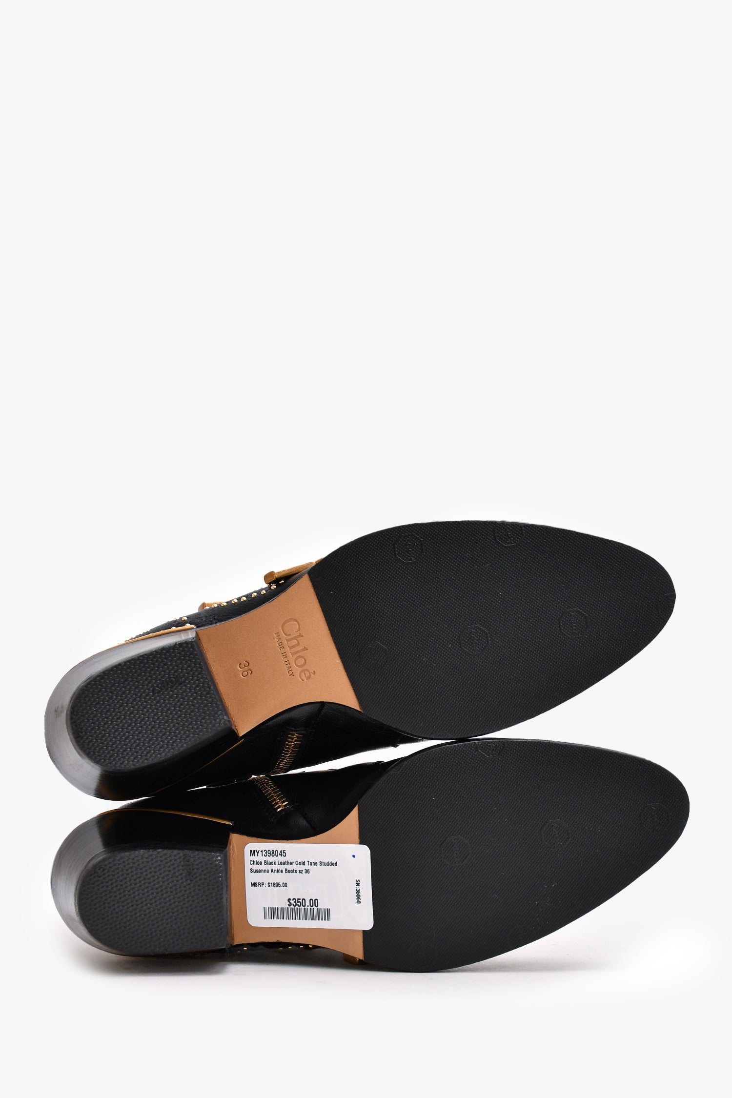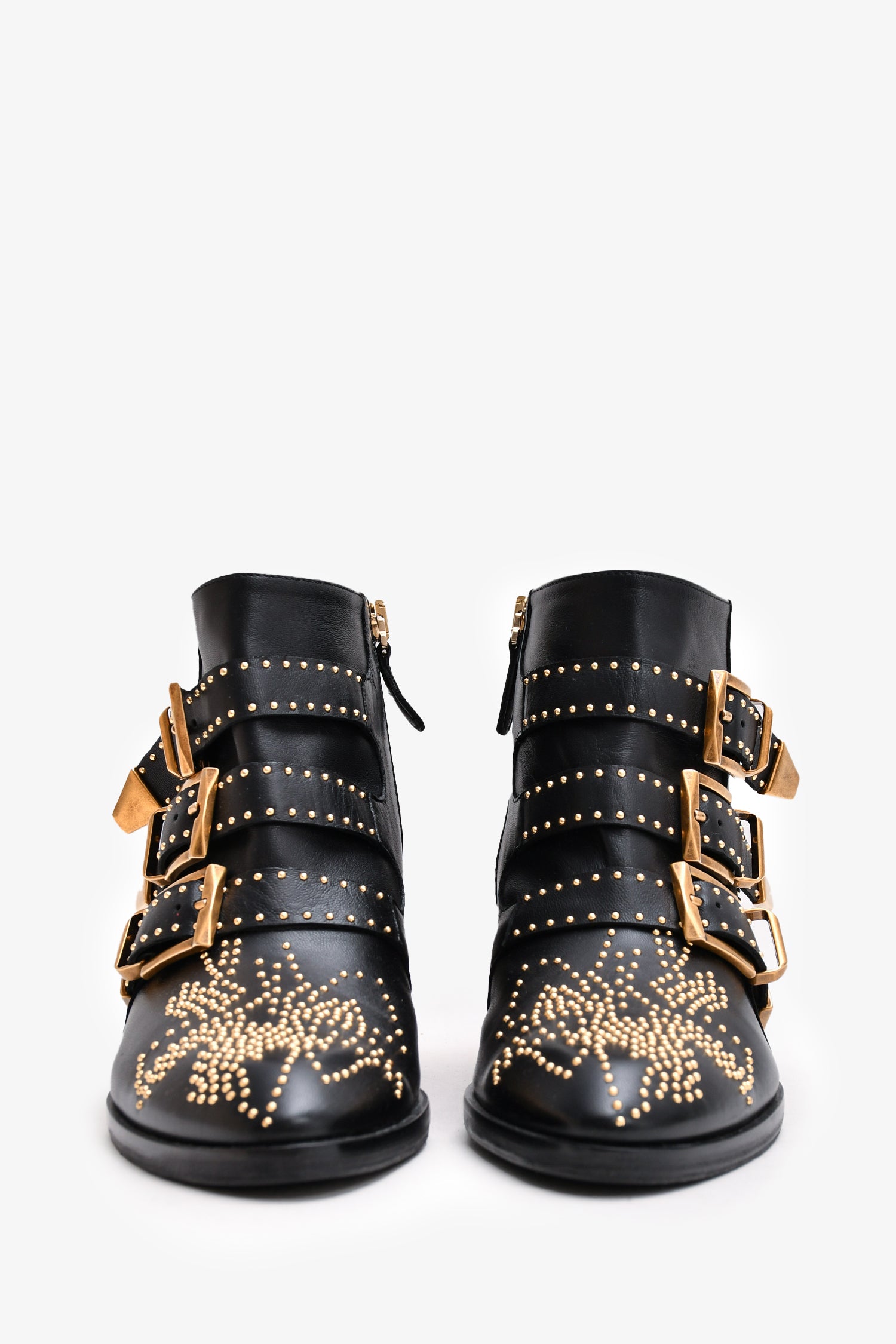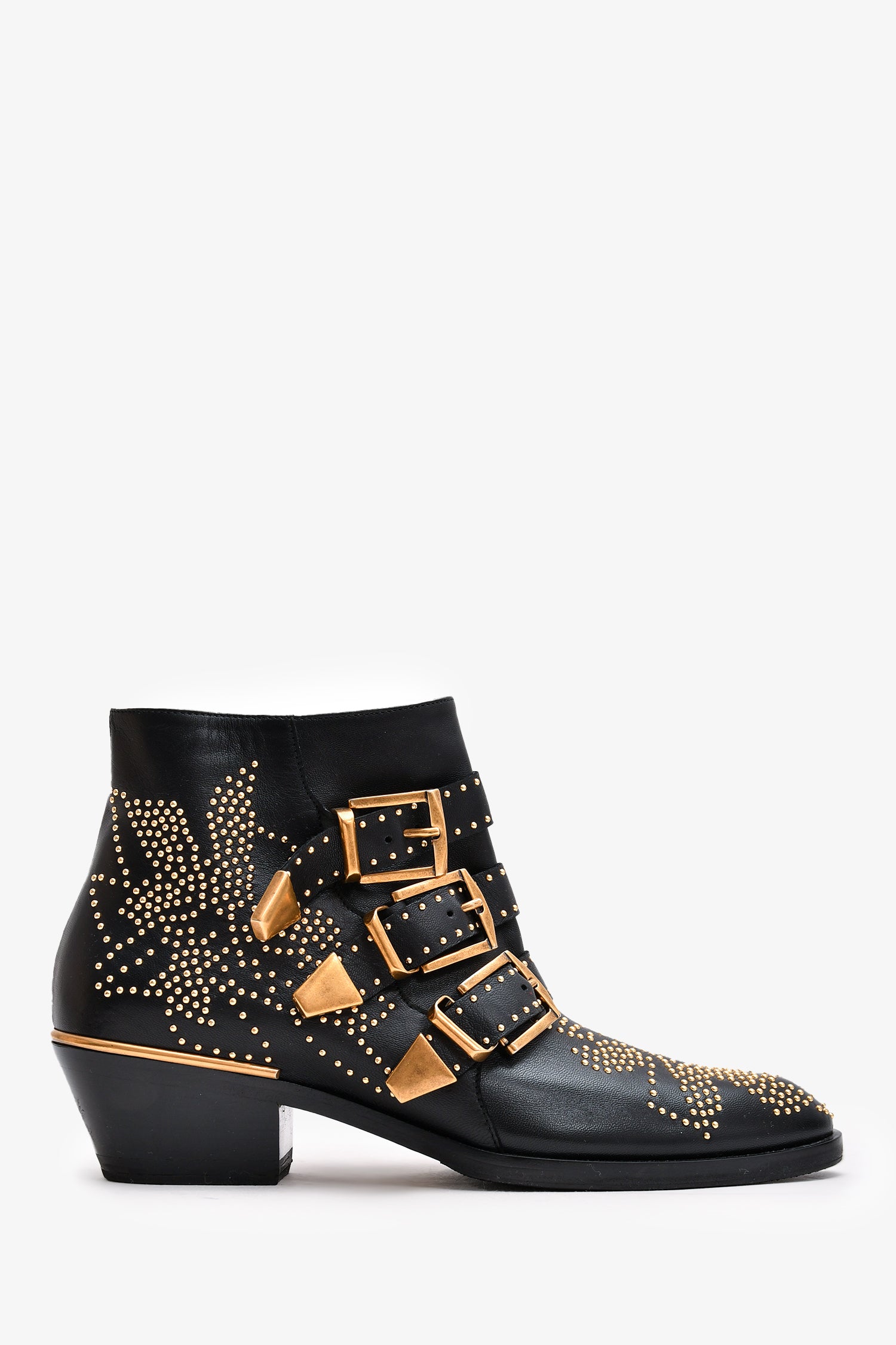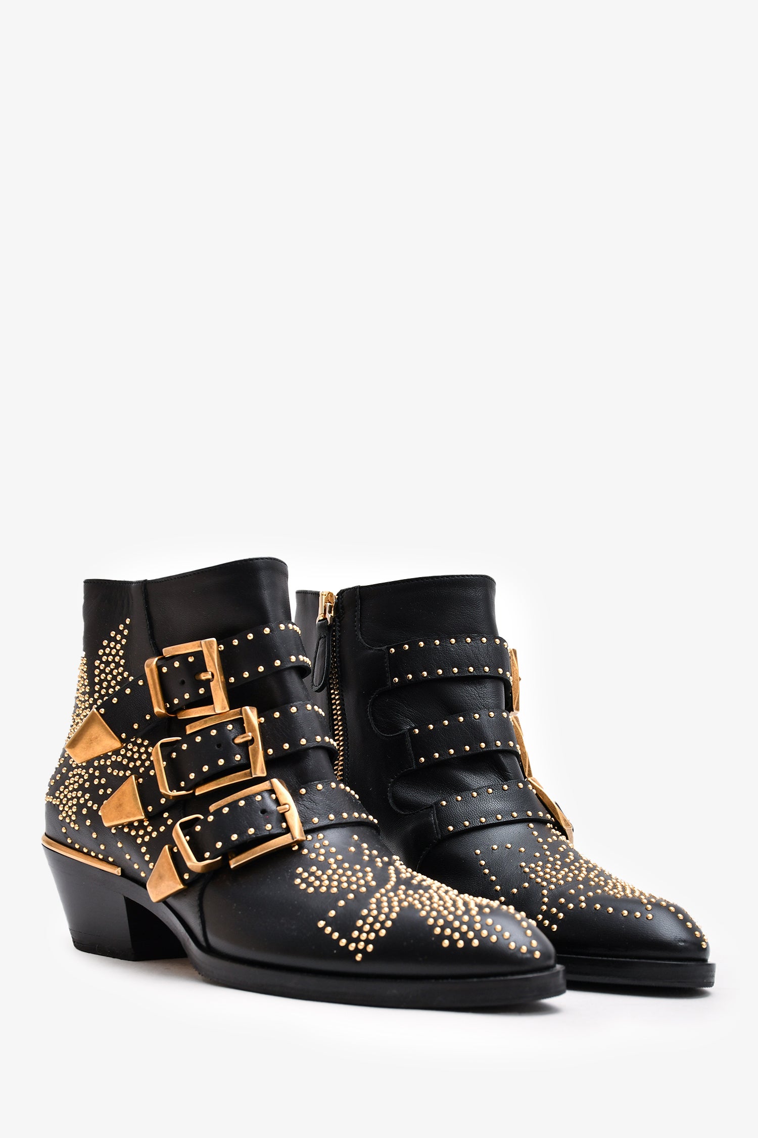Refresh availabilityChloe Black Leather Gold Tone Studded Susanna Ankle Boots. Pointed toe. Gold-tone hardware. Three buckle detailing on the front. Side zipper closure. Decorative studs throughout. Tonal stitching.