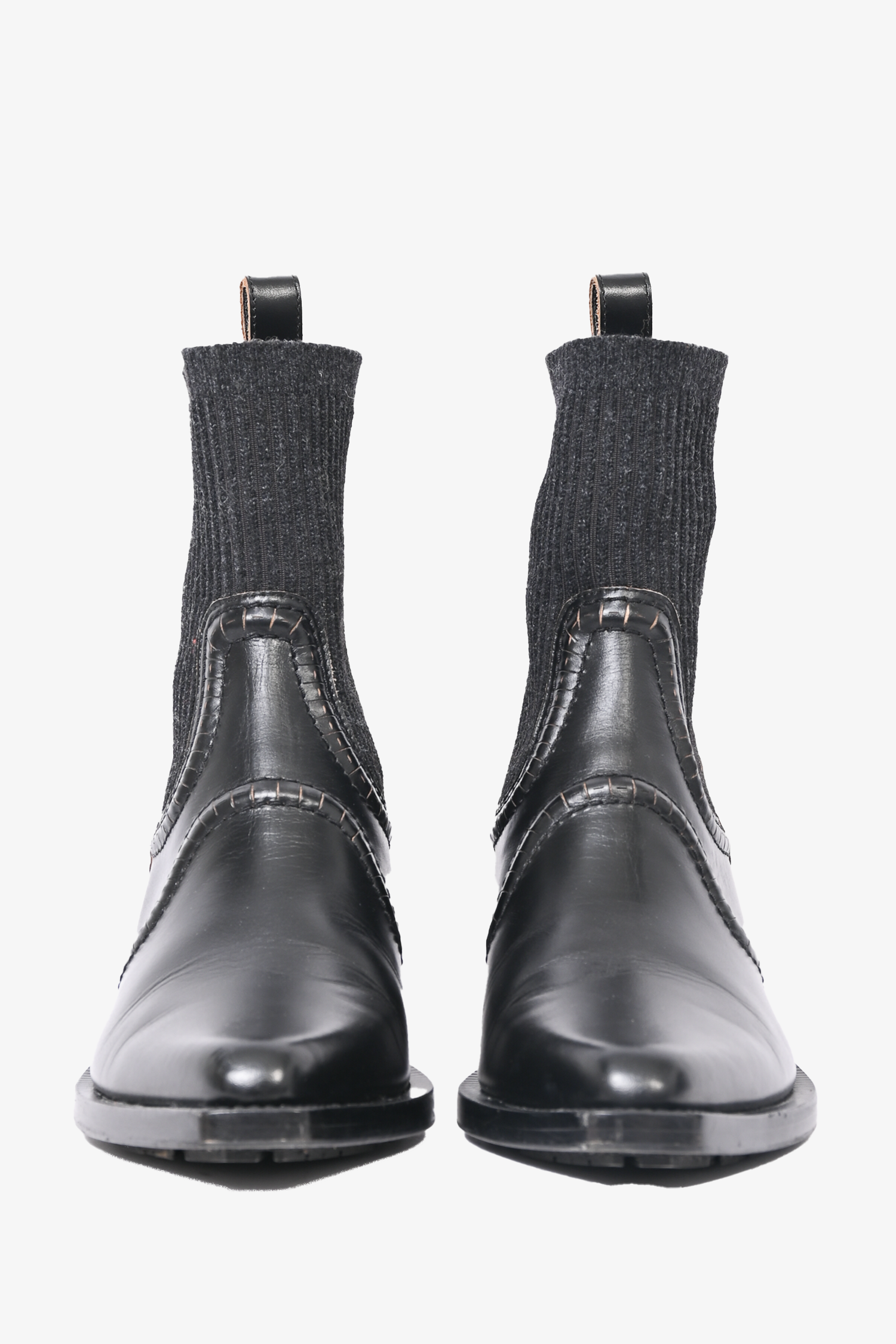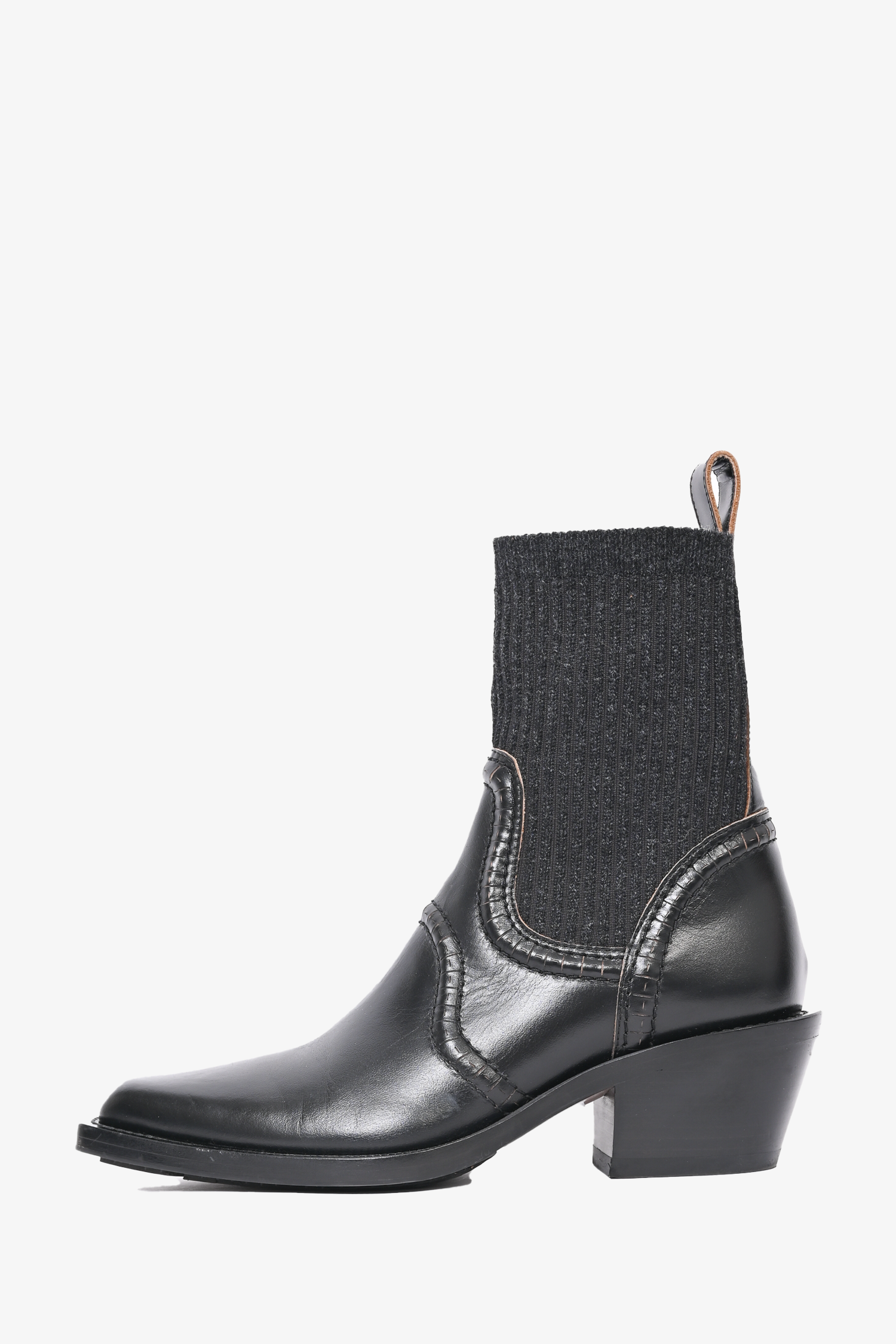 Chloe Black Leather 'Nellie Texan' Boots. Almond toe. Knitted hem. Back pull tab. Tonal stitching.