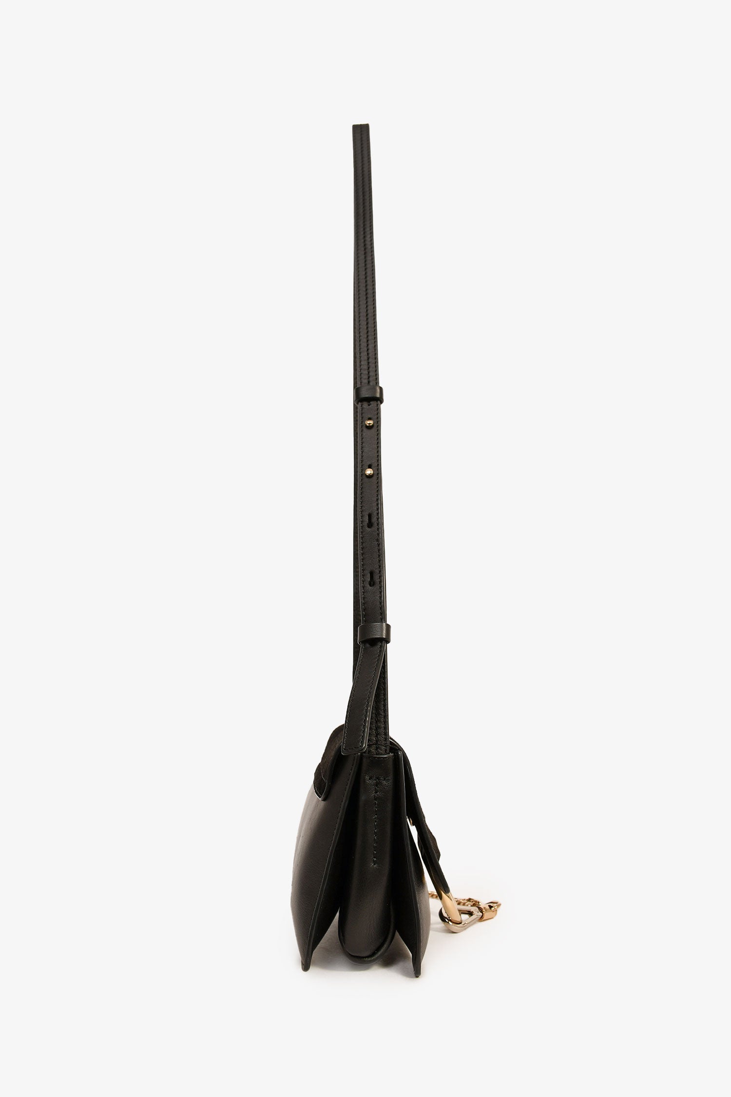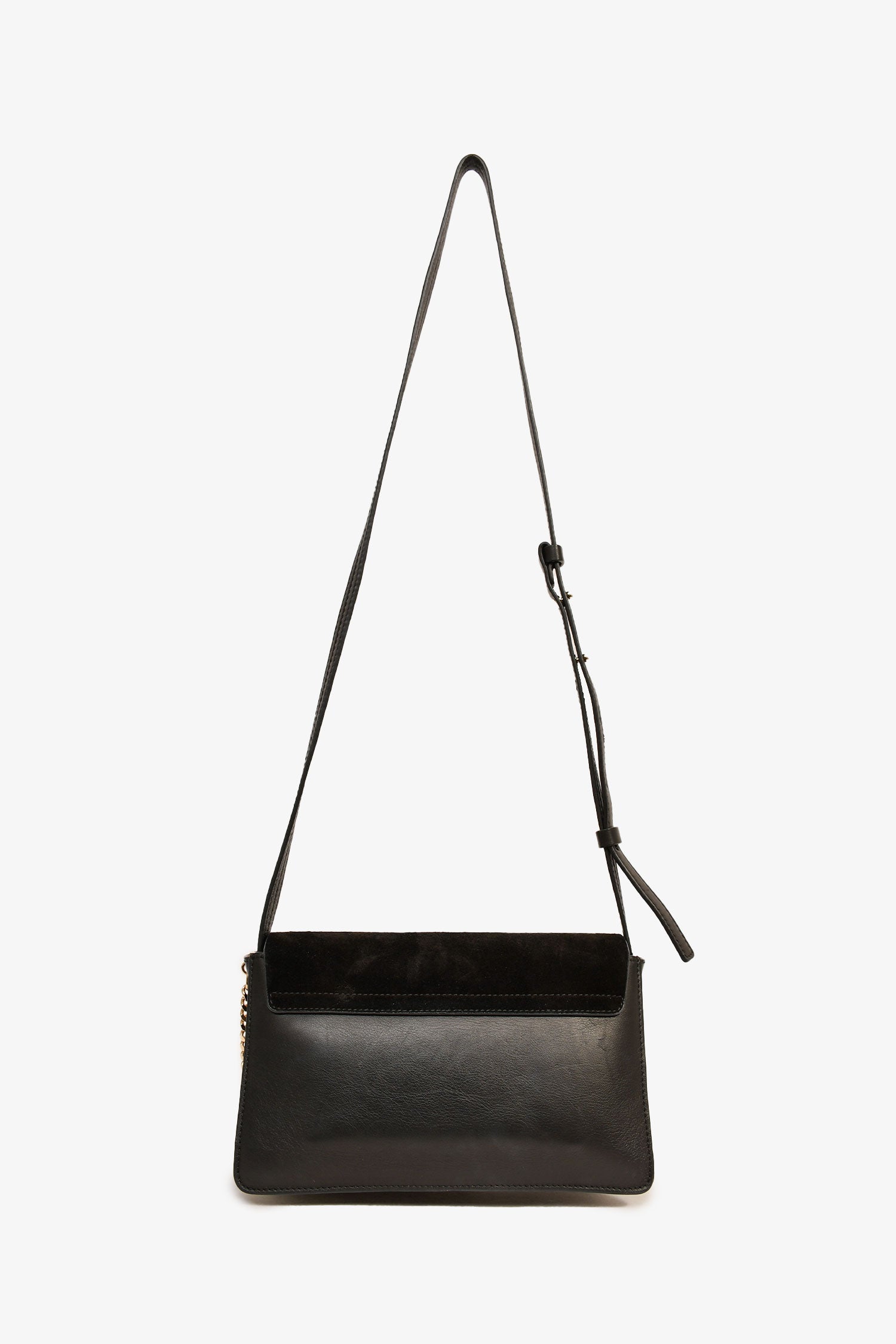 Refresh availabilityChloe Black Suede/Leather Small Faye Bag. Fold-over flap with a snap closure. Suede trimming. Gold-tone hardware. Chain-link strap. 3 suede-lined interior compartments with a single wall pocket. Leather crossbody strap. Tonal stitching.