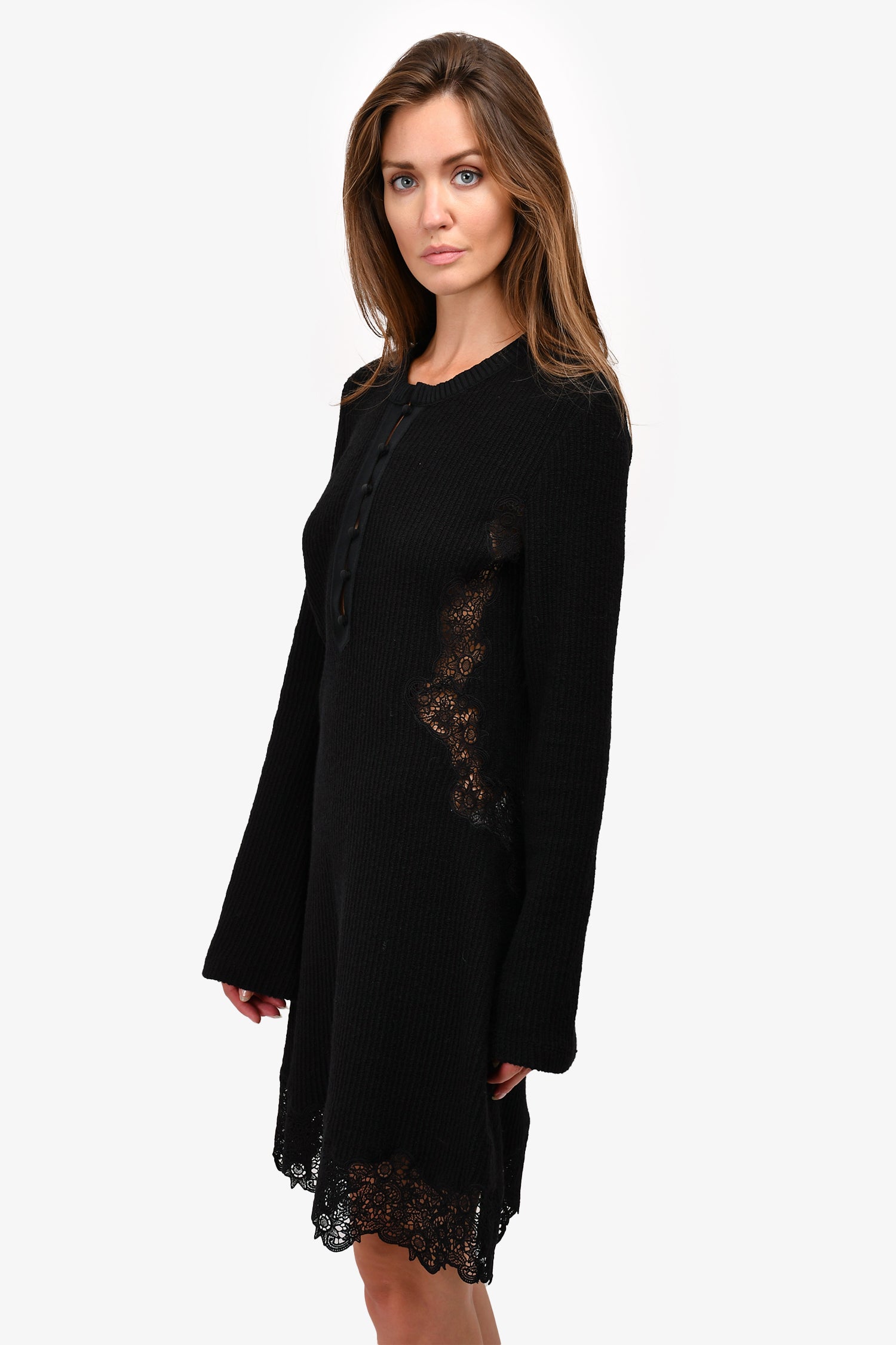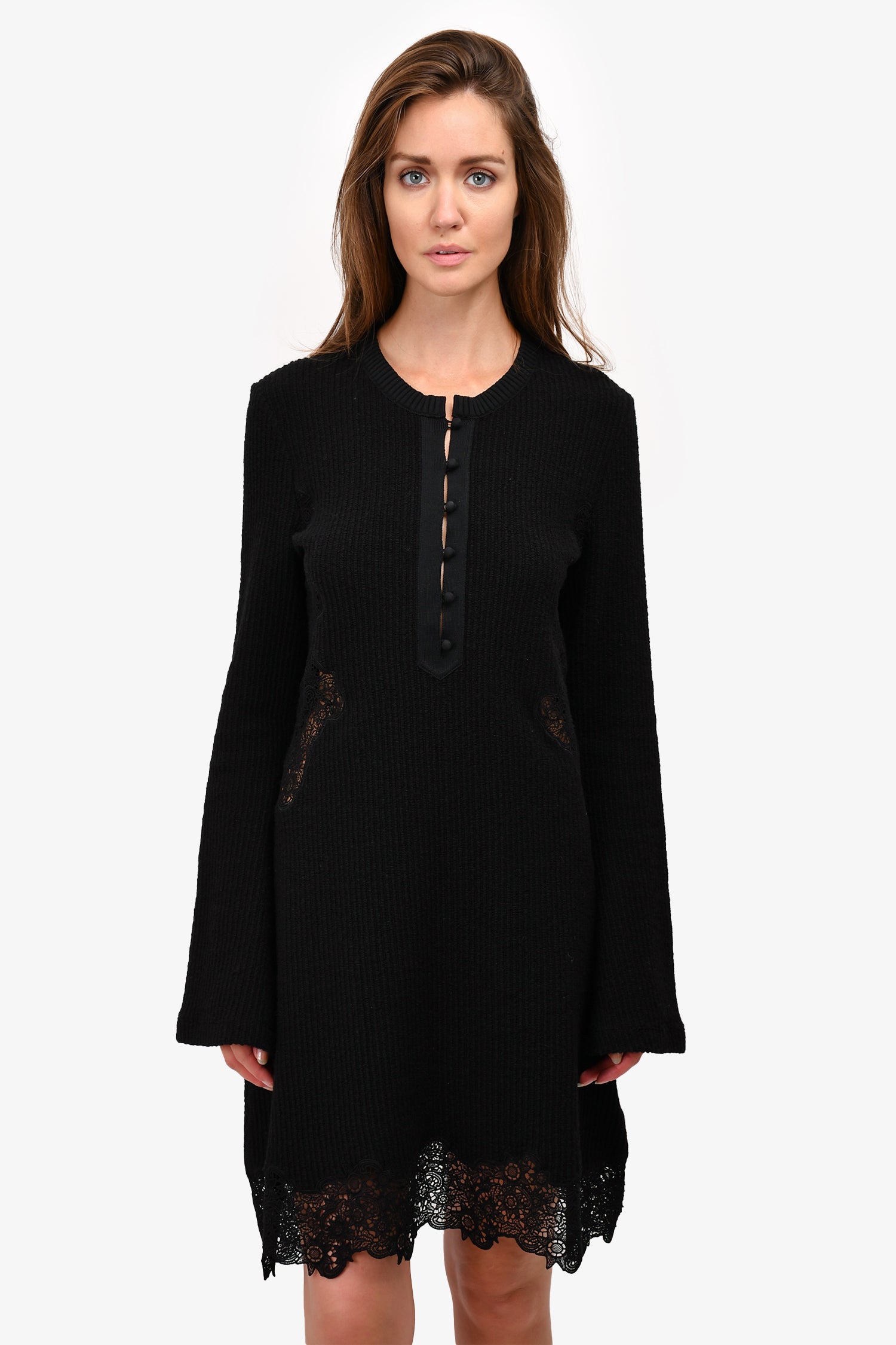 Refresh availabilityChloe Black Virgin Wool Knit Dress with Eyelet Lace Trim.