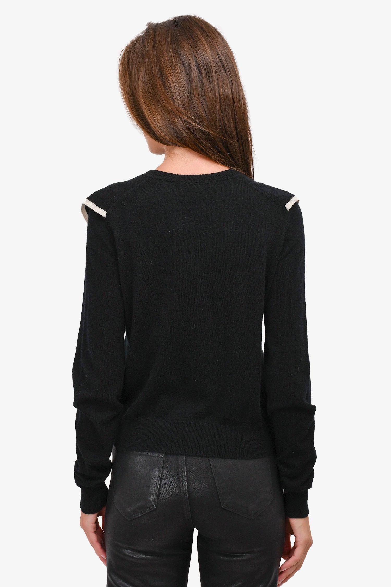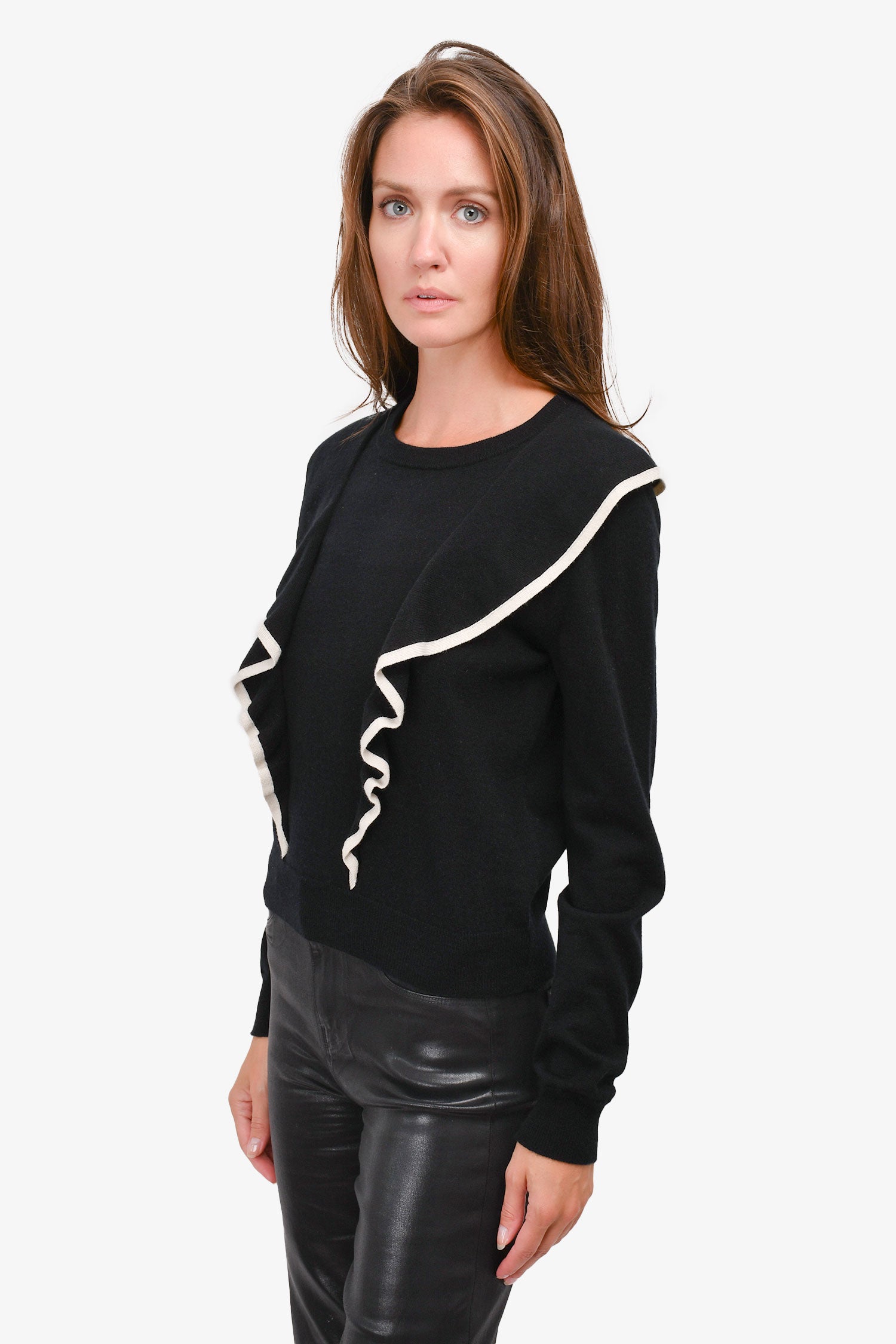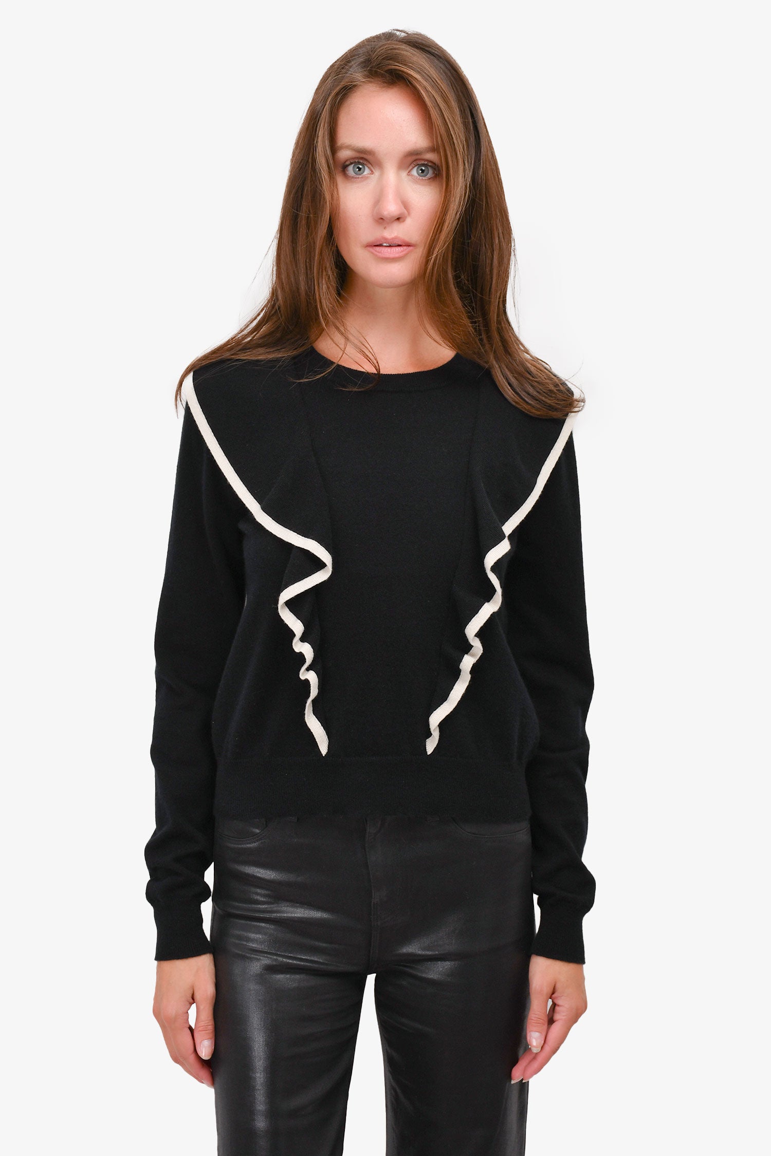 Refresh availabilityChloe Black/White Trim Cashmere/Cotton Ruffle Sweater. Round neck. Pull-on.