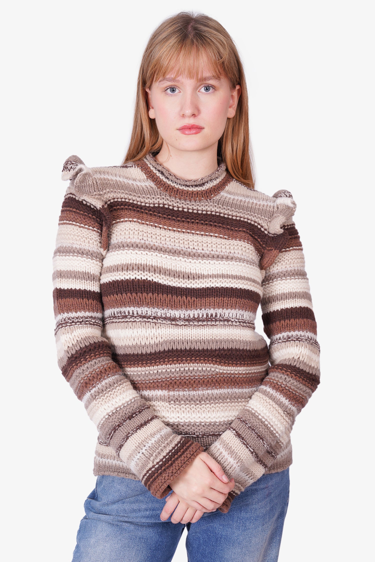 Refresh availabilityChloé Brown/Cream Cashmere Striped Knit with Ruffles. Round neck. Tonal stitching.