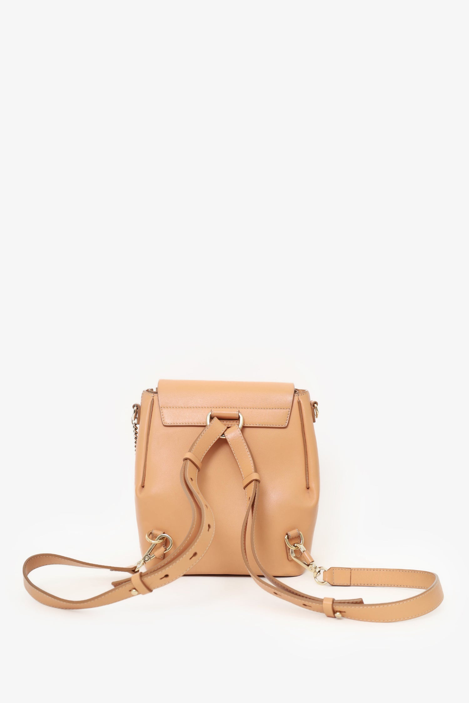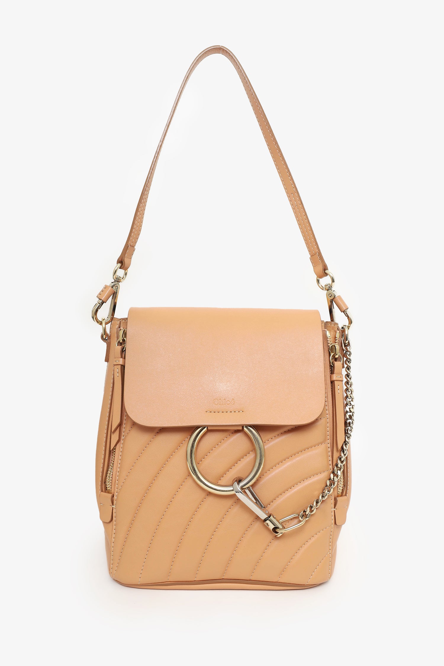 Refresh availabilityChloe Brown Leather Quilted Faye Backpack. Front fold-over flap with magnetic button closure. 2 front zipper extension. Interior wall zip pocket. Removable shoulder strap. Removable and adjustable backpack straps. Gold-tone hardware. Contrast stitching.