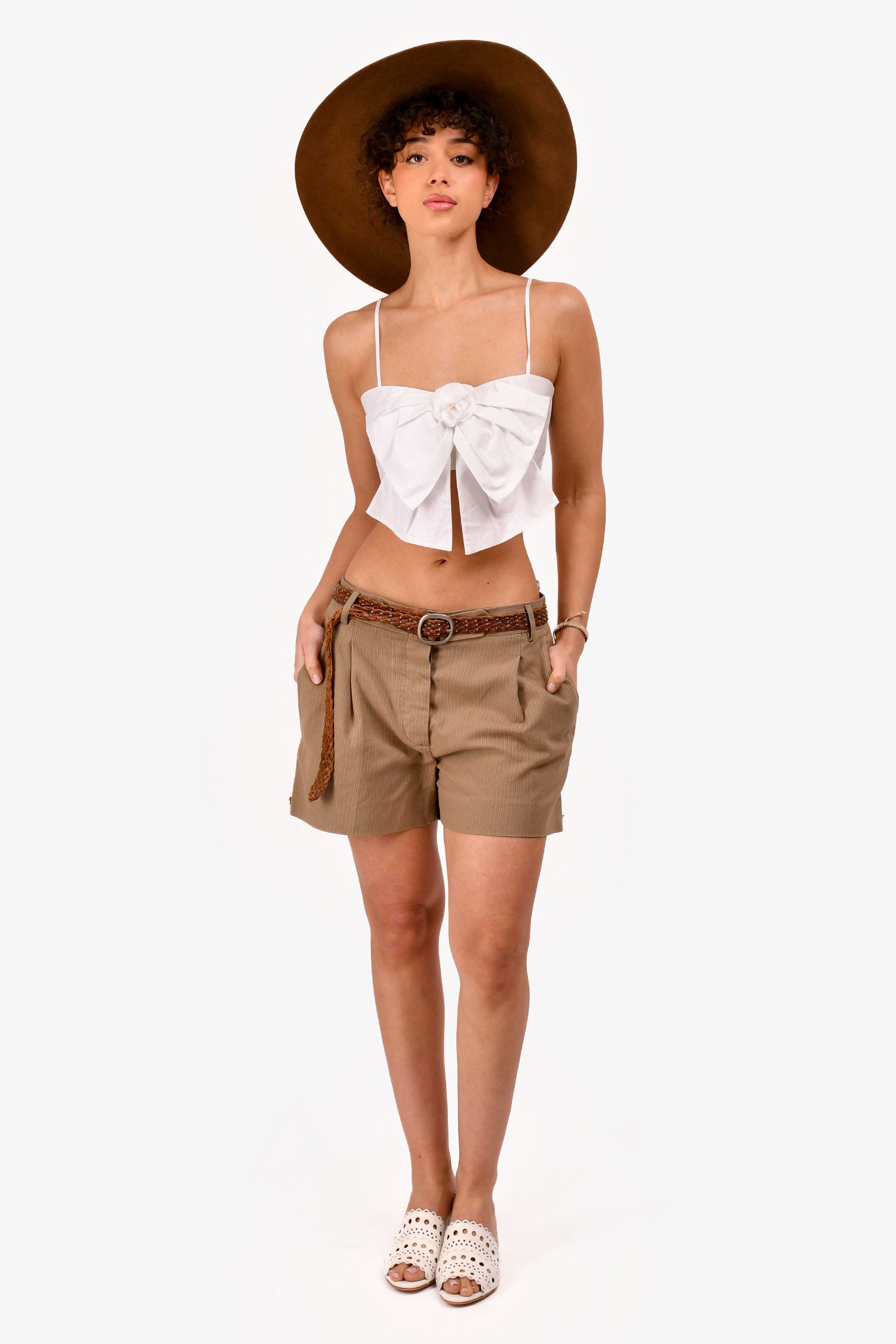 Refresh availabilityChloe Brown Pinstripe Shorts. Front button closure. 2 side slip pockets. Single rear slip pocket. Belt loops around waist. Unlined. Gold-toned hardware. Tonal stitching.