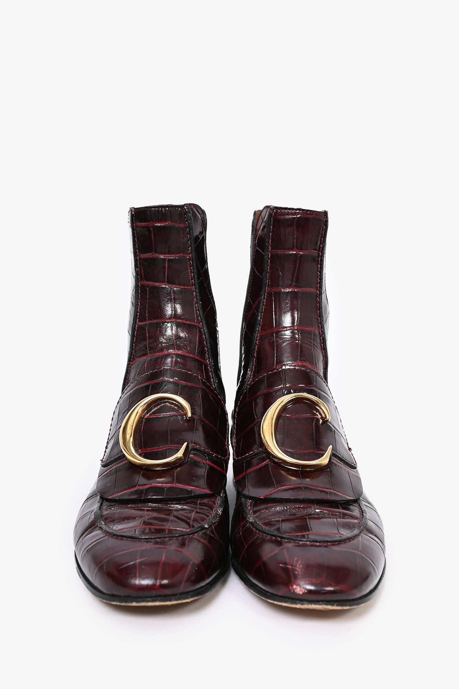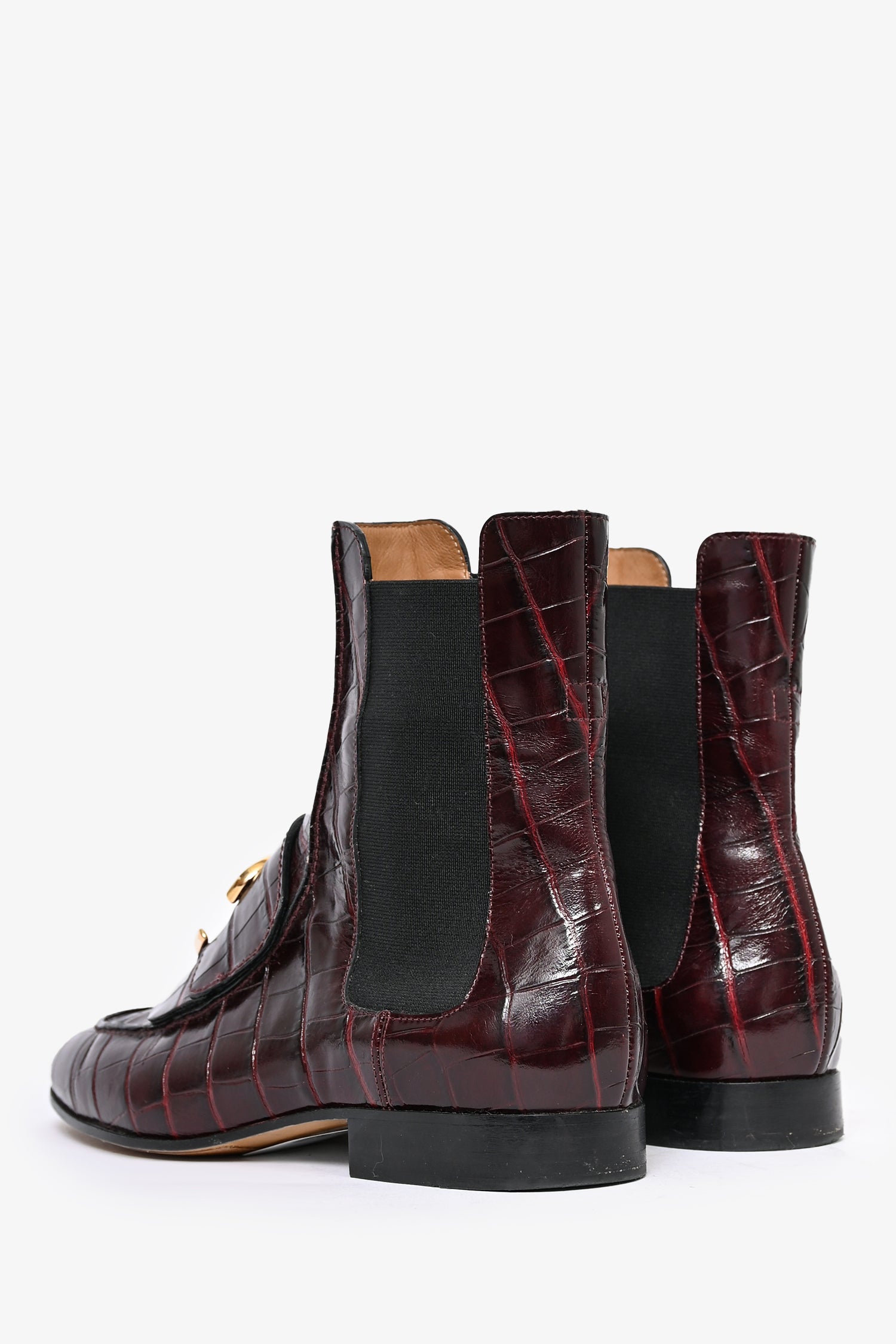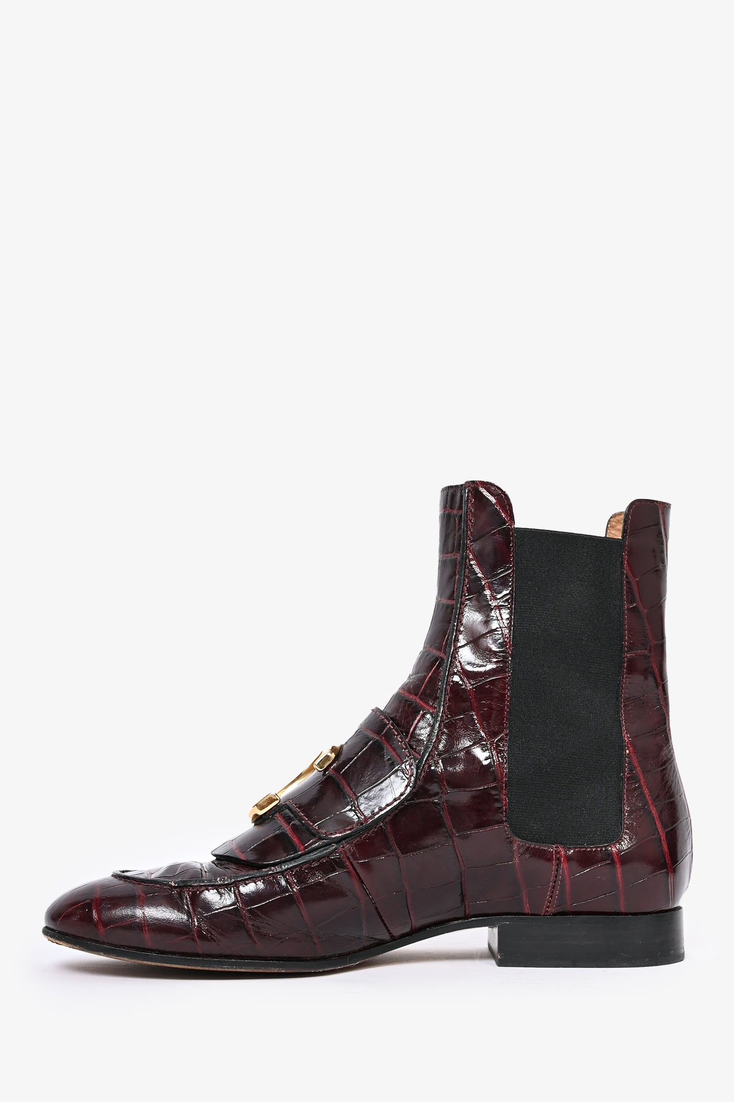 Chloe Burgundy Croc Embossed Leather Chelsea Boots Size 36
