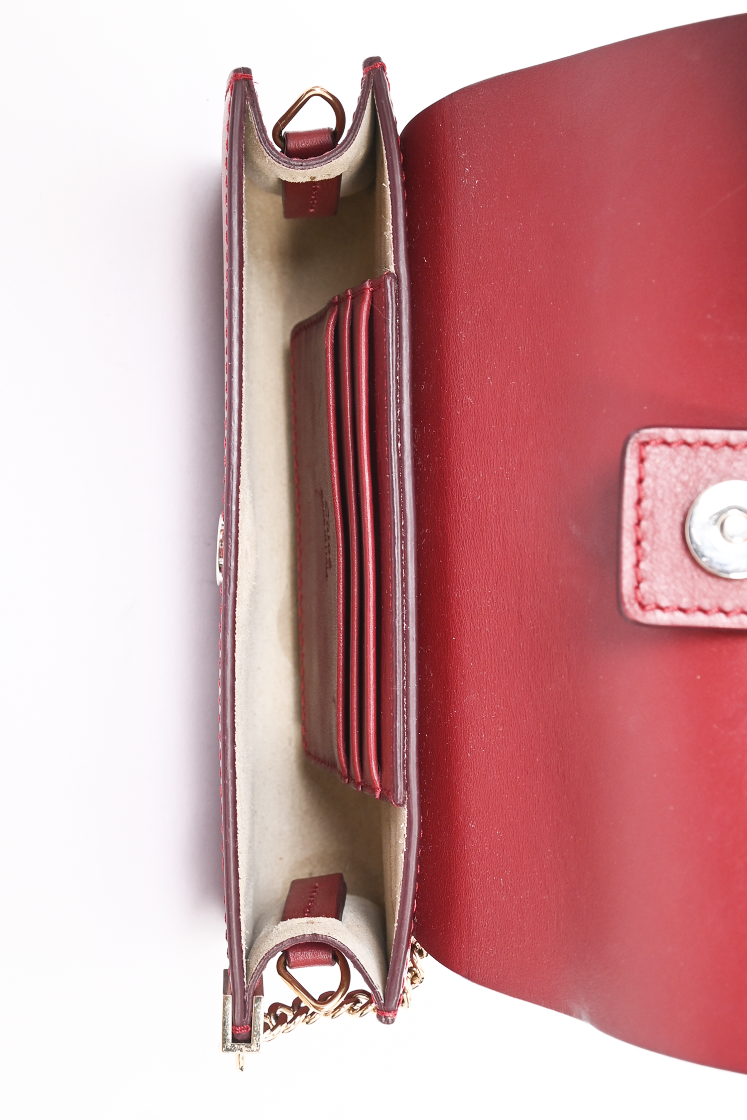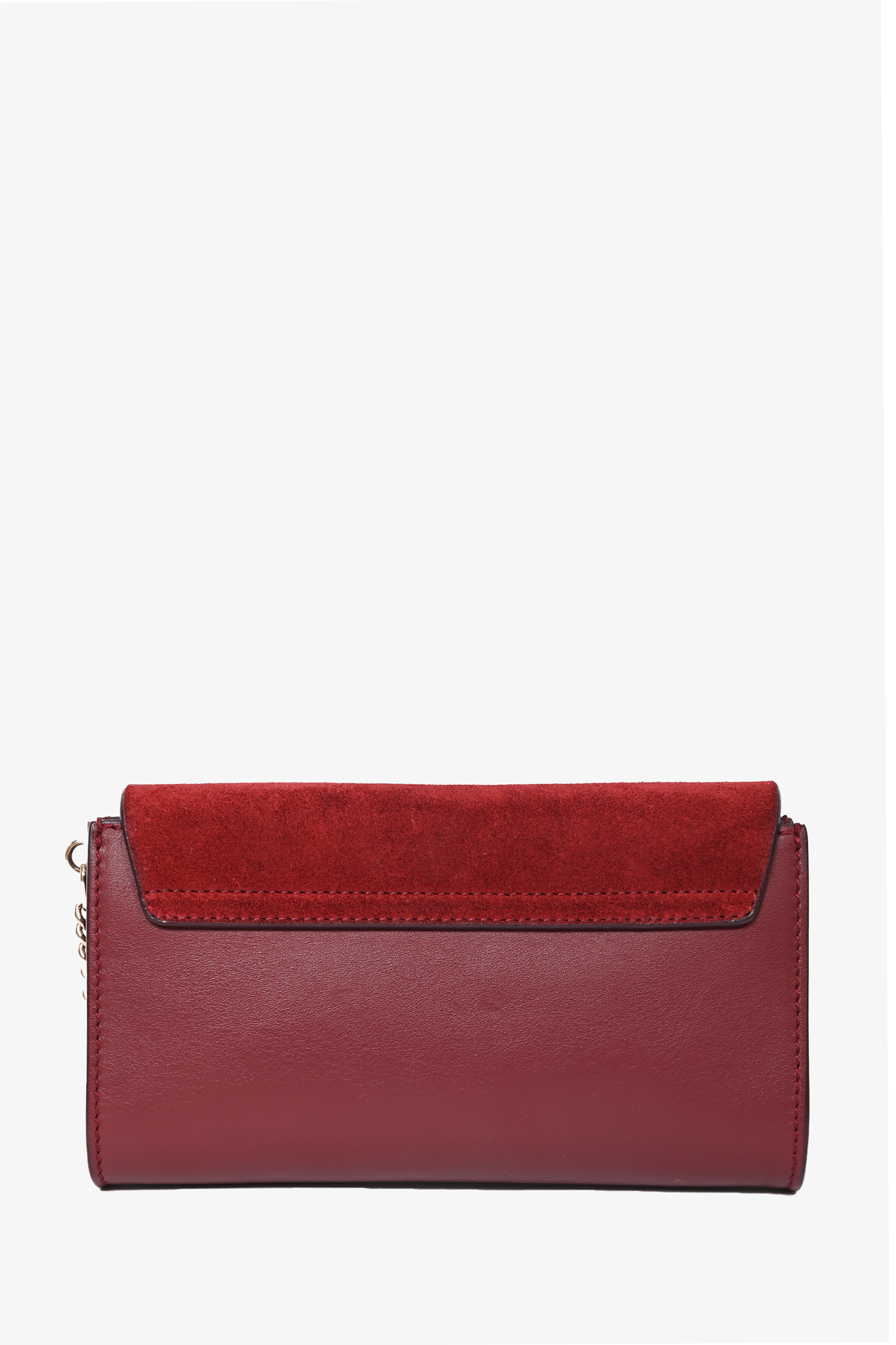 Chloe Burgundy Leather Faye Mini Crossbody Bag. Fold over flap with magnetic button closure. 3 interior card slip pockets. Adjustable strap. Silver/Gold tone hardware. Tonal stitching.