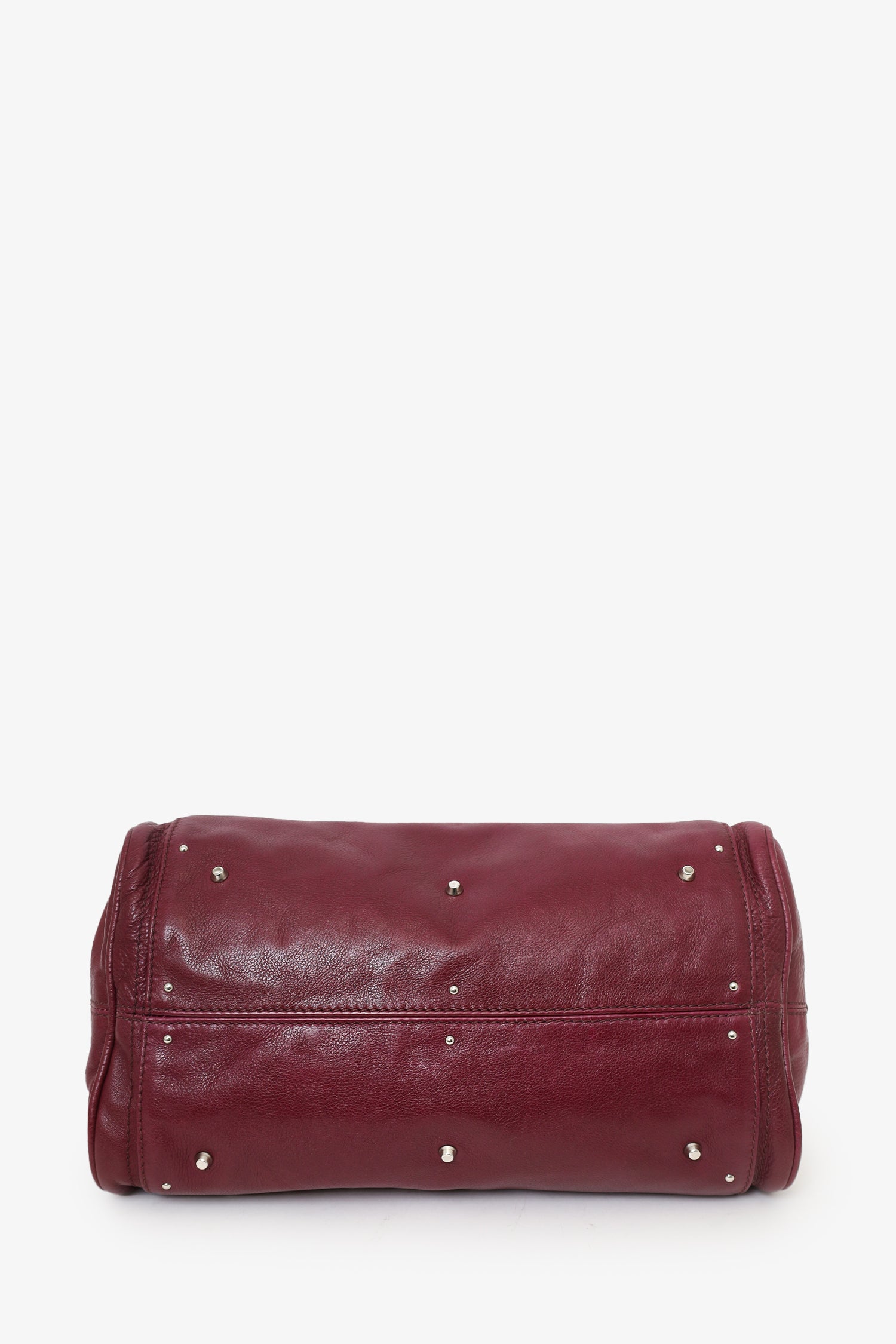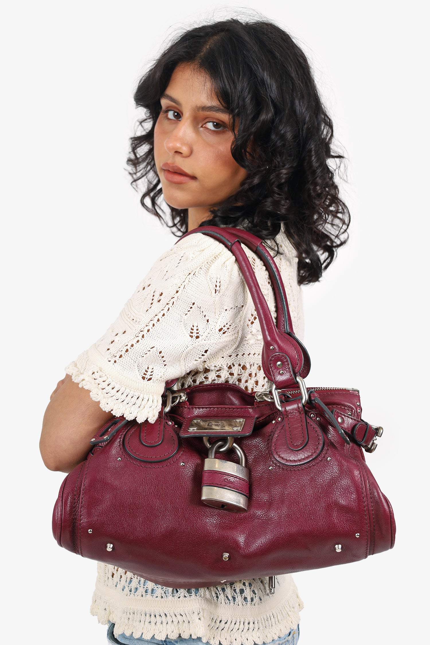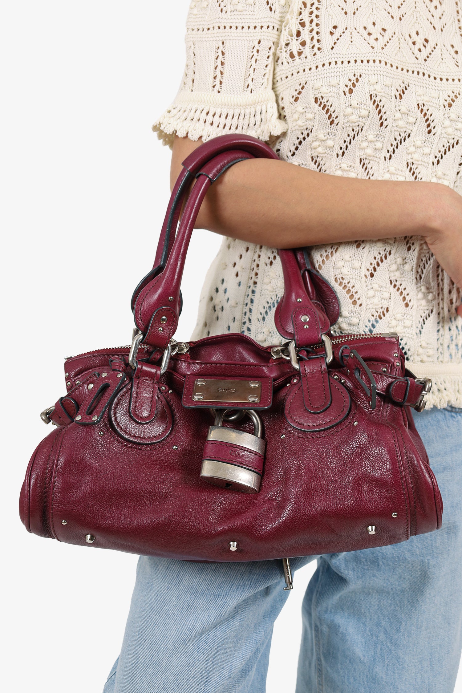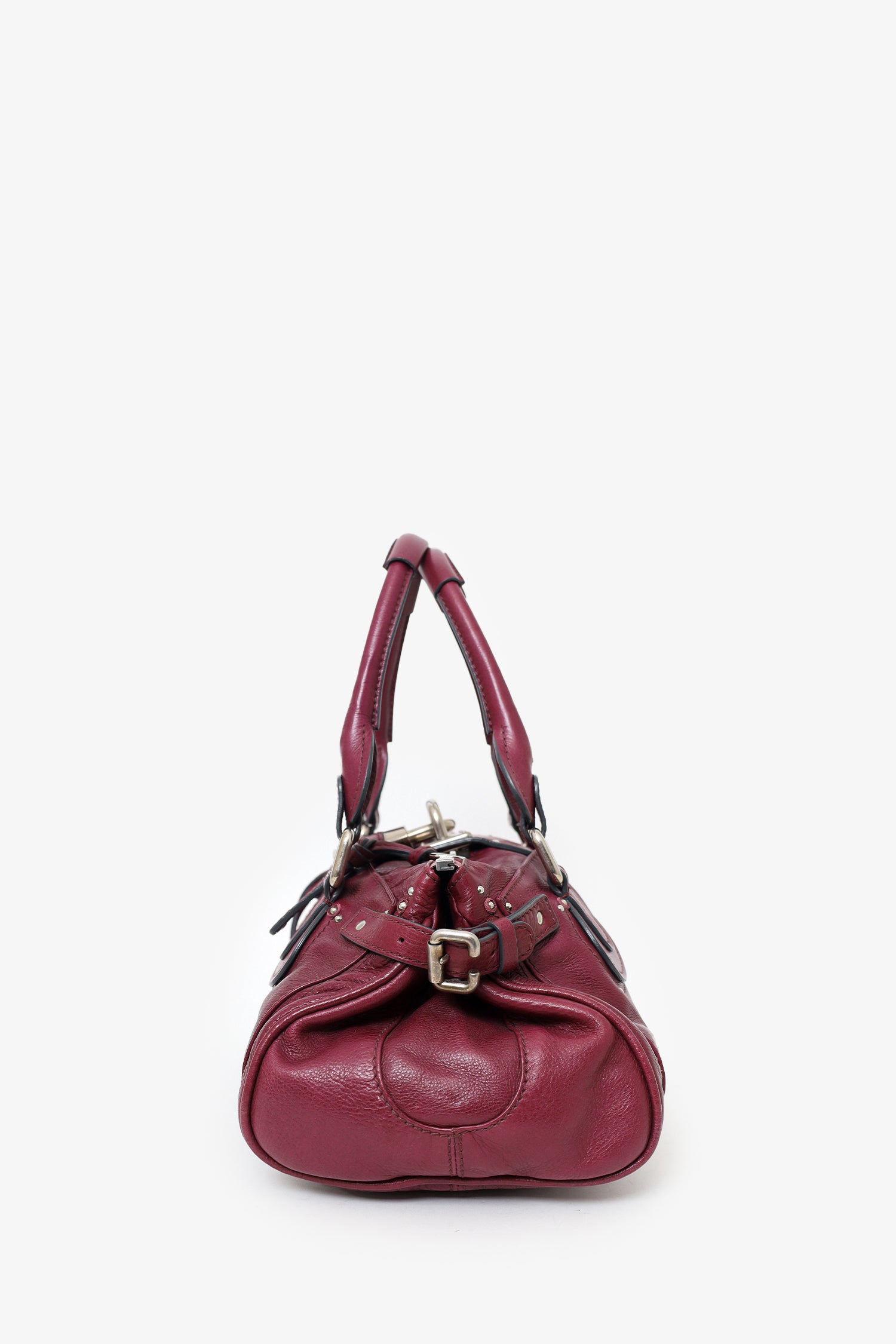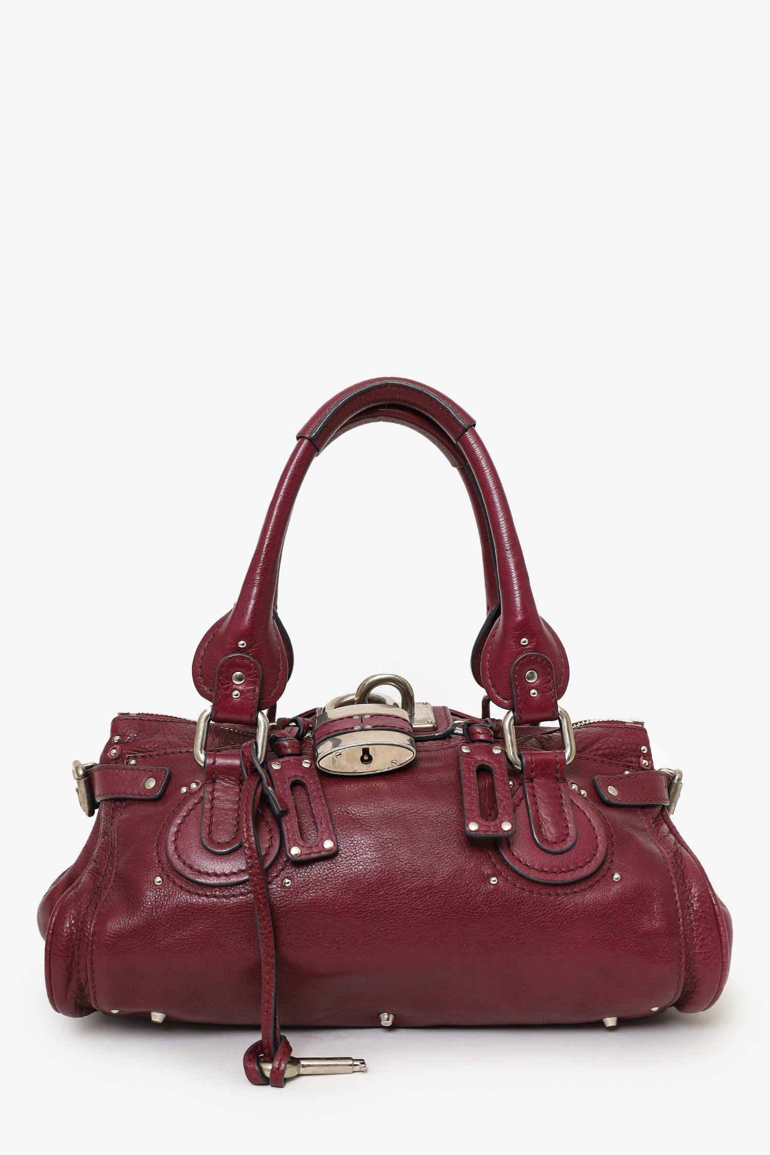 Chloe Burgundy Leather Medium Paddington Satchel. Top two-way zip closure with middle fold-over lock hardware. Twin handles. Adjustable straps on side exterior. Protective studs on bottom. Front and rear exterior slip pockets. Lined interior. 2 interior pockets; 1 slip and 1 zip. Includes removable key charm for lock. Silver-tone hardware. Tonal stitching.