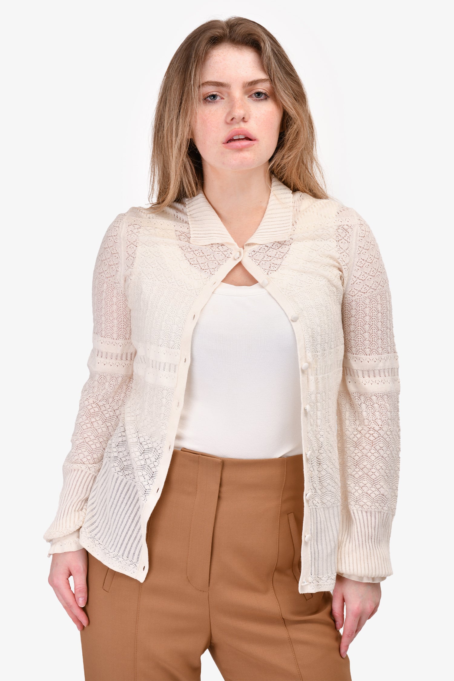 Refresh availabilityChloe Cream Crochet Knit Button-Up Sweater. Front button-up closure. Ribbed neck, cuffs and hem. Tonal stitching.