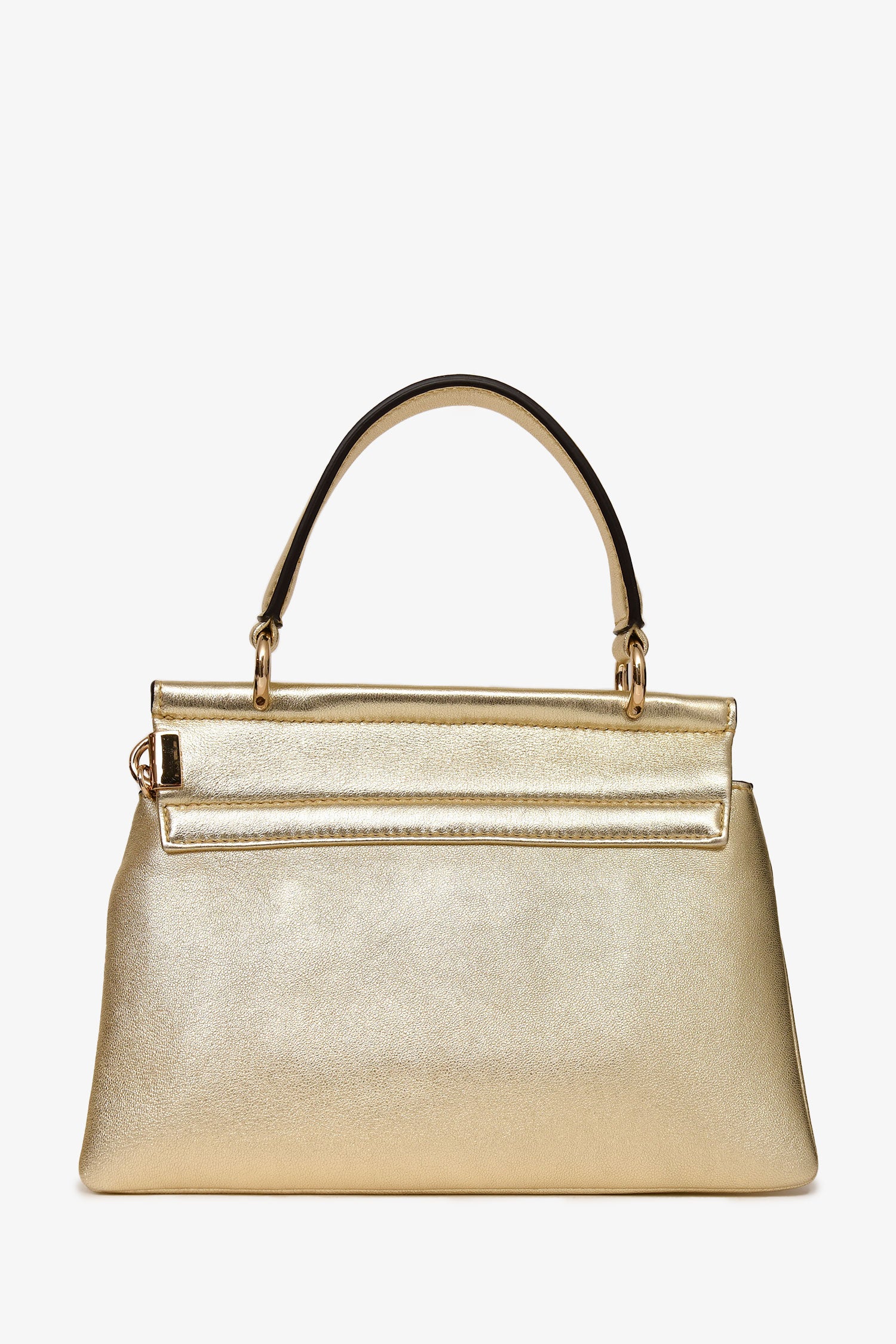 Refresh availabilityChloe Gold Leather Top Handle Small Faye Crossbody. Signature Faye ring and chain detail at the front. Top handle and detachable, adjustable crossbody strap. Fold-over flap with magnetic snap closure. Suede-lined interior with one main compartment and a slip pocket. Gold-tone hardware. Tonal stitching.