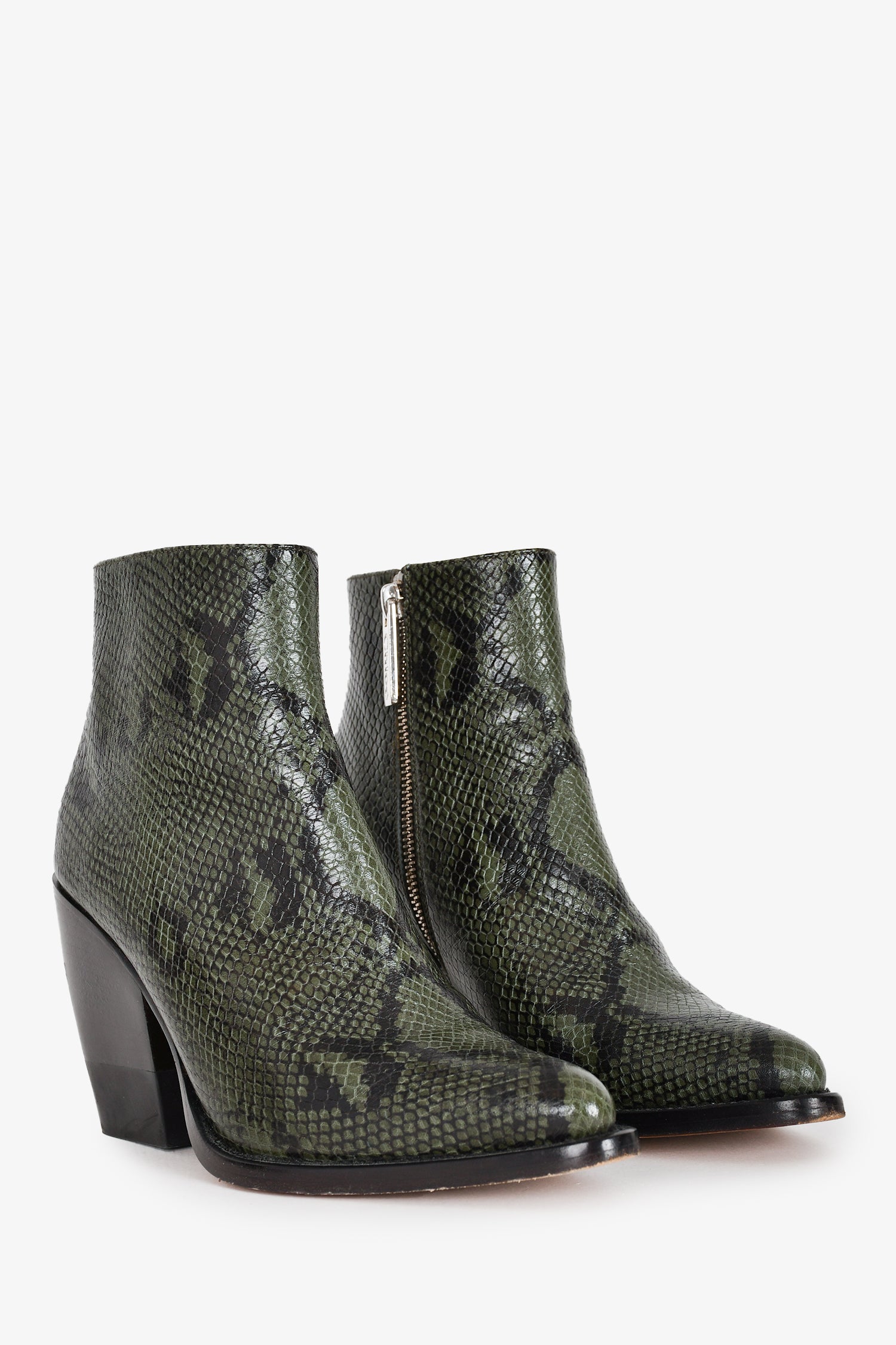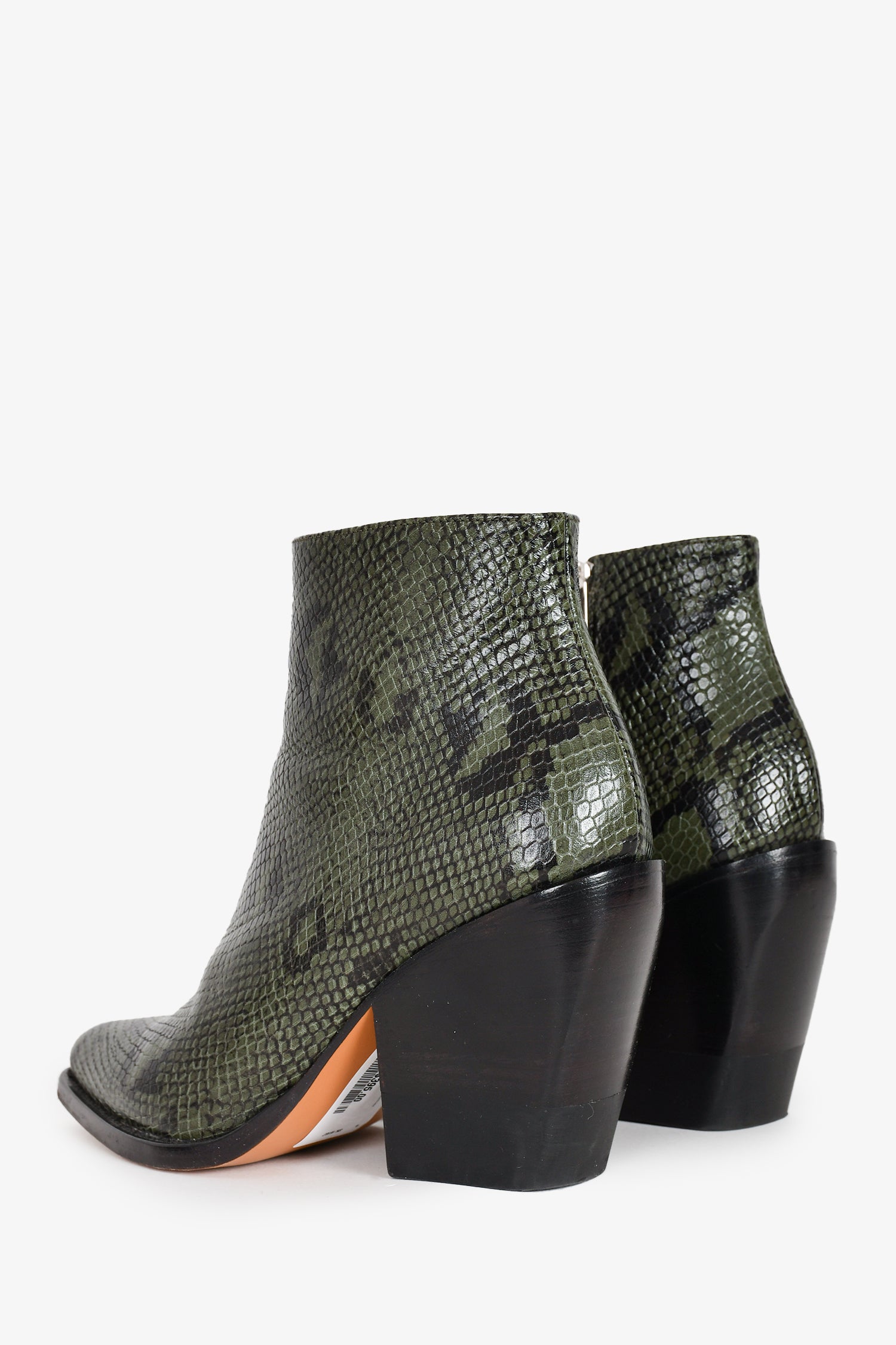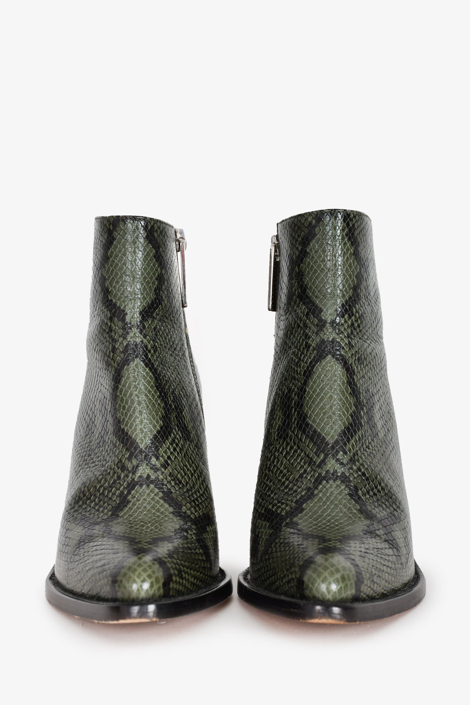 Refresh availabilityChloe Green/Black Snakeskin Leather Heeled Boots. Pointed toe. Side zip closure. Stacked heel. Tonal stitching.