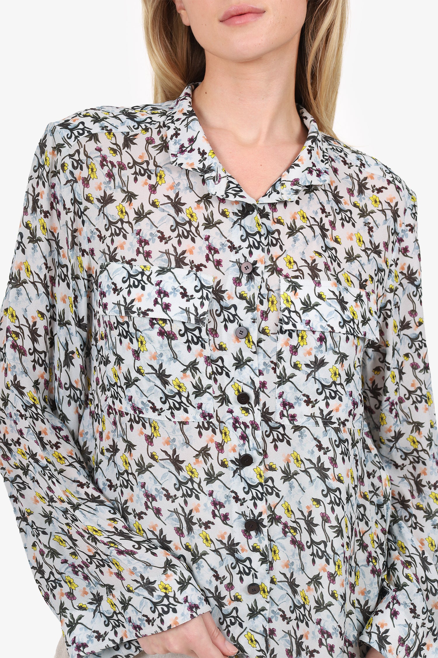 Refresh availabilityChloe Grey/Muiltcolour Floral Print Blouse. Pull-on. Collared neckline. Front button-up closure. 2 front exterior flap pocket pockets. Tonal stitching.