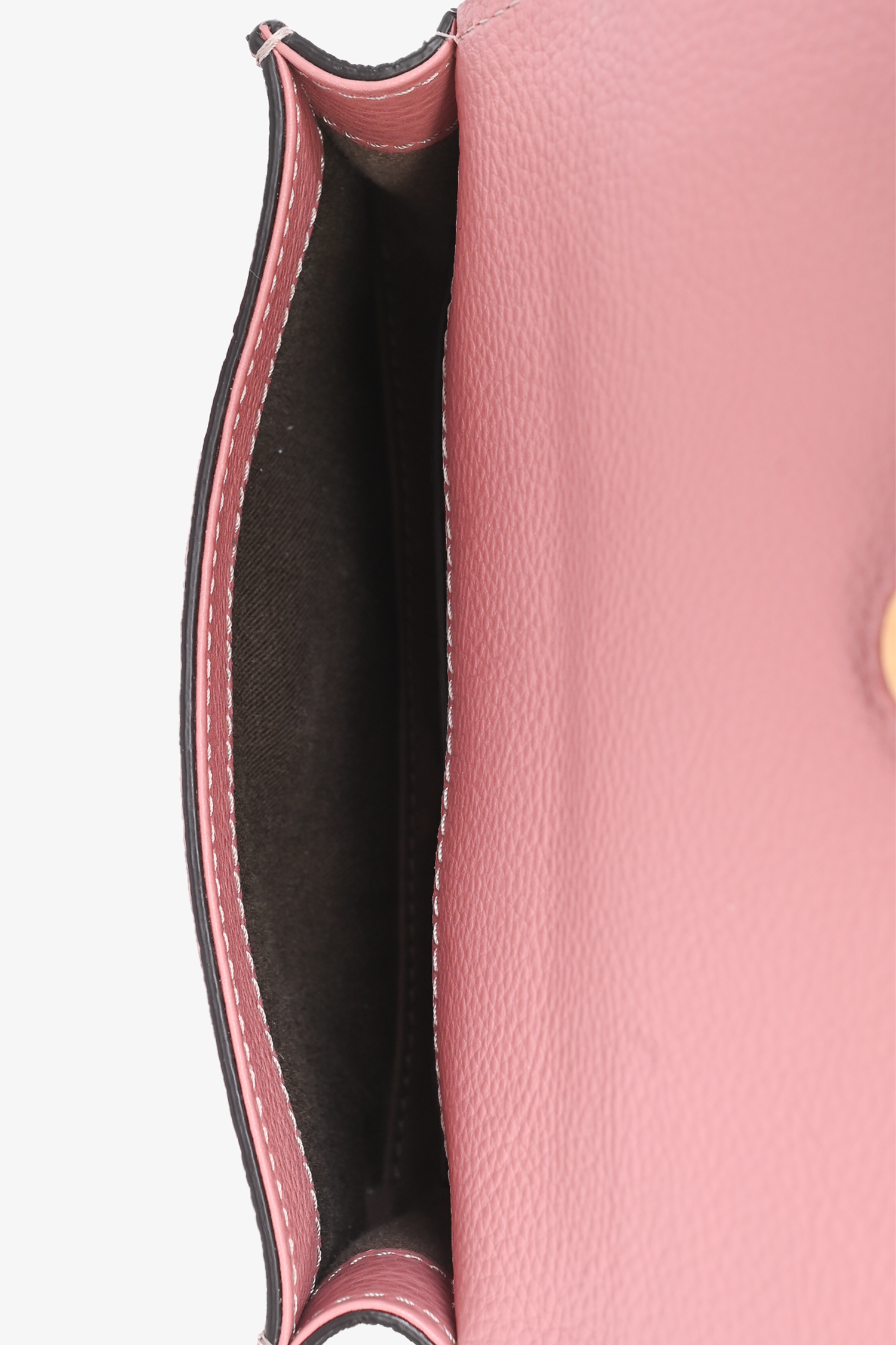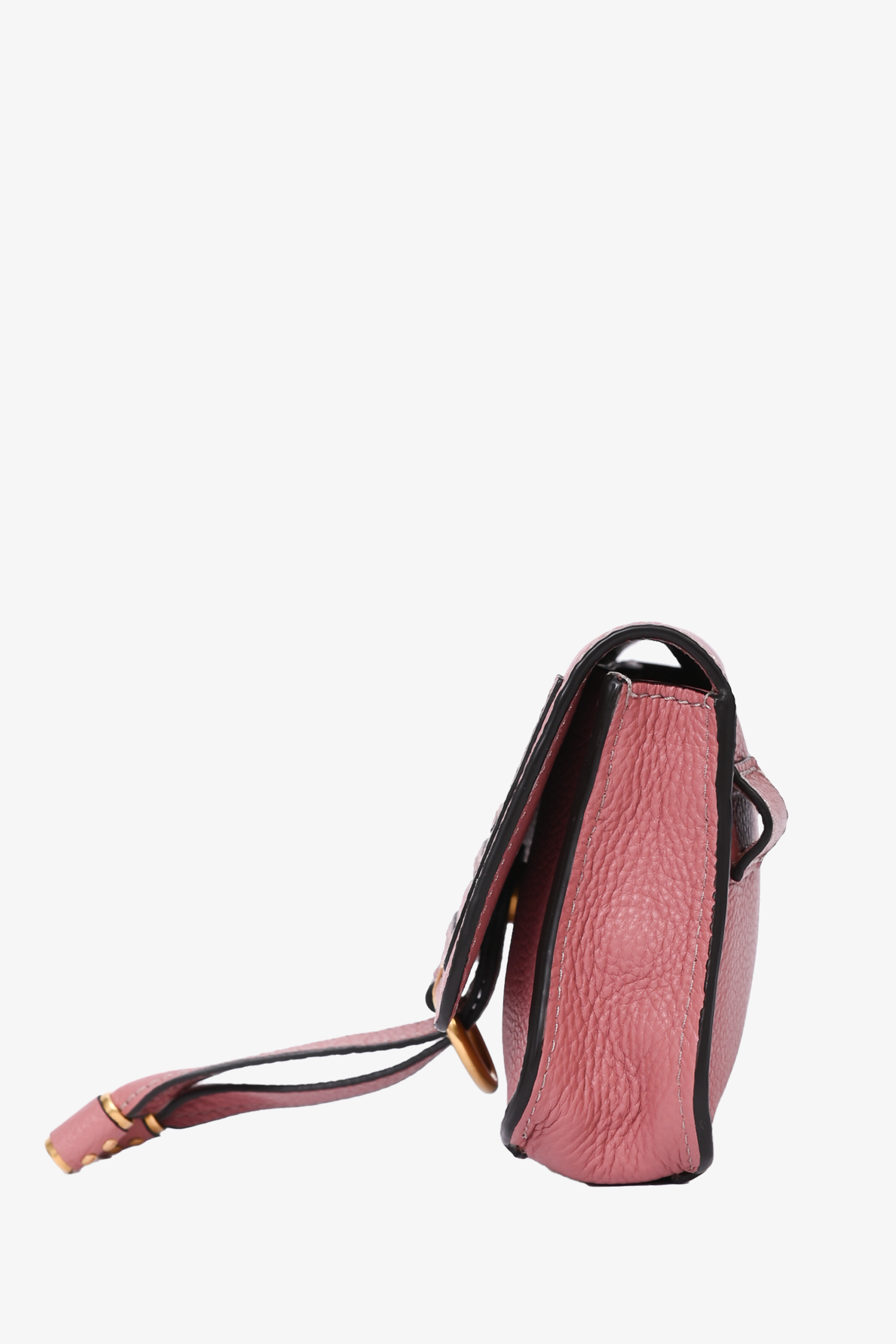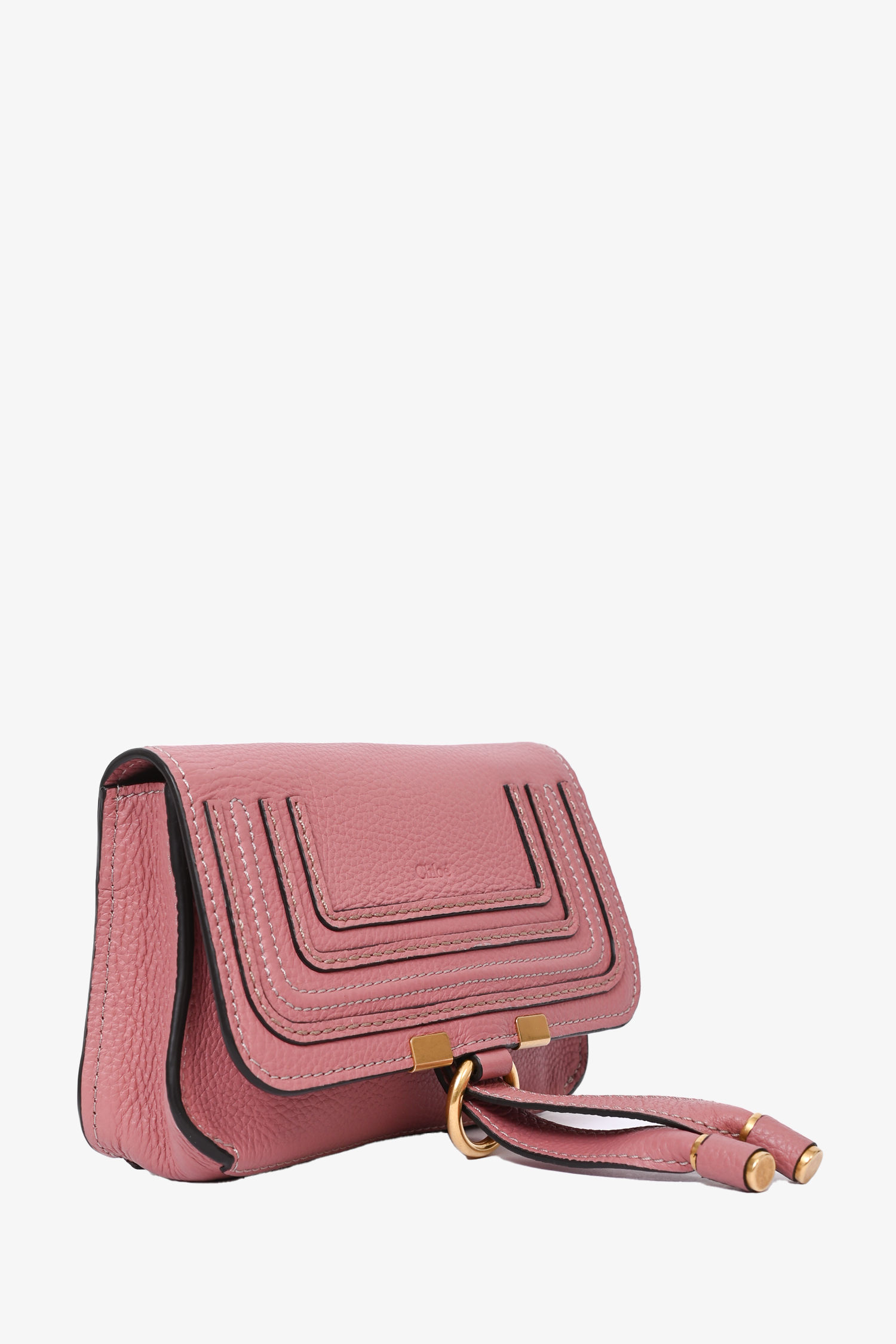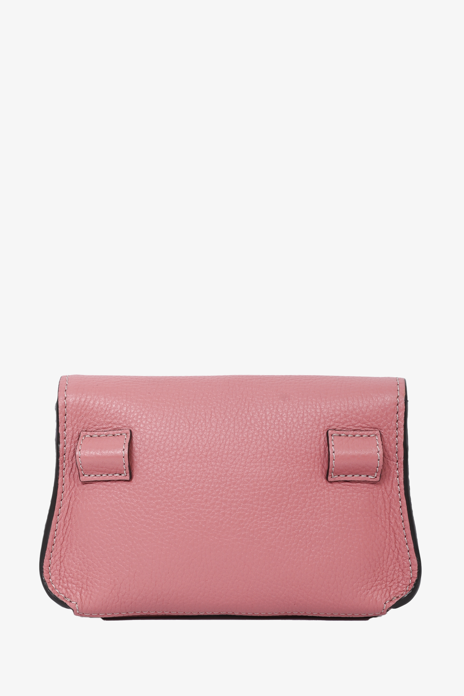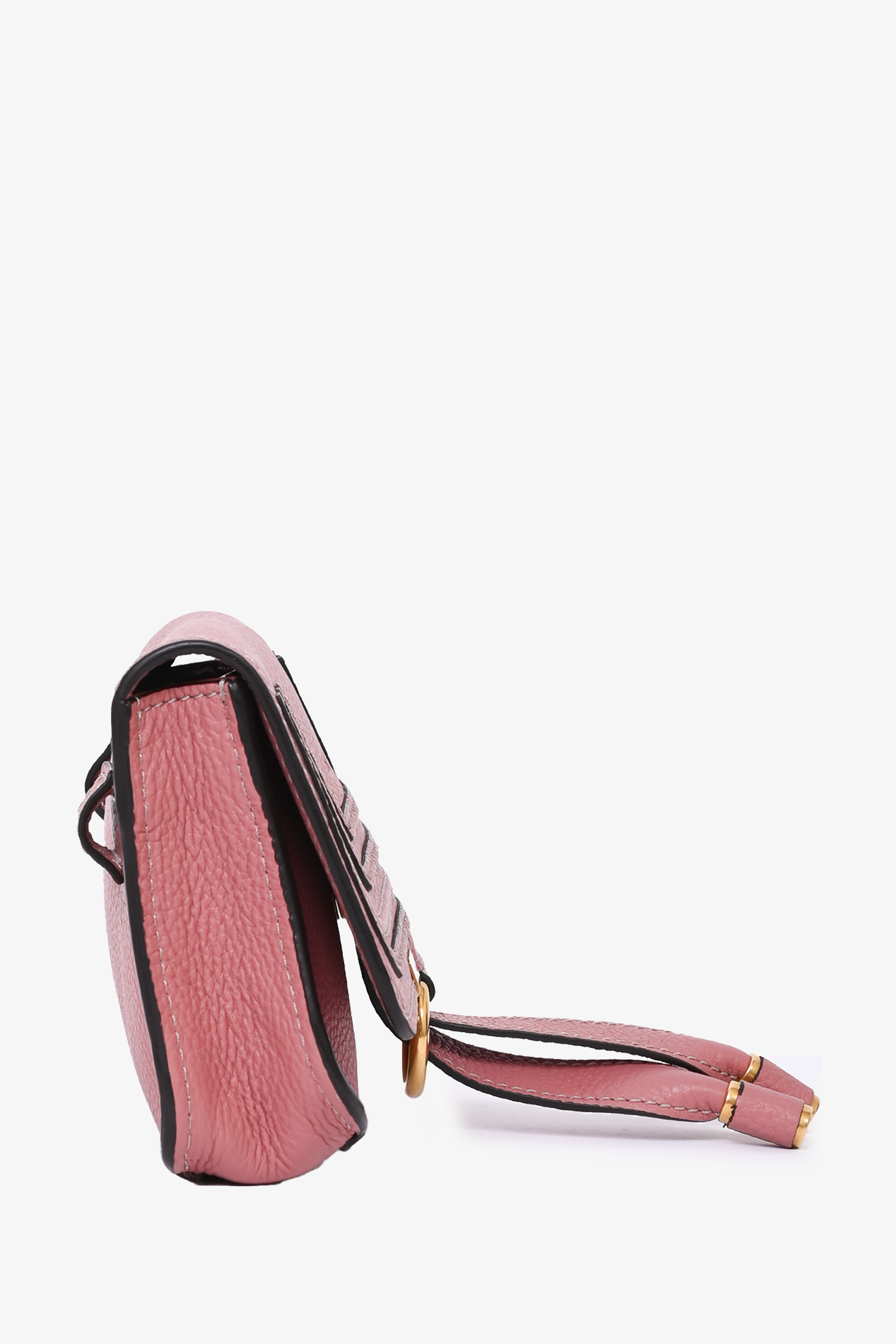 Chloe Pink Leather 'Marcie' Belt Bag. Fold over flap with magnetic button closure. 1 interior slip pocket. Adjustable strap. Contrast stitching.