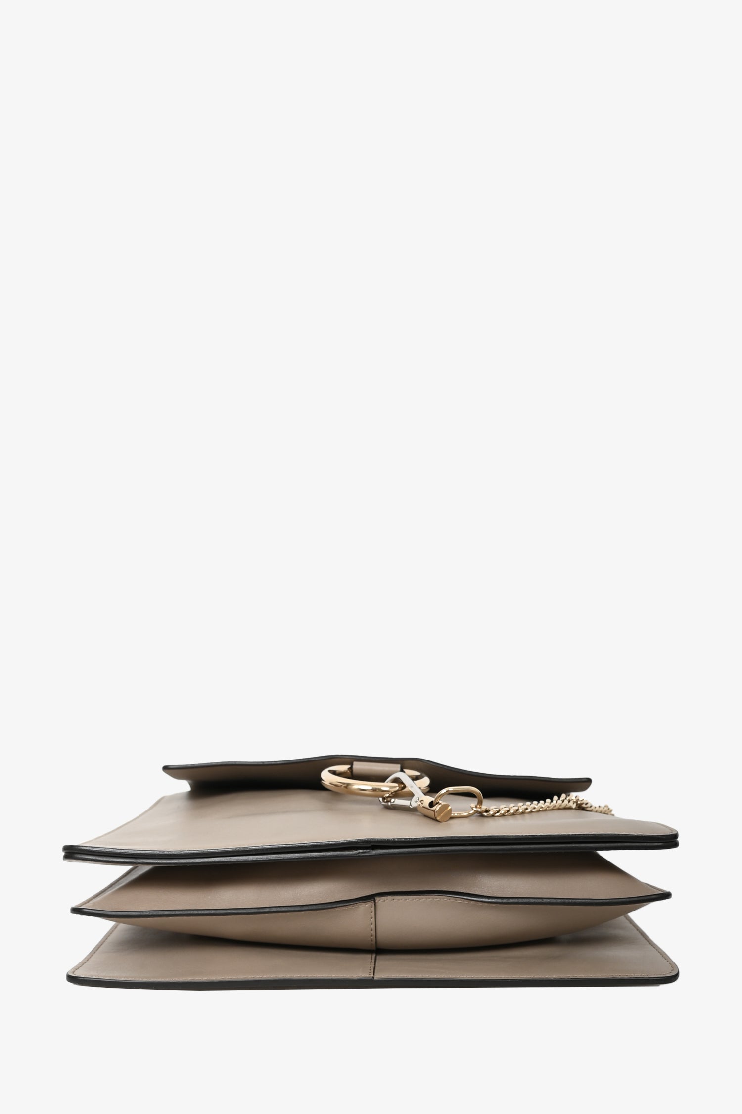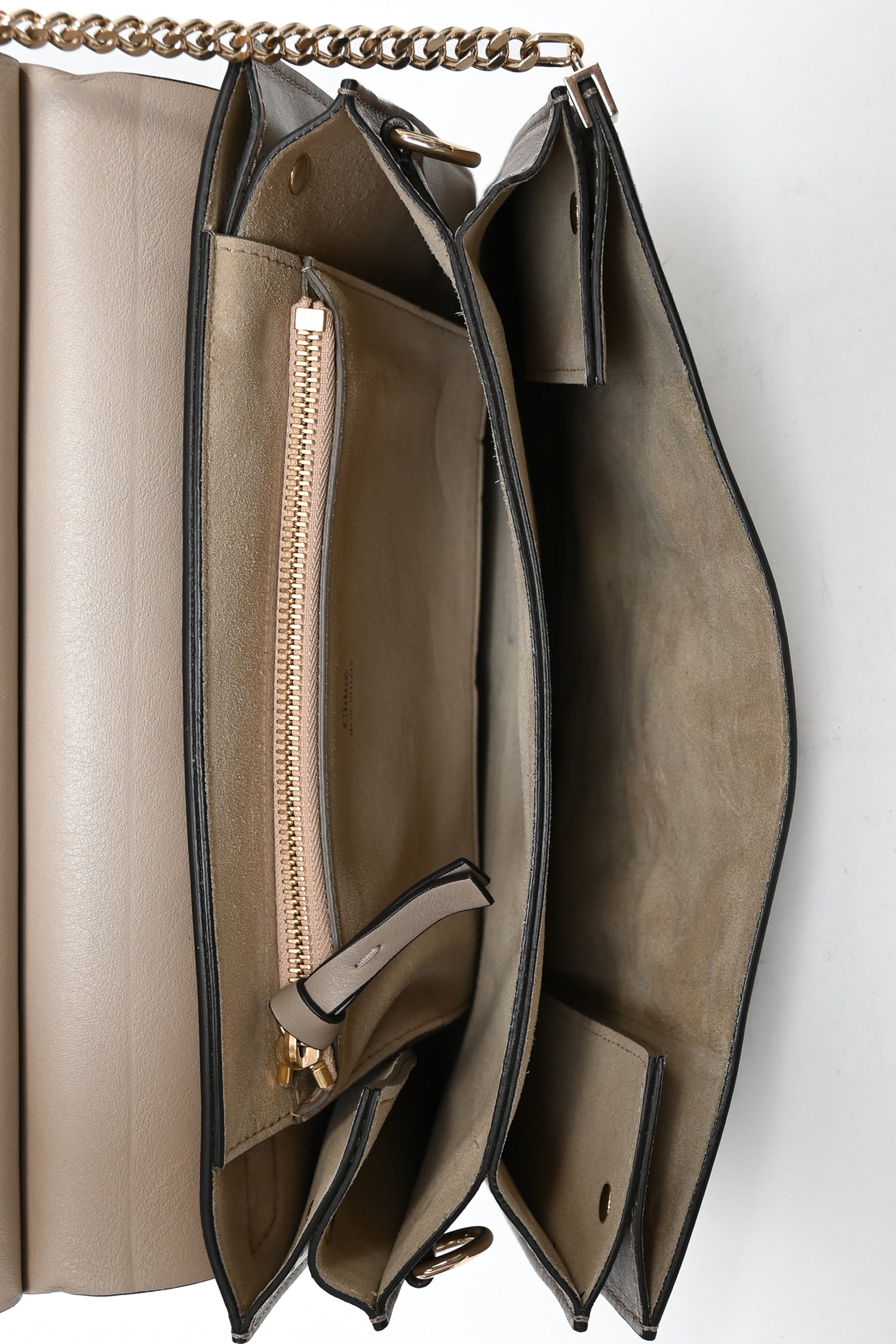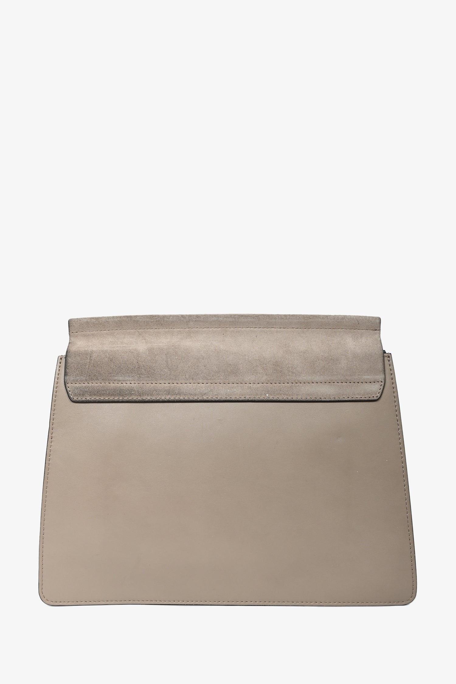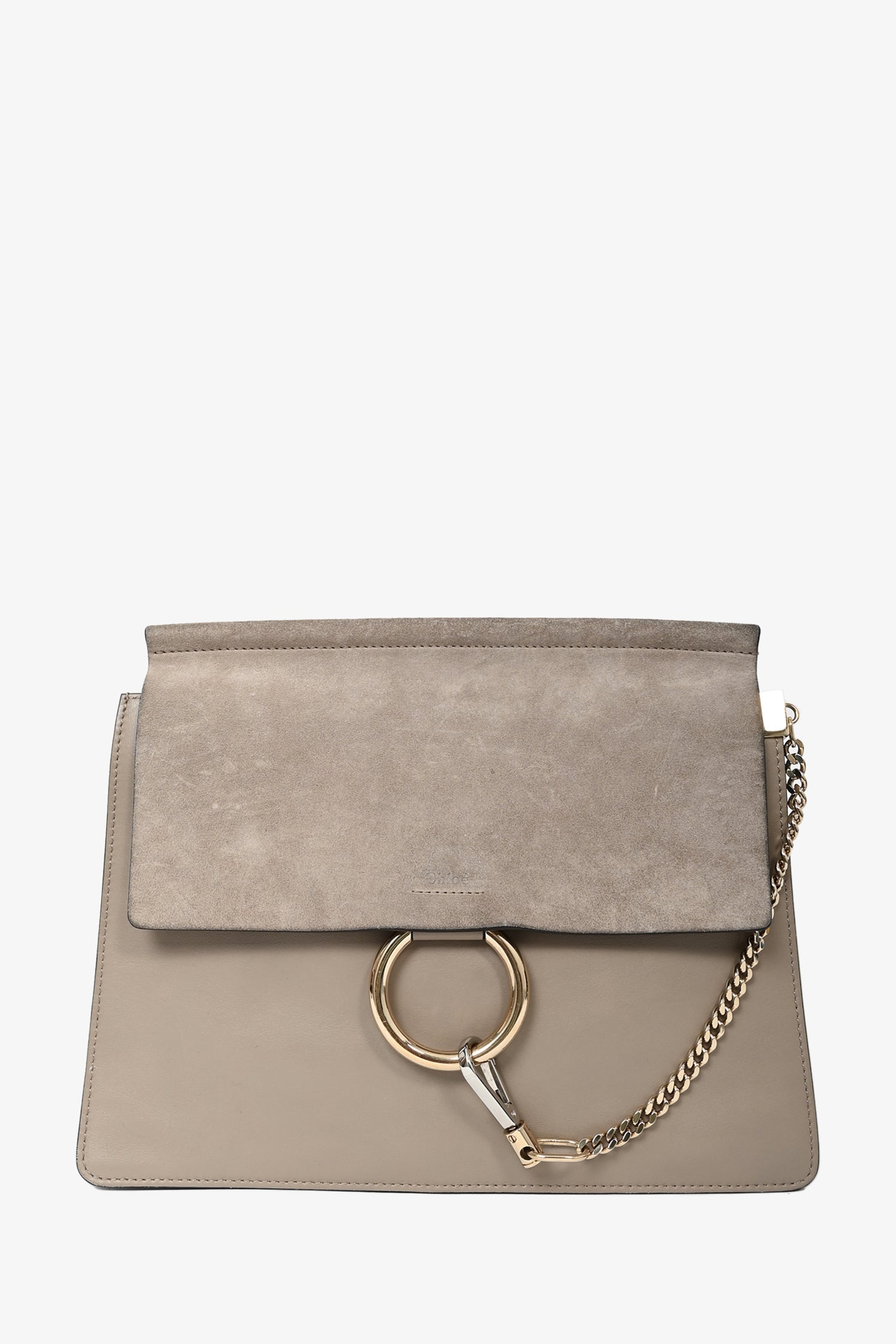 Chloe Taupe Leather/Suede Medium Faye Shoulder Bag. Fold over flap with magnetic button closure. 2 interior compartments. 1 interior zip pocket. 1 removable and adjustable shoulder strap. Silver and gold-tone hardware. Tonal stitching.