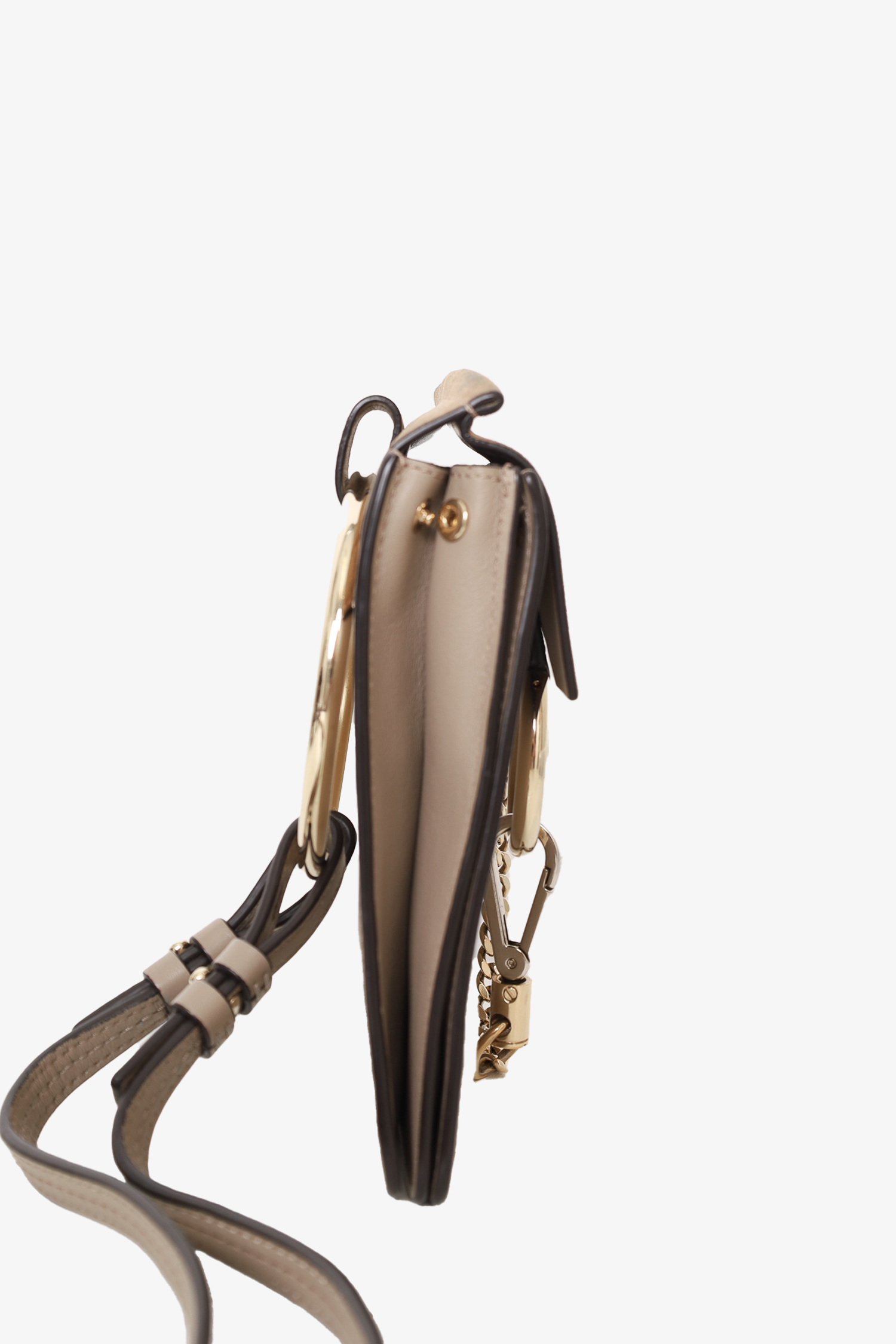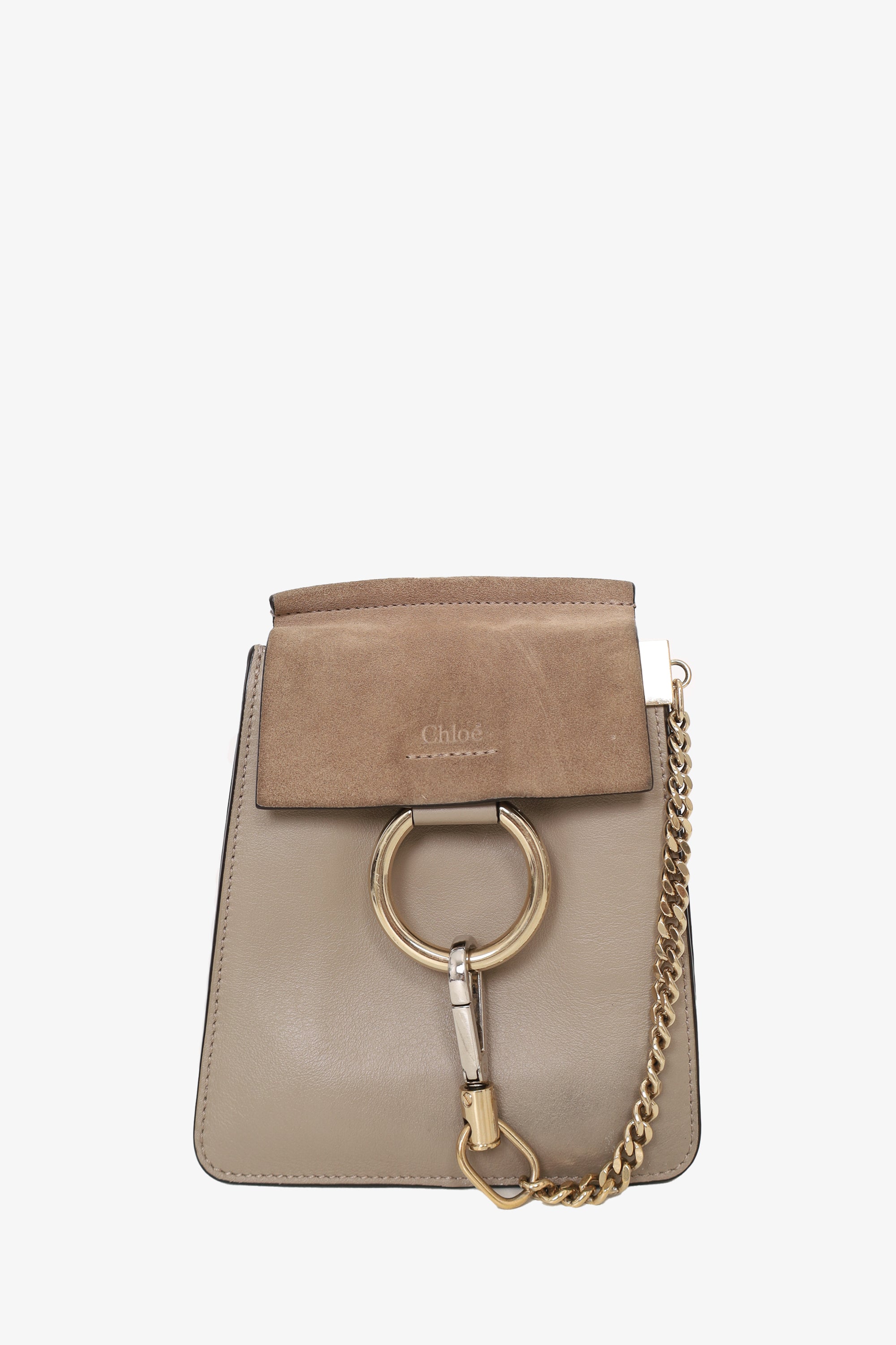 Refresh availabilityChloe Taupe Leather/Suede Mini Faye Shoulder Bag. Front fold over flap with magnetic button closure. Single interior slip pocket. Silver-tone hardware. Tonal stitching.