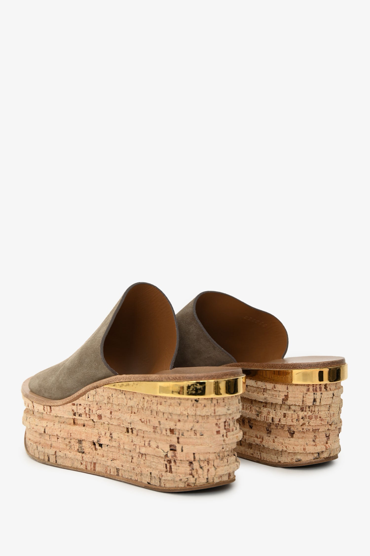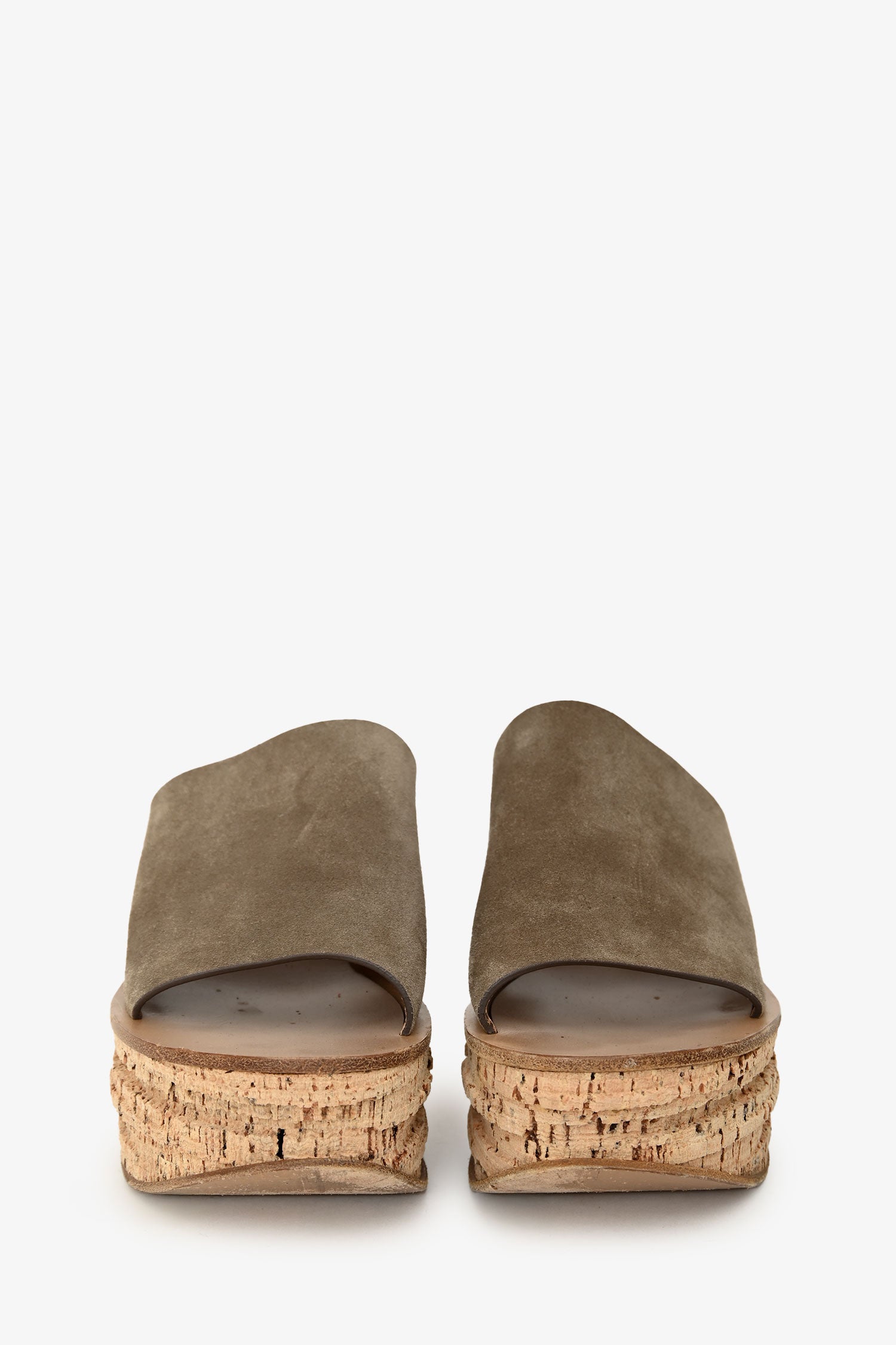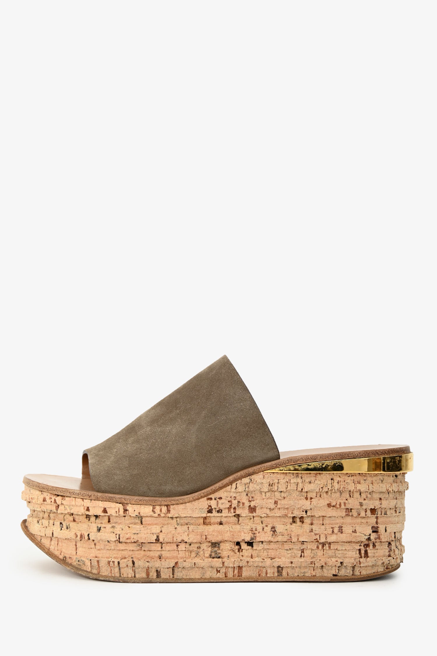 Refresh availabilityChloe Taupe Suede Camille Sandals. Open round toe. Suede trim. Cork, stacked heel. Tonal stitching.