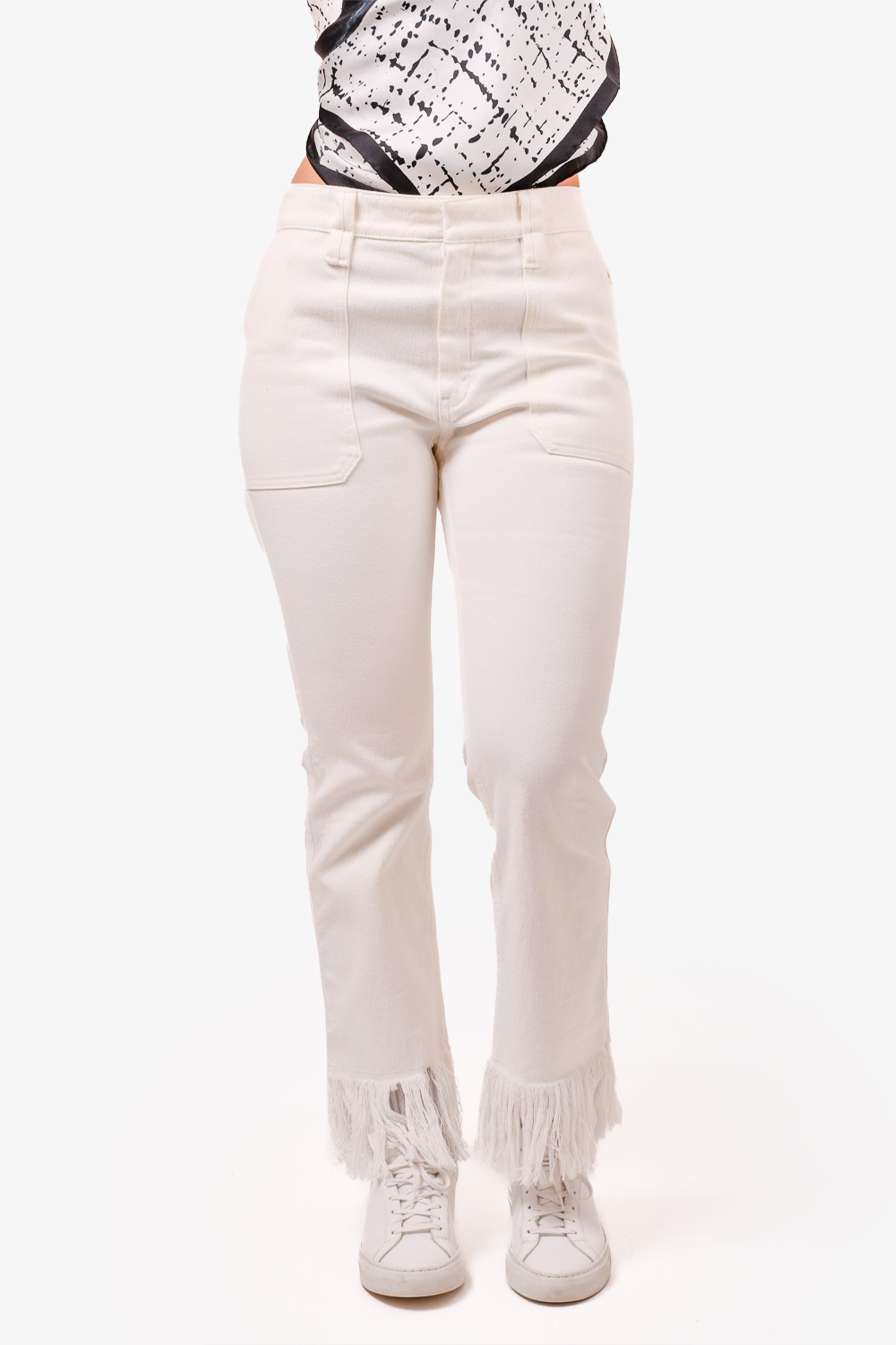 Refresh availabilityChloe White Fringe Jeans. Front zip, hook and button closure. Front and rear pockets. Waist belt loops. Tonal stitching.