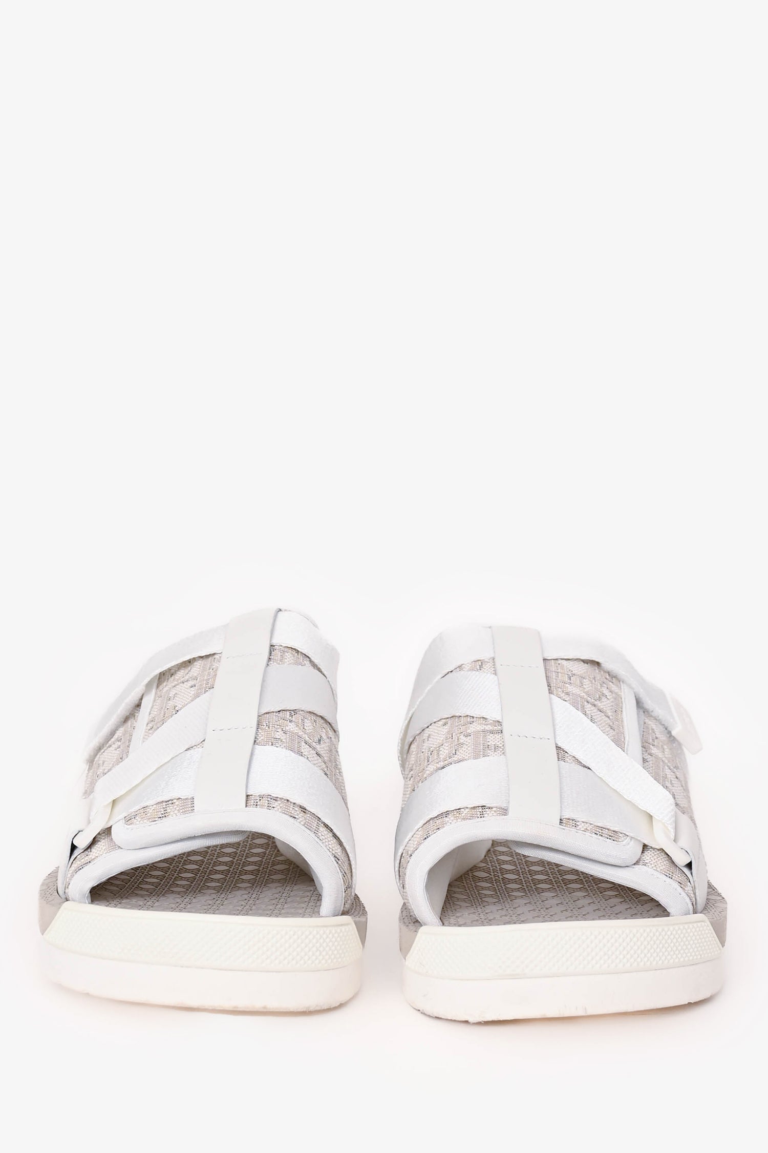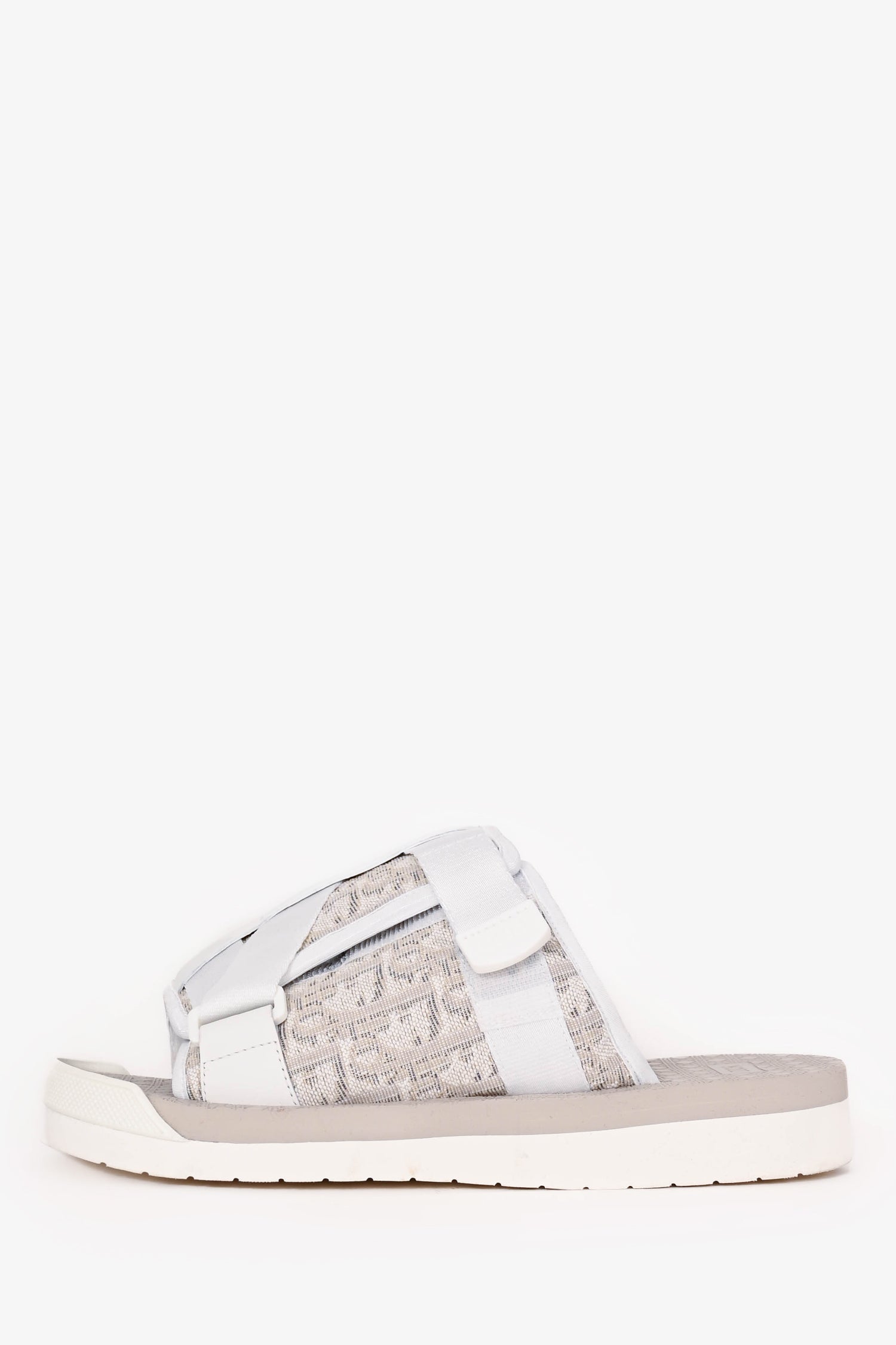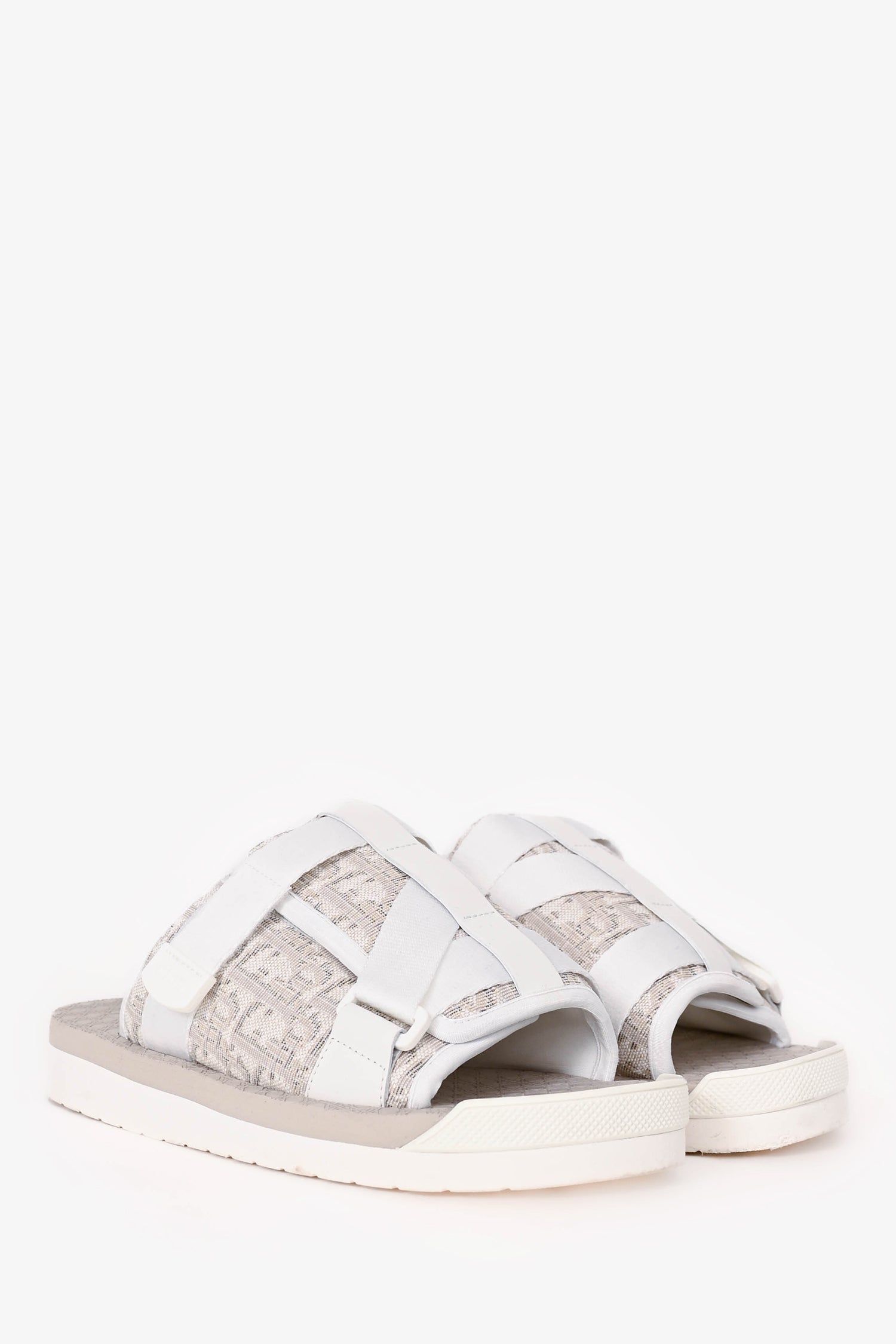 Refresh availabilityChristian Dior White/Beige Oblique 'Alpha' Slides. Slip-on. Open toe. 2 adjustable velcro straps; 1 large foot strap and 1 smaller exterior strap. Rubber insole and sole. Tonal stitching.