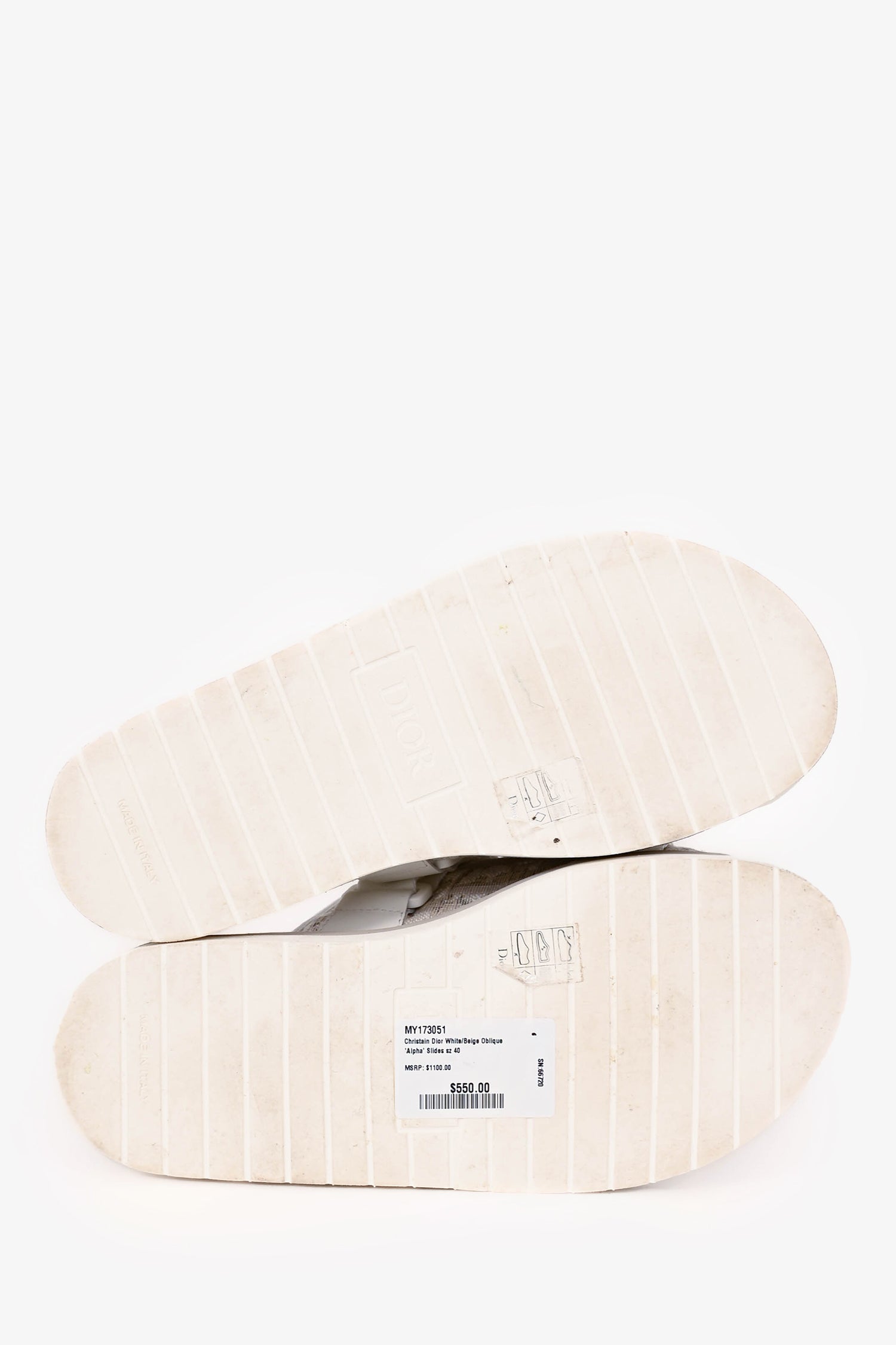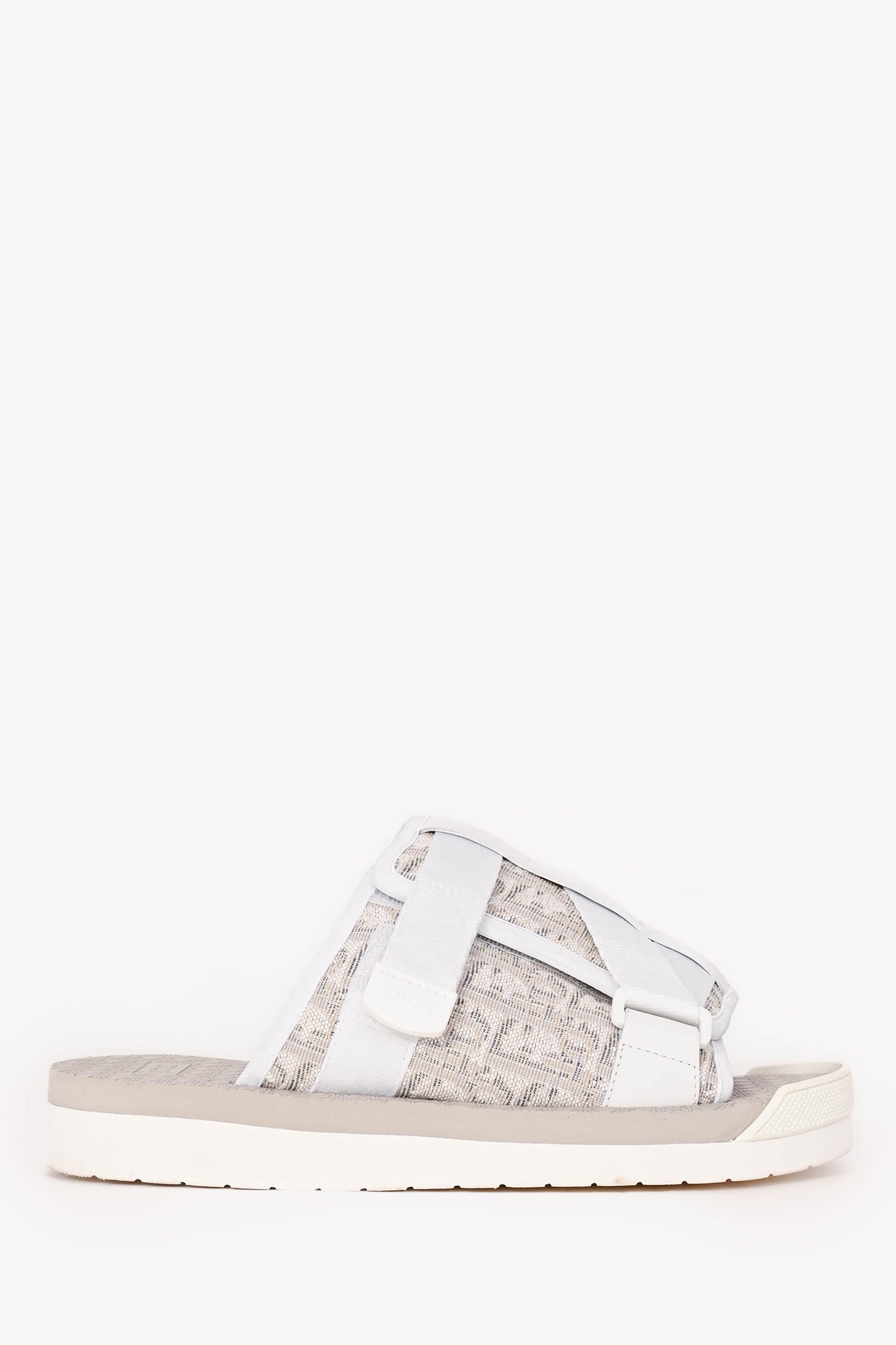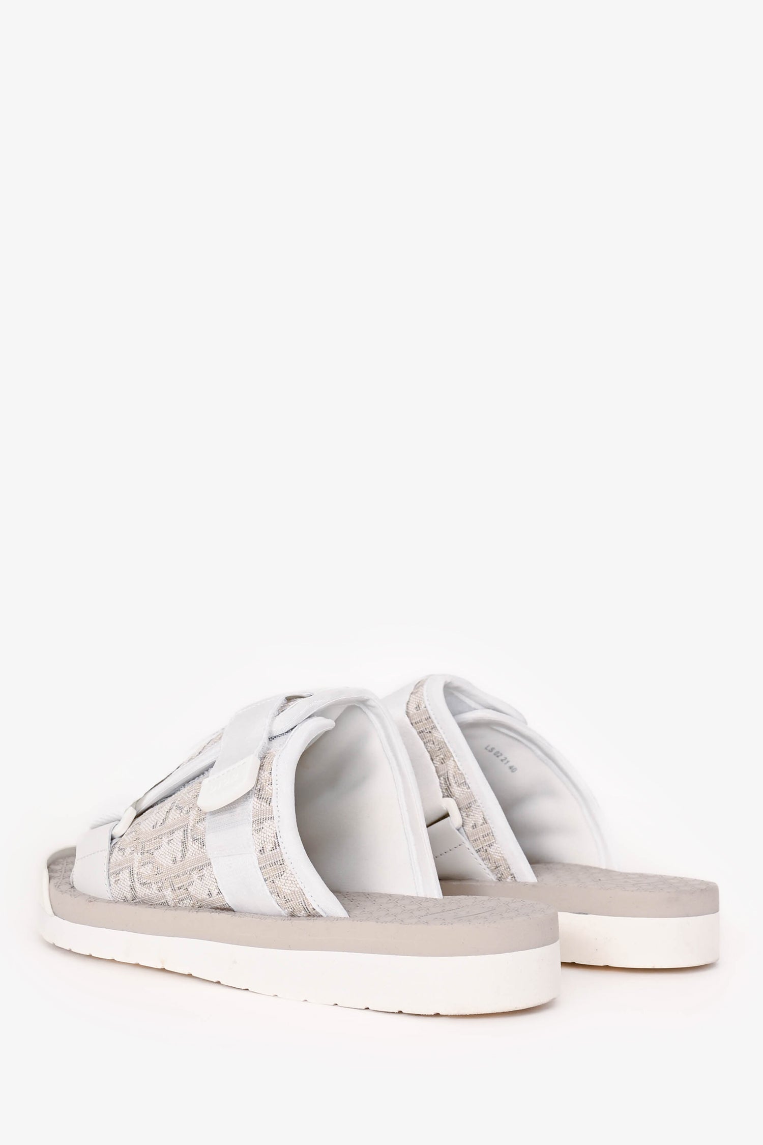 Refresh availabilityChristian Dior White/Beige Oblique 'Alpha' Slides. Slip-on. Open toe. 2 adjustable velcro straps; 1 large foot strap and 1 smaller exterior strap. Rubber insole and sole. Tonal stitching.