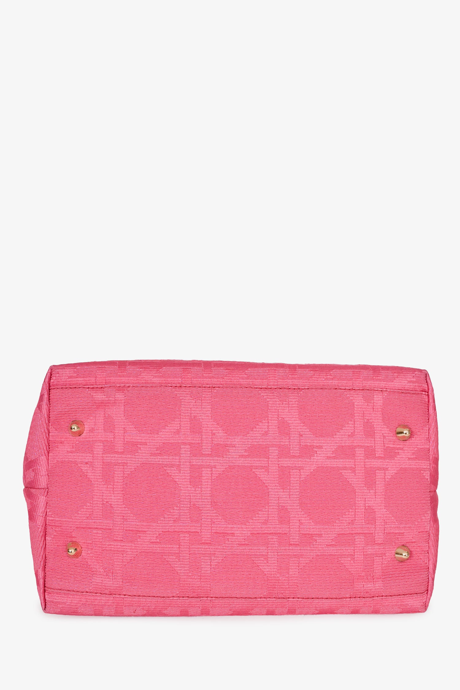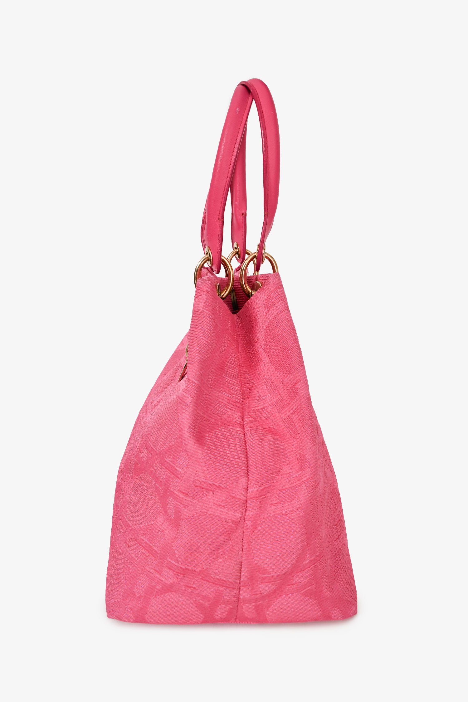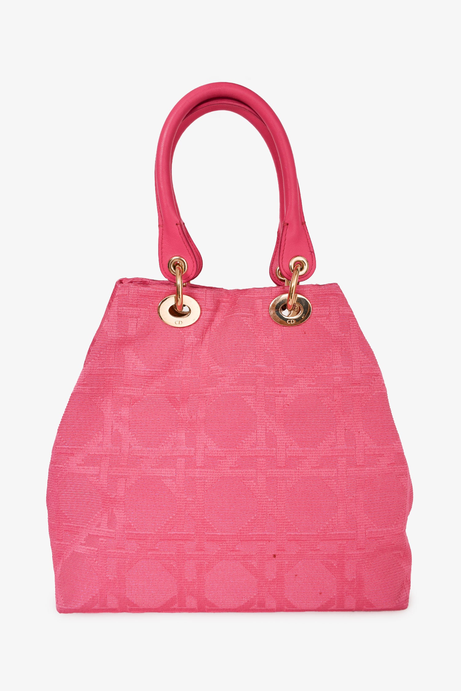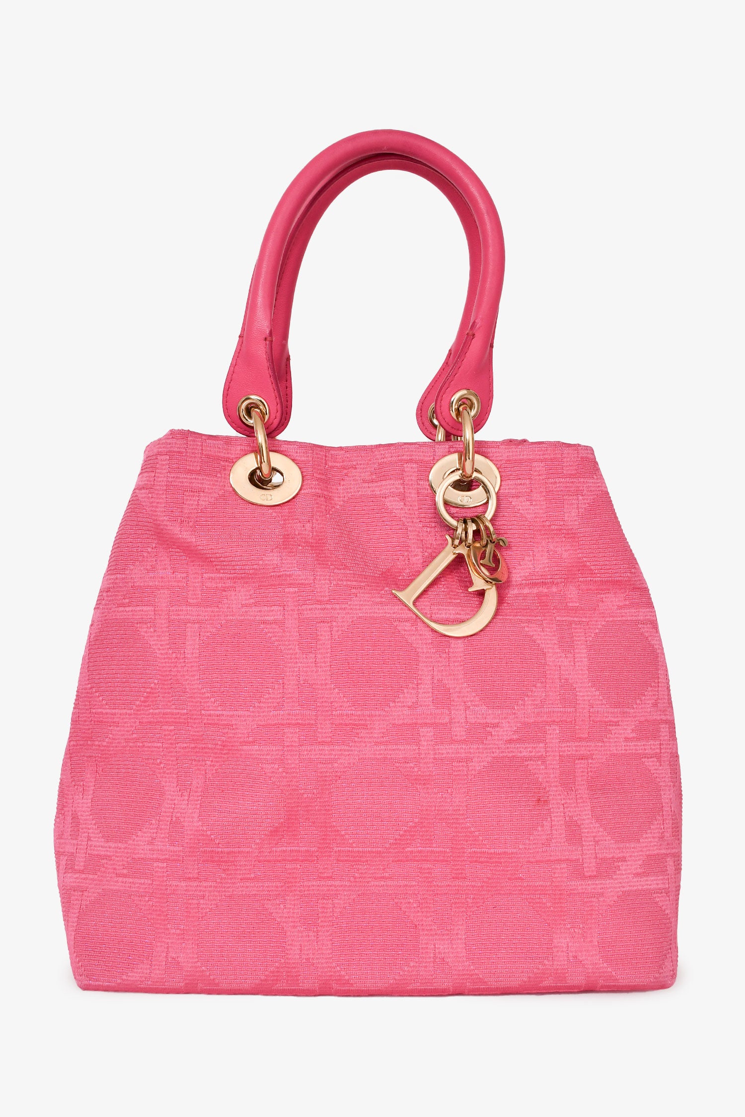 Refresh availabilityChristian Dior 2007 Pink Cannage Jacquard Canvas Lady Dior Tote. Gold-tone hardware. Rolled top handles. Attached 'DIOR' charms. Lined interior with a zipped compartment. Concealed snap closure.