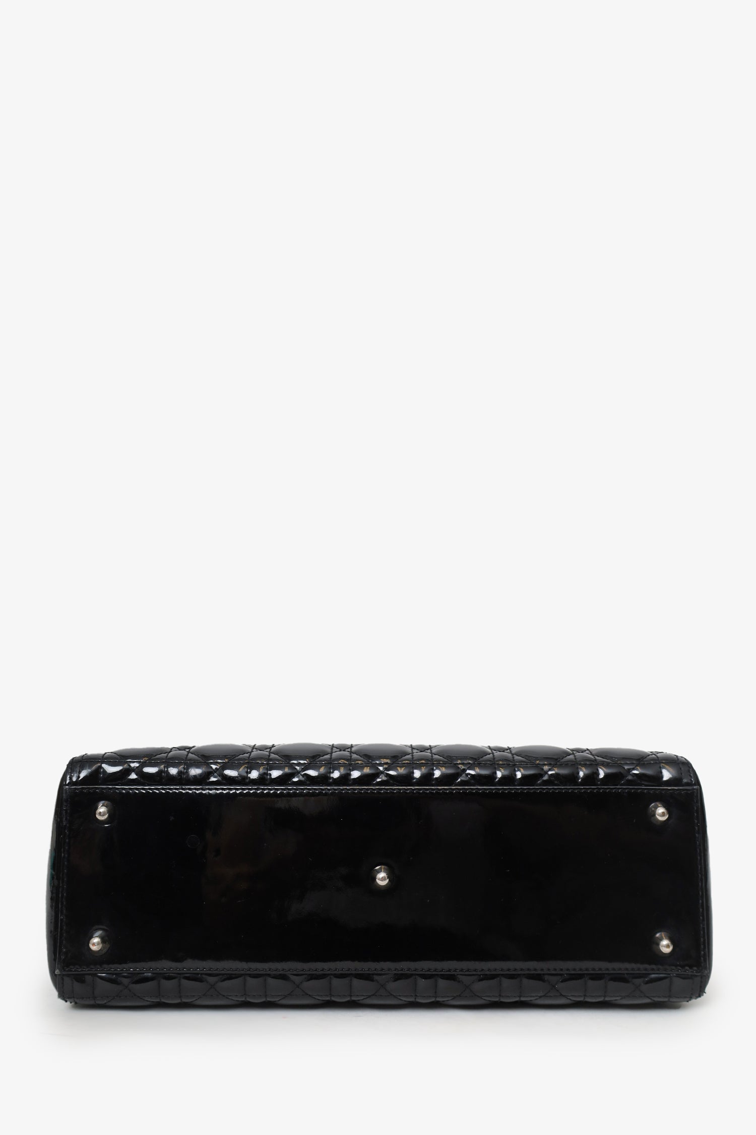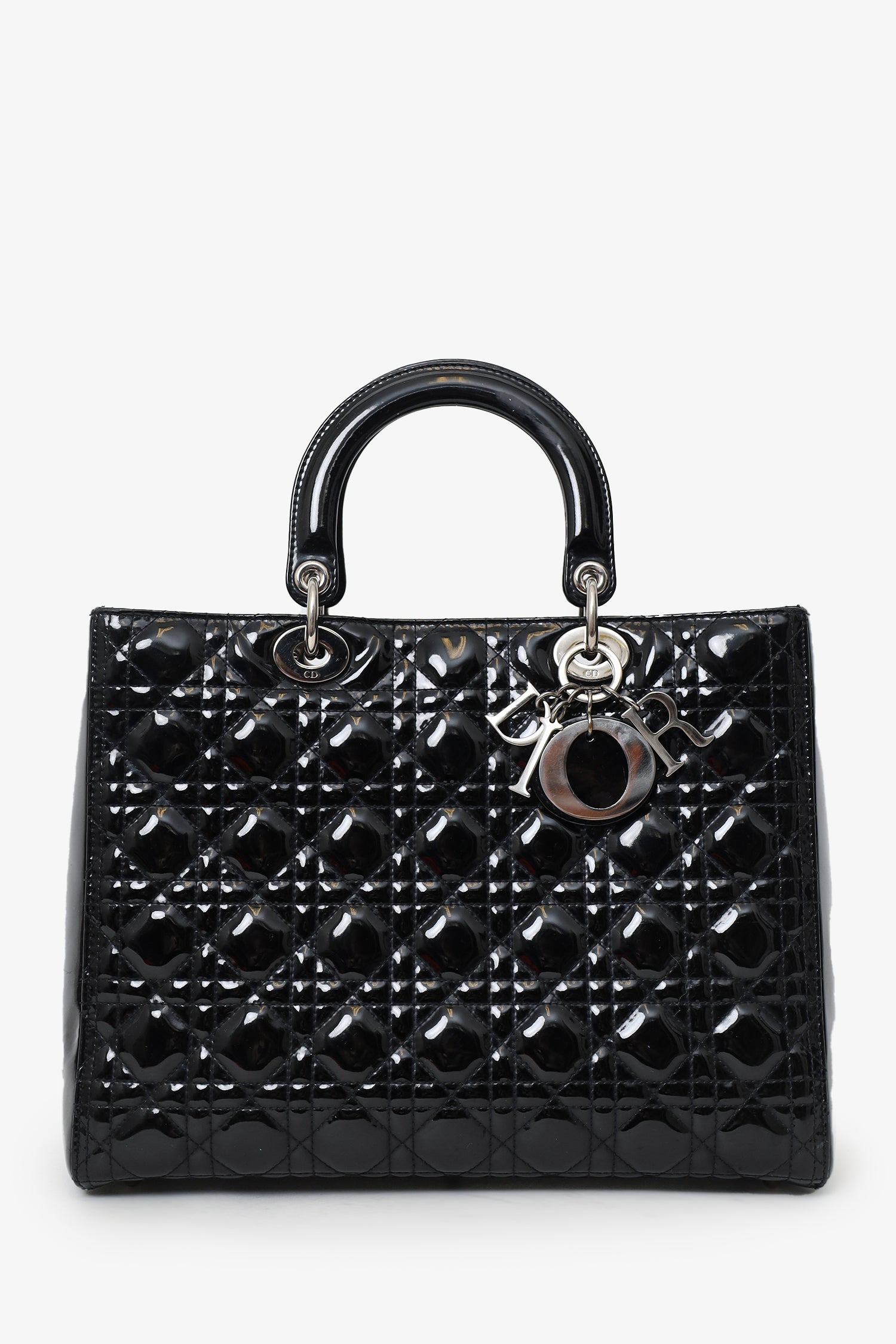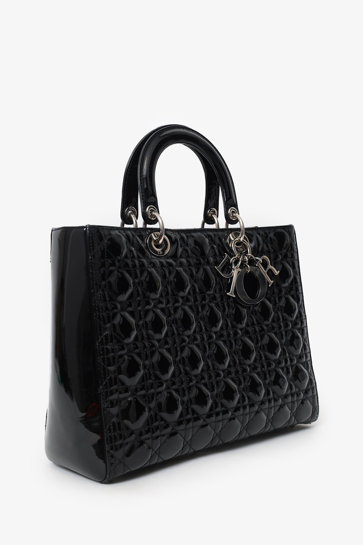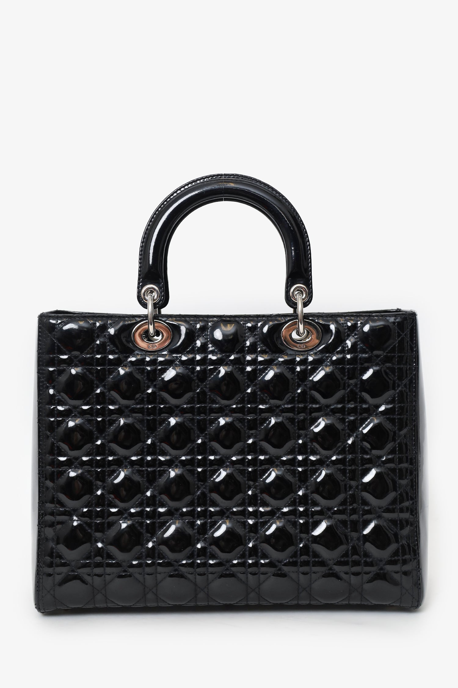 Refresh availabilityChristian Dior 2010 Black Patent Leather Large Lady Dior. Top zip closure. Twin handles. Protective base studs. Lined interior. Single interior zip pocket. Silver-tone hardware. Tonal stitching.