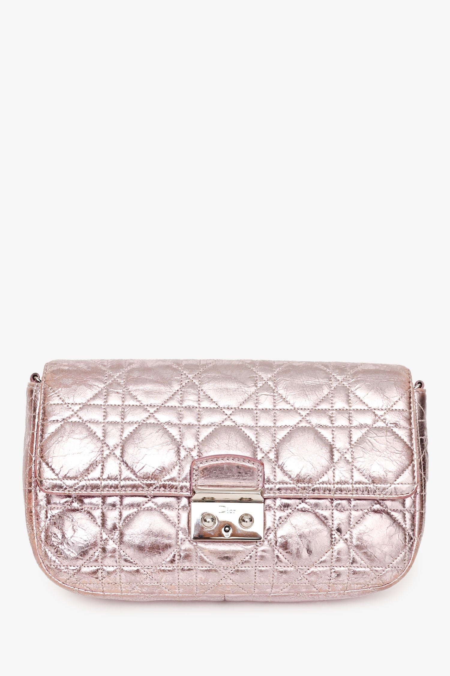 Refresh availabilityChristian Dior 2014 Pink Metallic Cannage Leather 'Miss Dior' Wallet on Chain. Fold-over flap with a push-open closure. Attached 'DIOR' charms on chain-link strap. 2 compartments. 6 card slots. Tonal stitching.