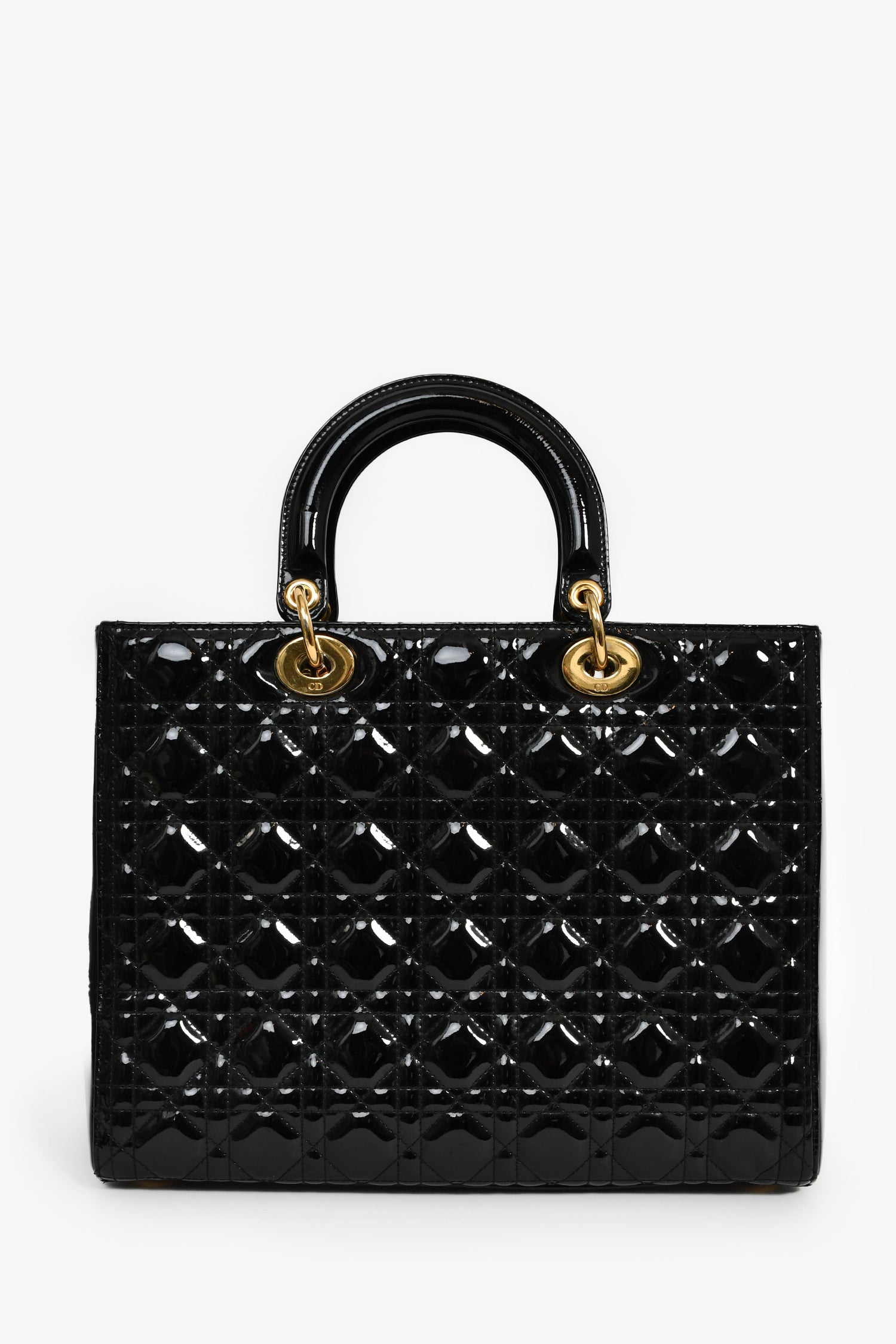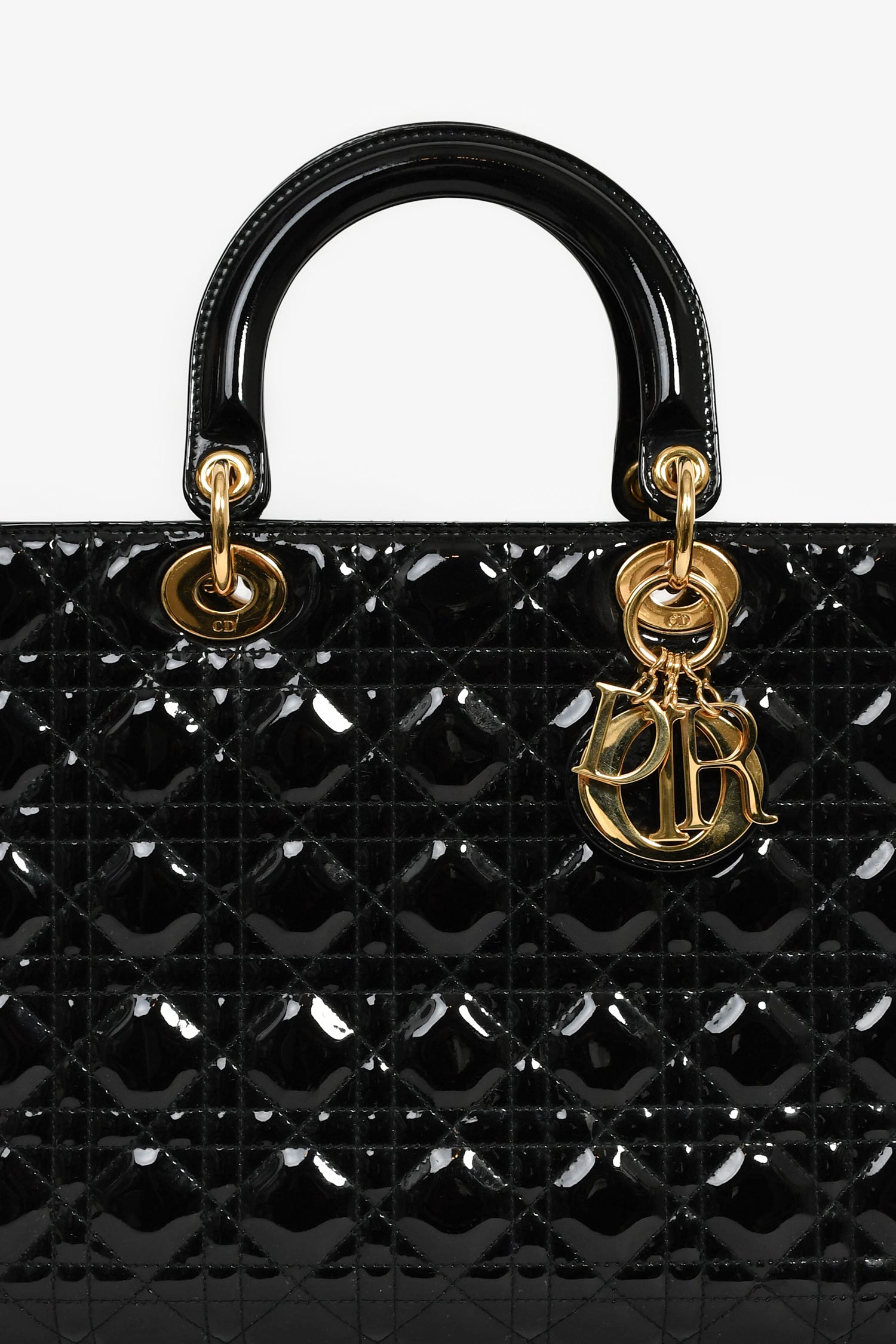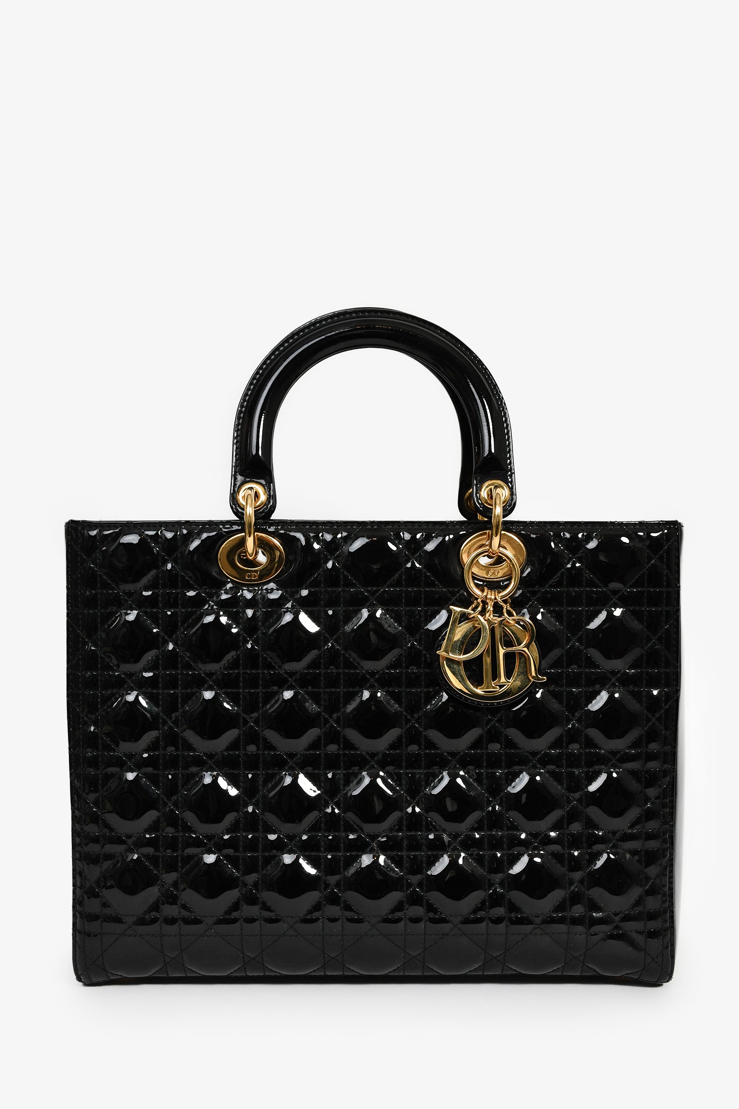 Refresh availabilityChristian Dior 2015 Black Patent Leather Large Lady Dior. Concealed top zip. Dual top handles. Attachable shoulder strap. Lined interior with 1 zip compartment. Gold-tone hardware. Tonal stitching.