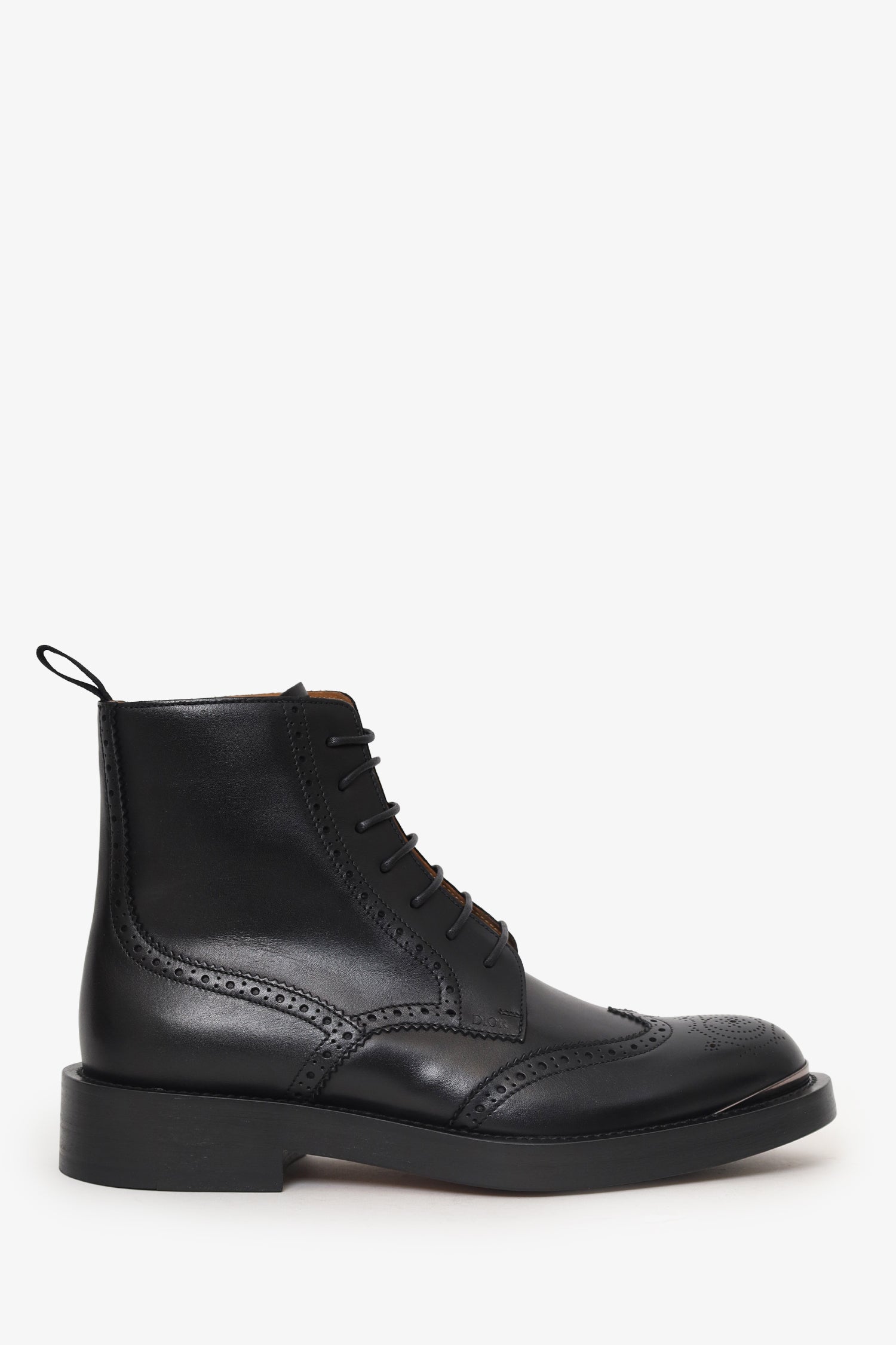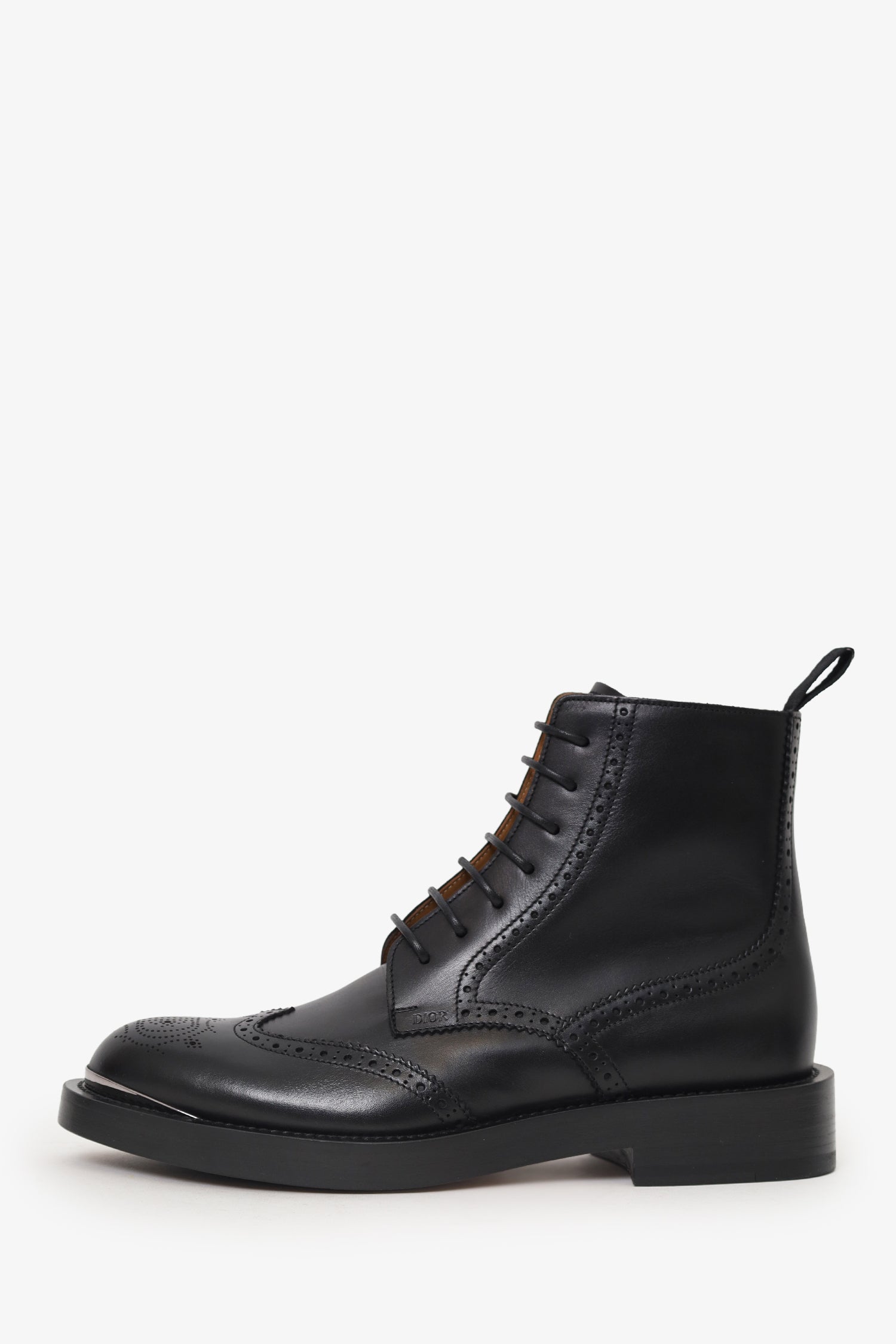Refresh availabilityChristian Dior Black Leather 'Diorunit' Brogue Combat Boots. Pull-on. Round-toe. Front lace-up closure. Rear pull tabs. Silver-tone hardware. Tonal stitching.