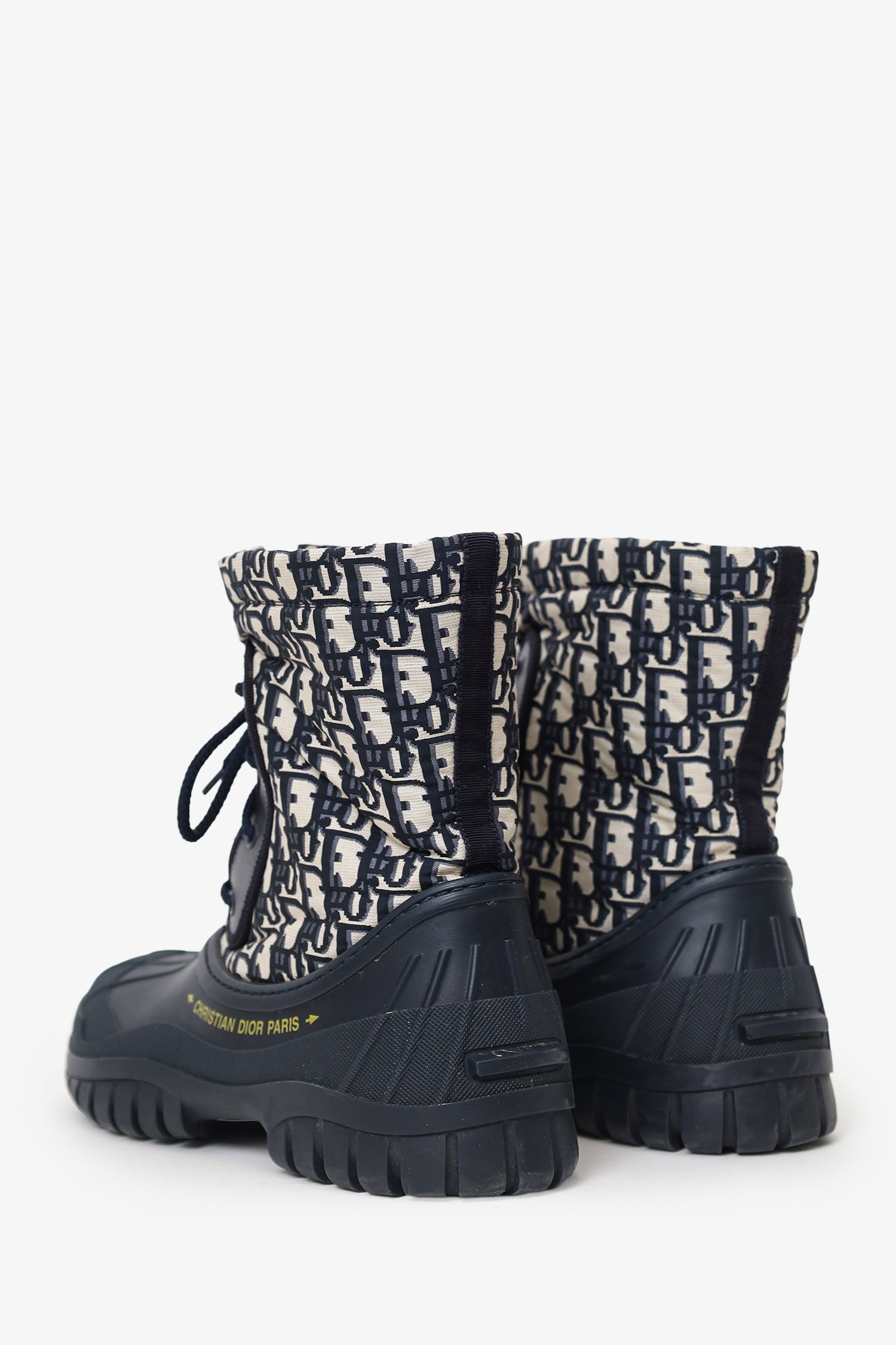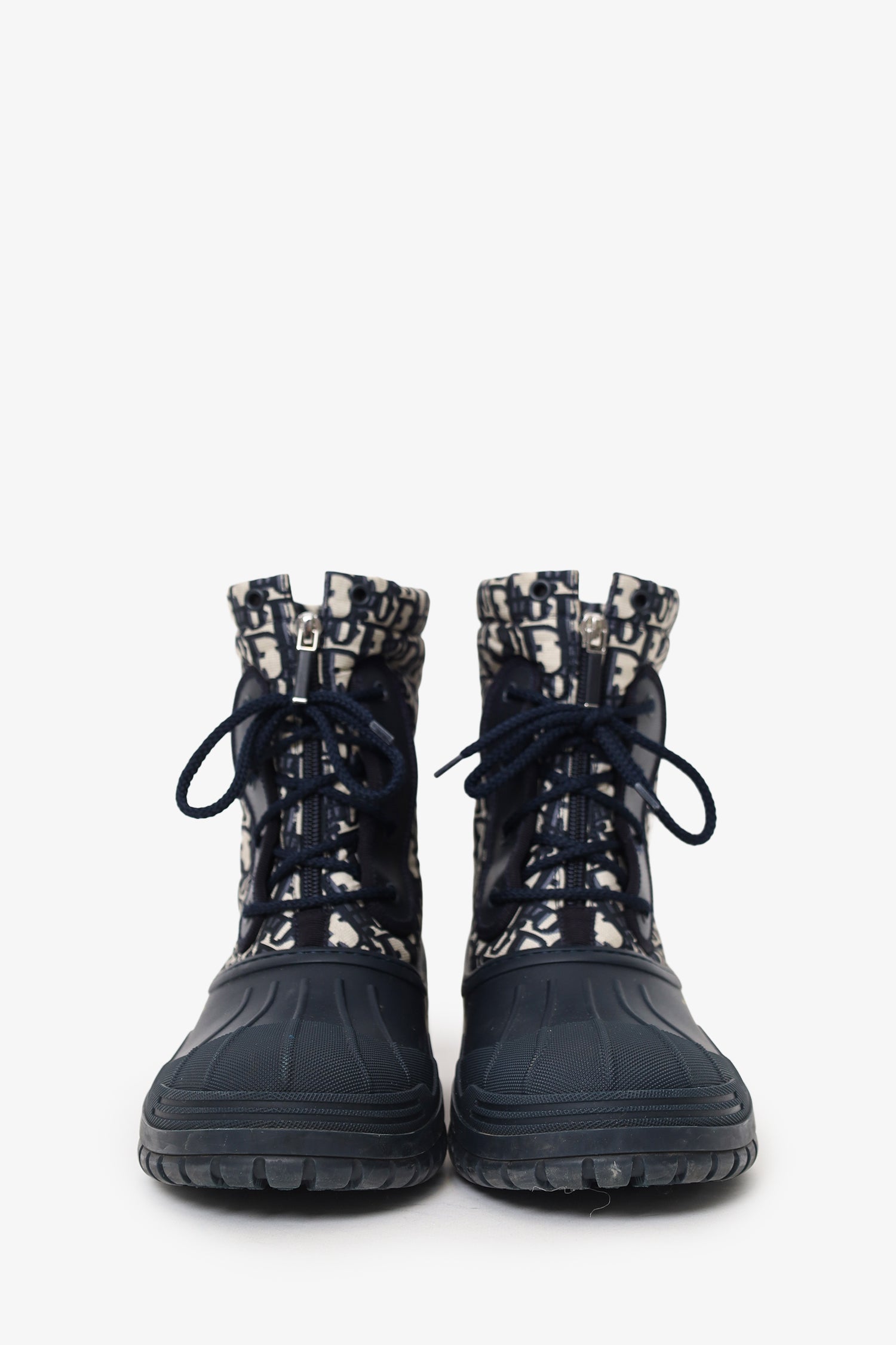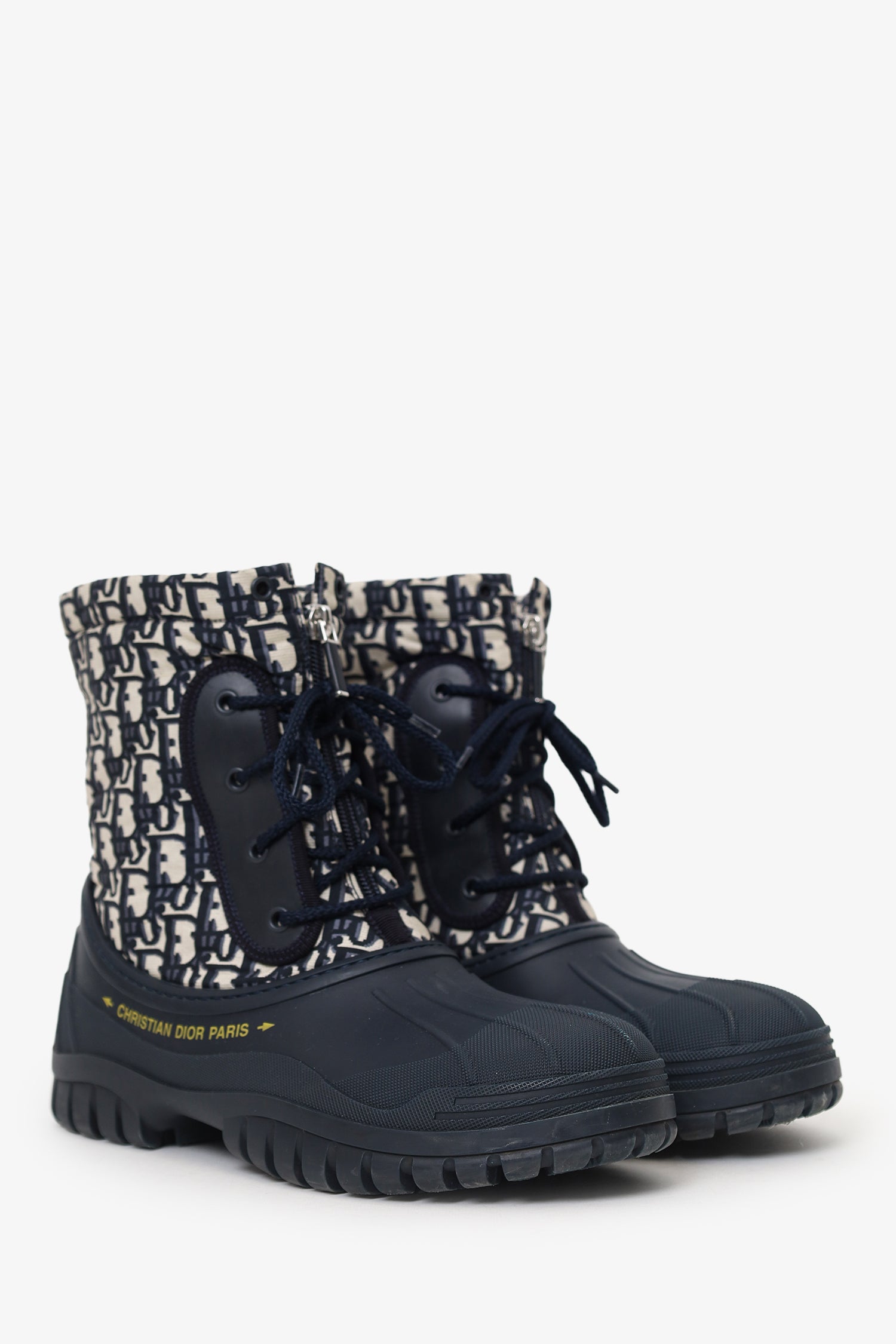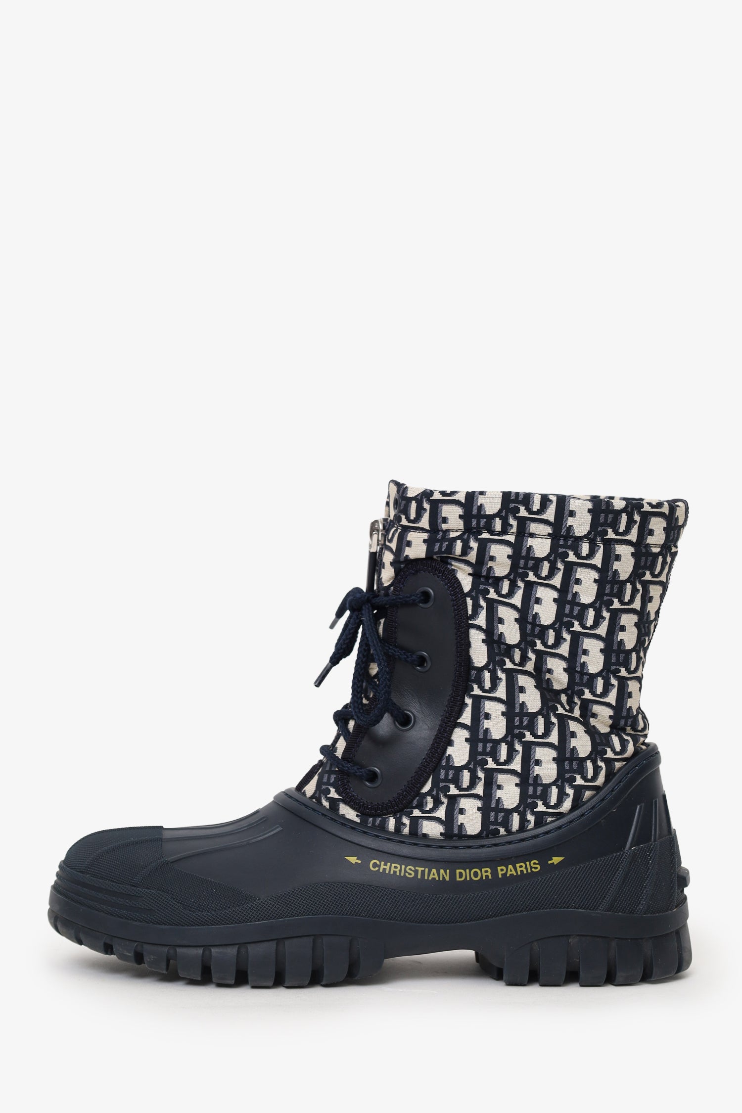 Refresh availabilityChristian Dior Blue Oblique D-Venture Jacquard Boots. Pull-on. Round toe. Front zip and lace-up closure. Sherpa lined interior. Silver-tone hardware. Tonal stitching.