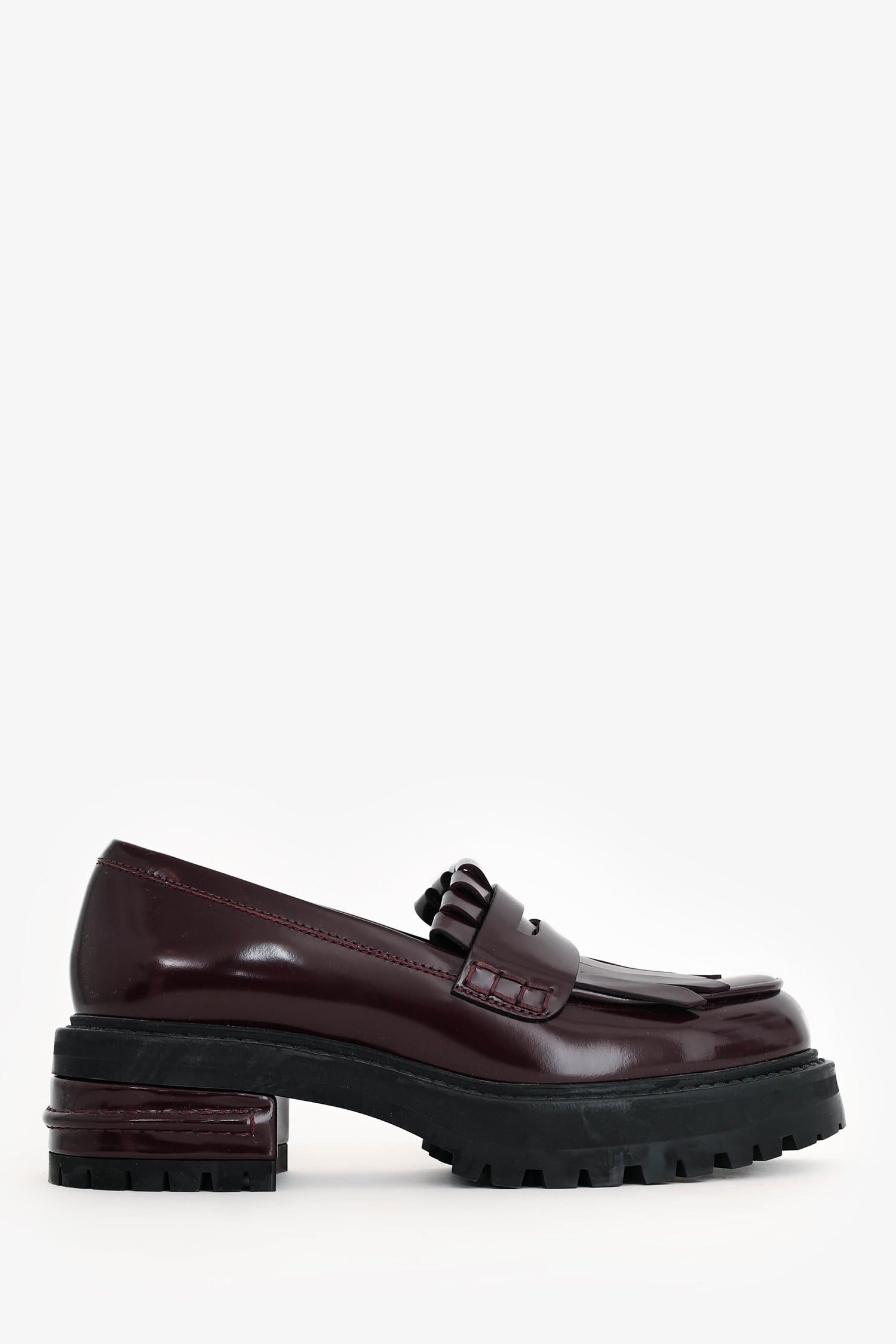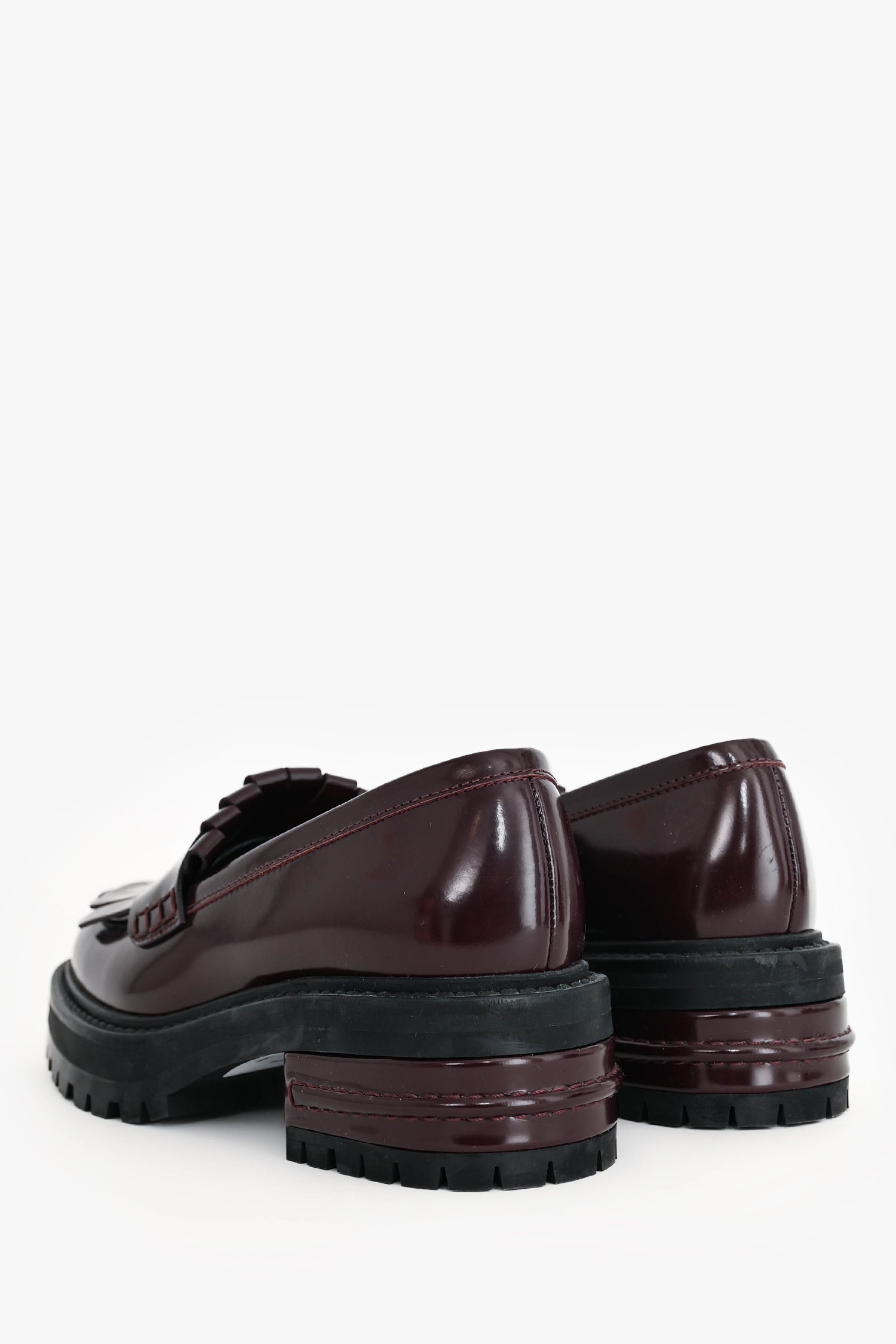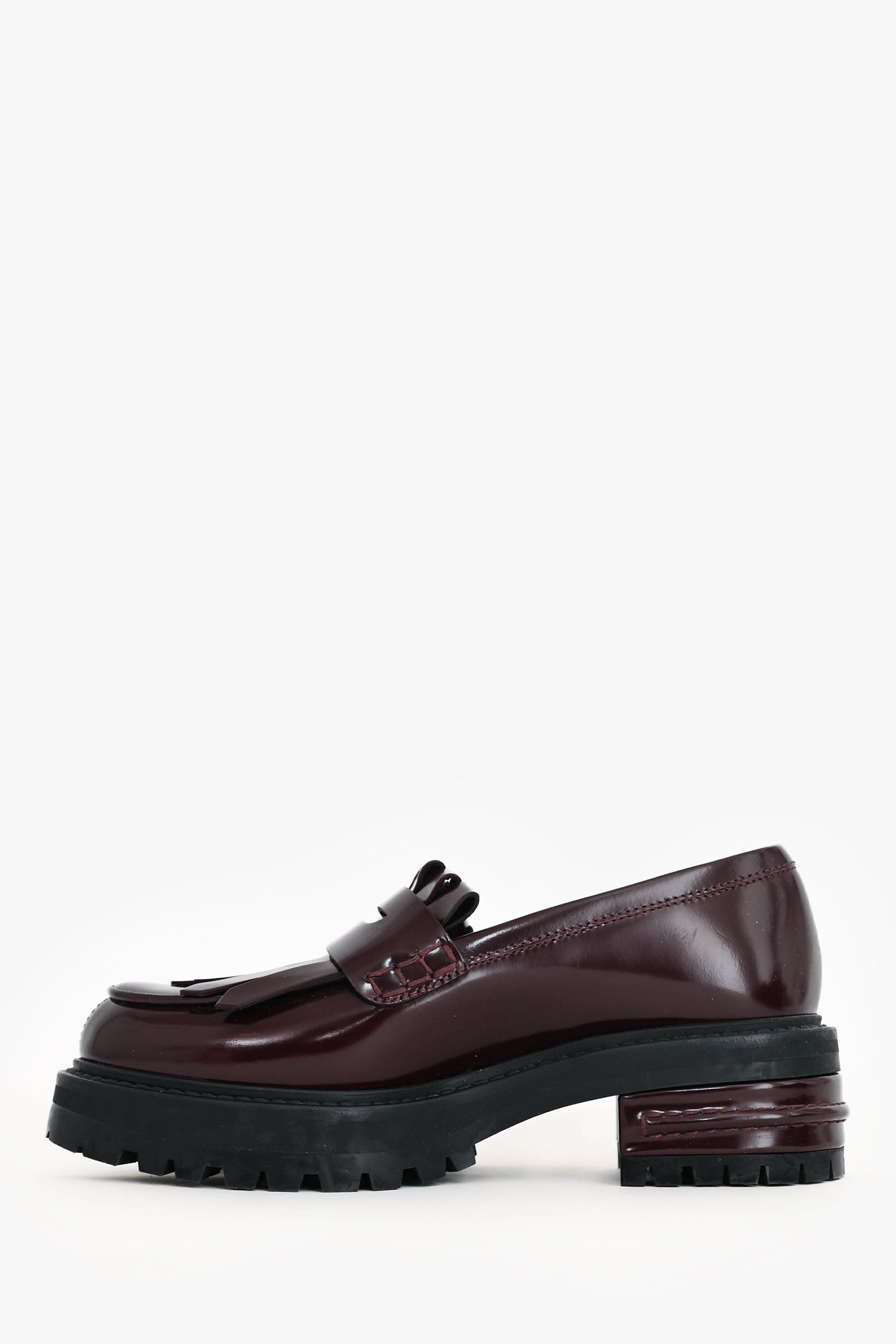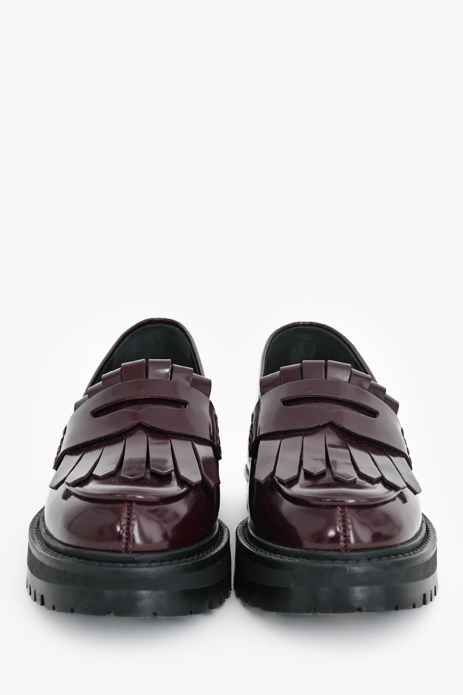 Refresh availabilityChristian Dior Burgundy Brushed Leather Platform Loafers. Slip-on. Round toe. Glossy finish. Leather insole. Fringe detailing. Tonal stitching.