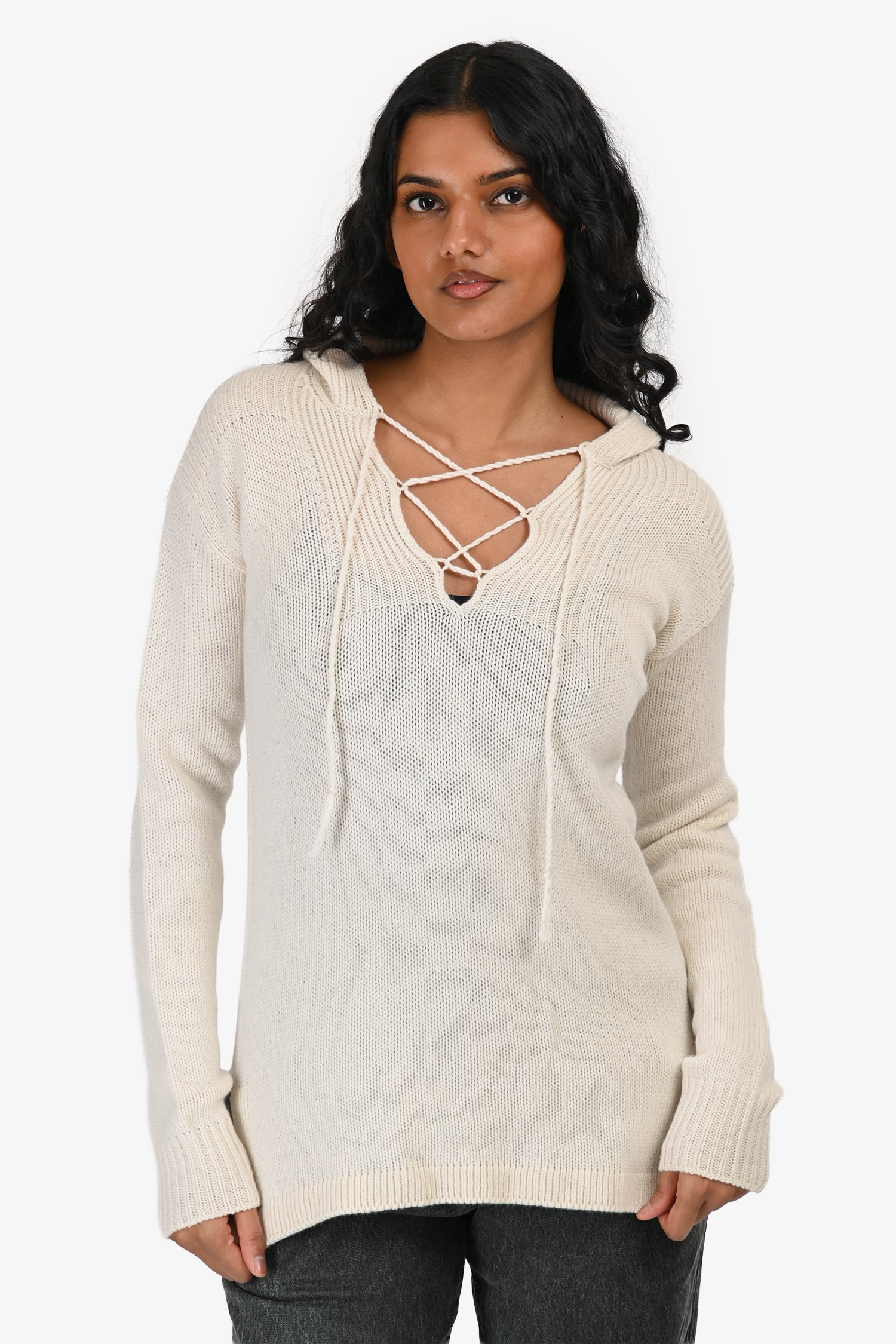 Refresh availabilityChristian Dior Cream/Navy Blue Cashmere Logo Sweater. Pull-on. V-neckline with tie-up closure. Tonal stitching.