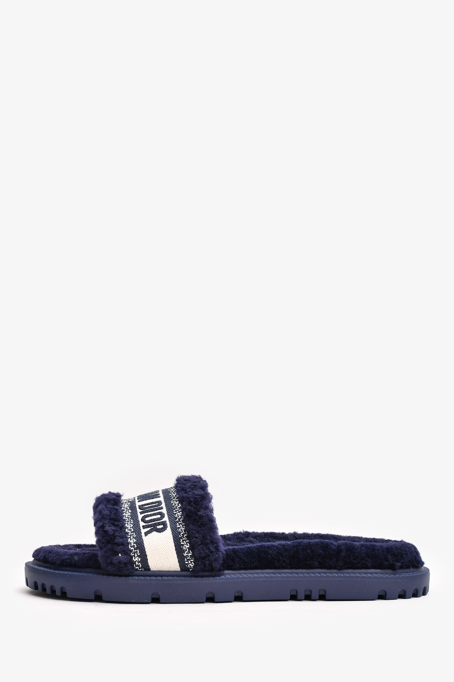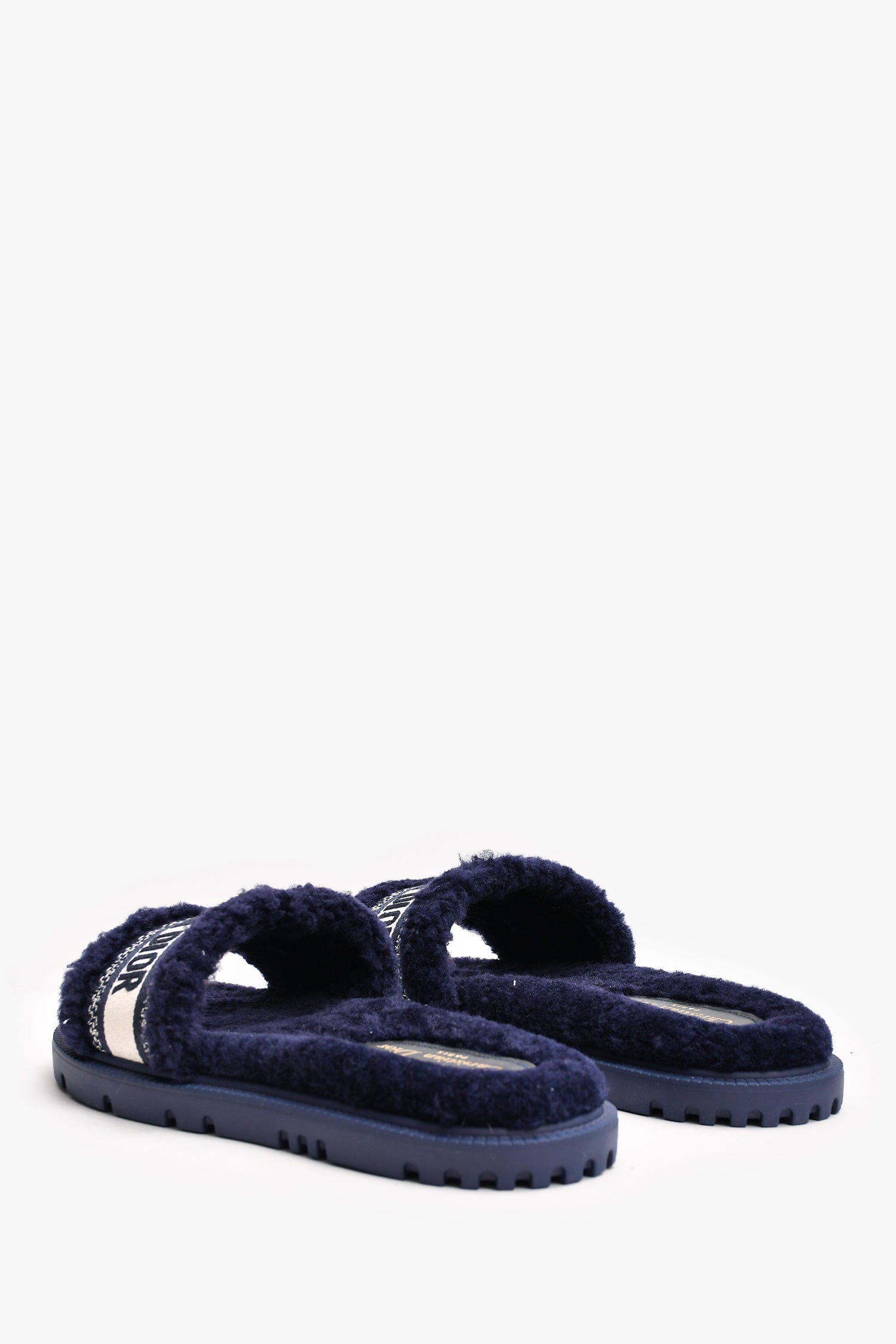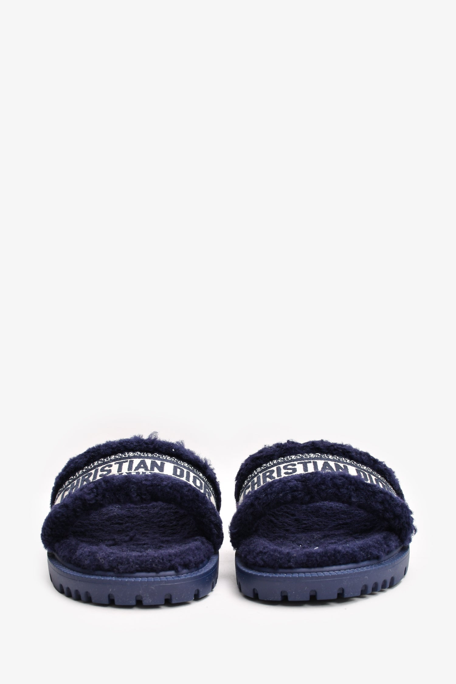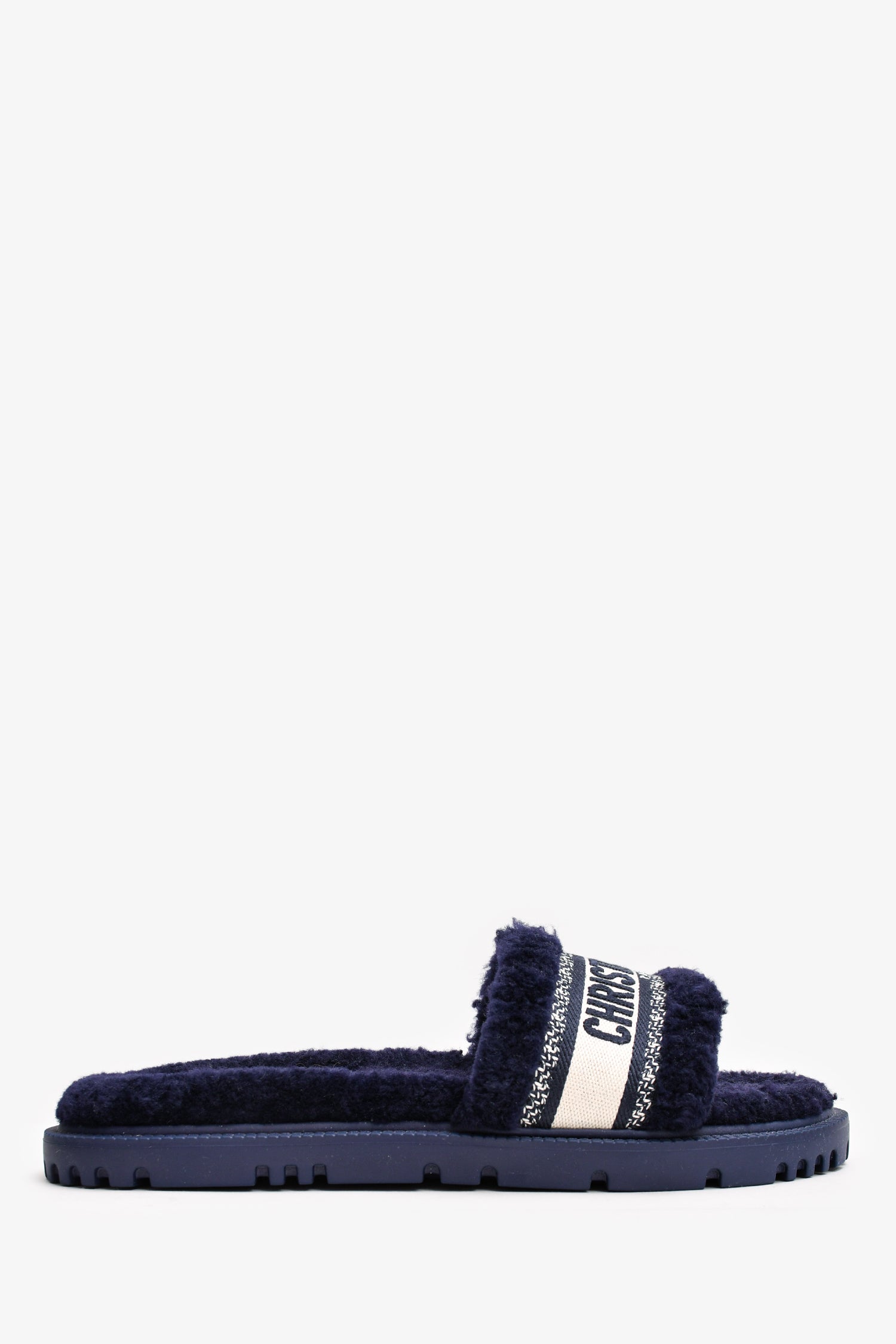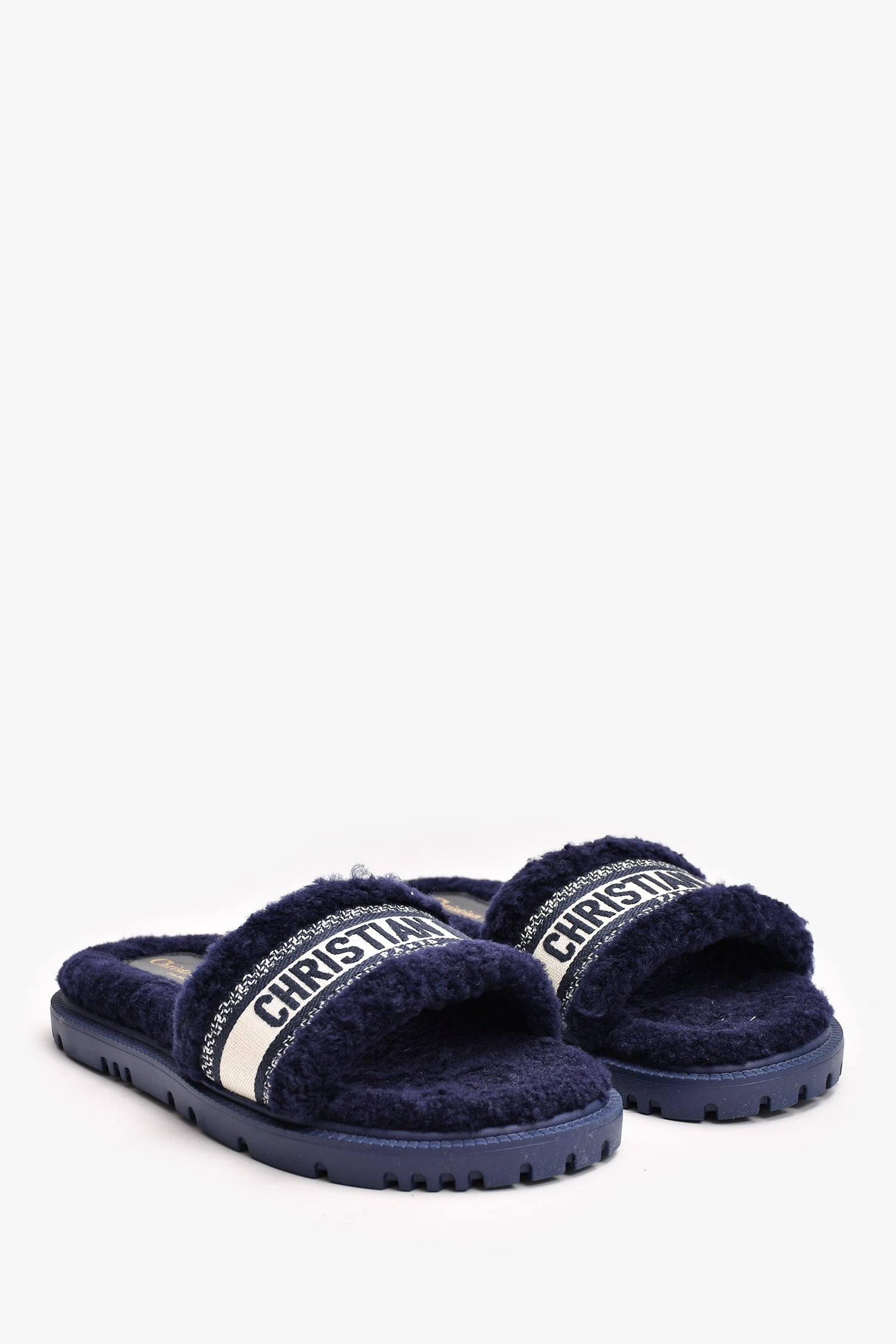 Refresh availabilityChristian Dior Navy Shearling 'DWay' Slides. Round toe. Slip on. Tonal stitching.