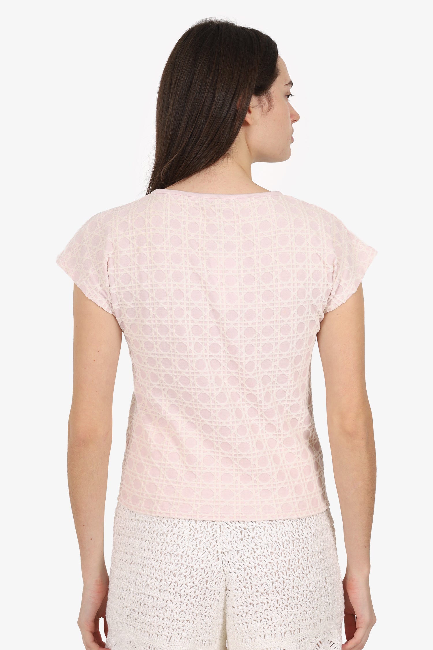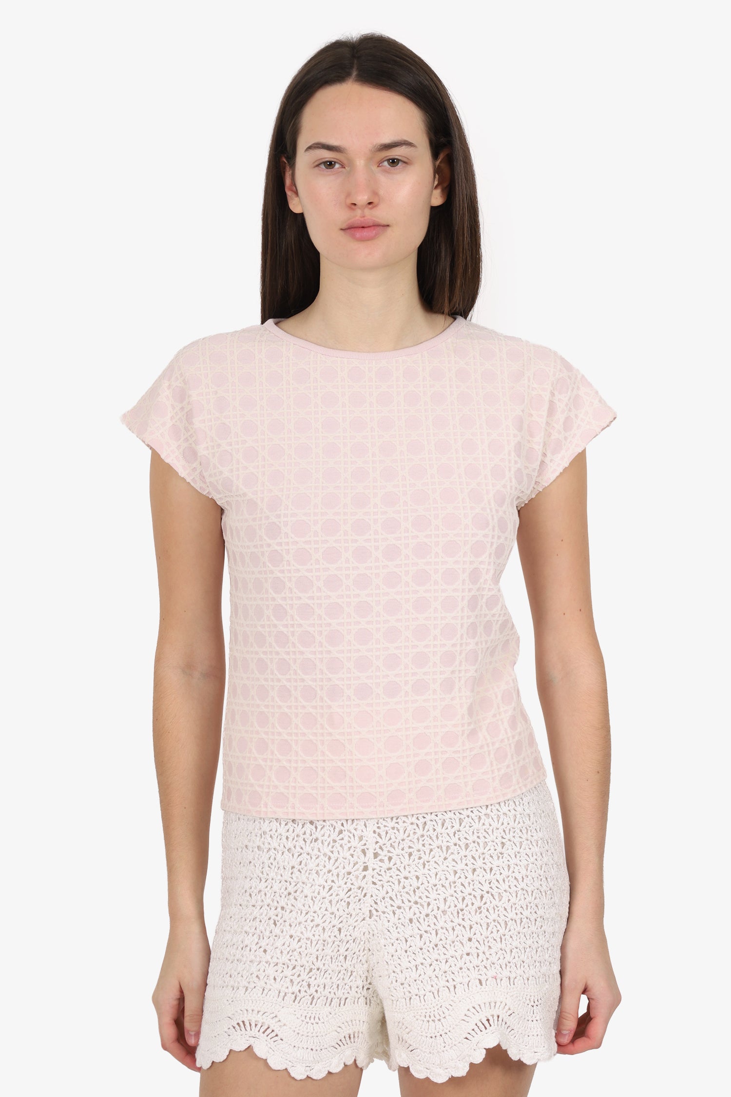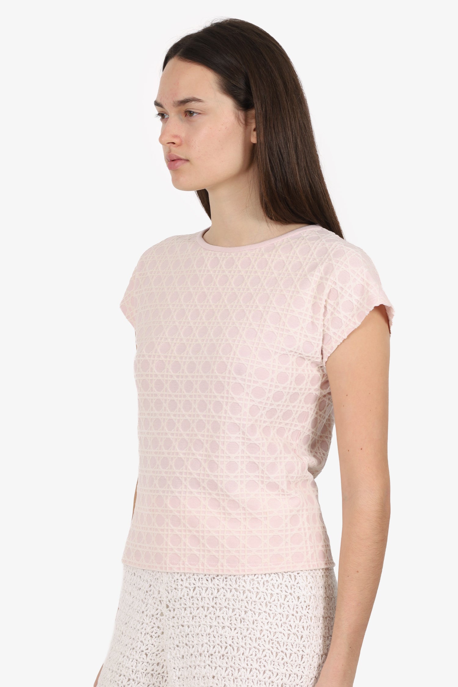Refresh availabilityChristian Dior Pink Velvet Micro Cannage Short Sleeve Top. Pull-on. Round neckline. Tonal stitching.