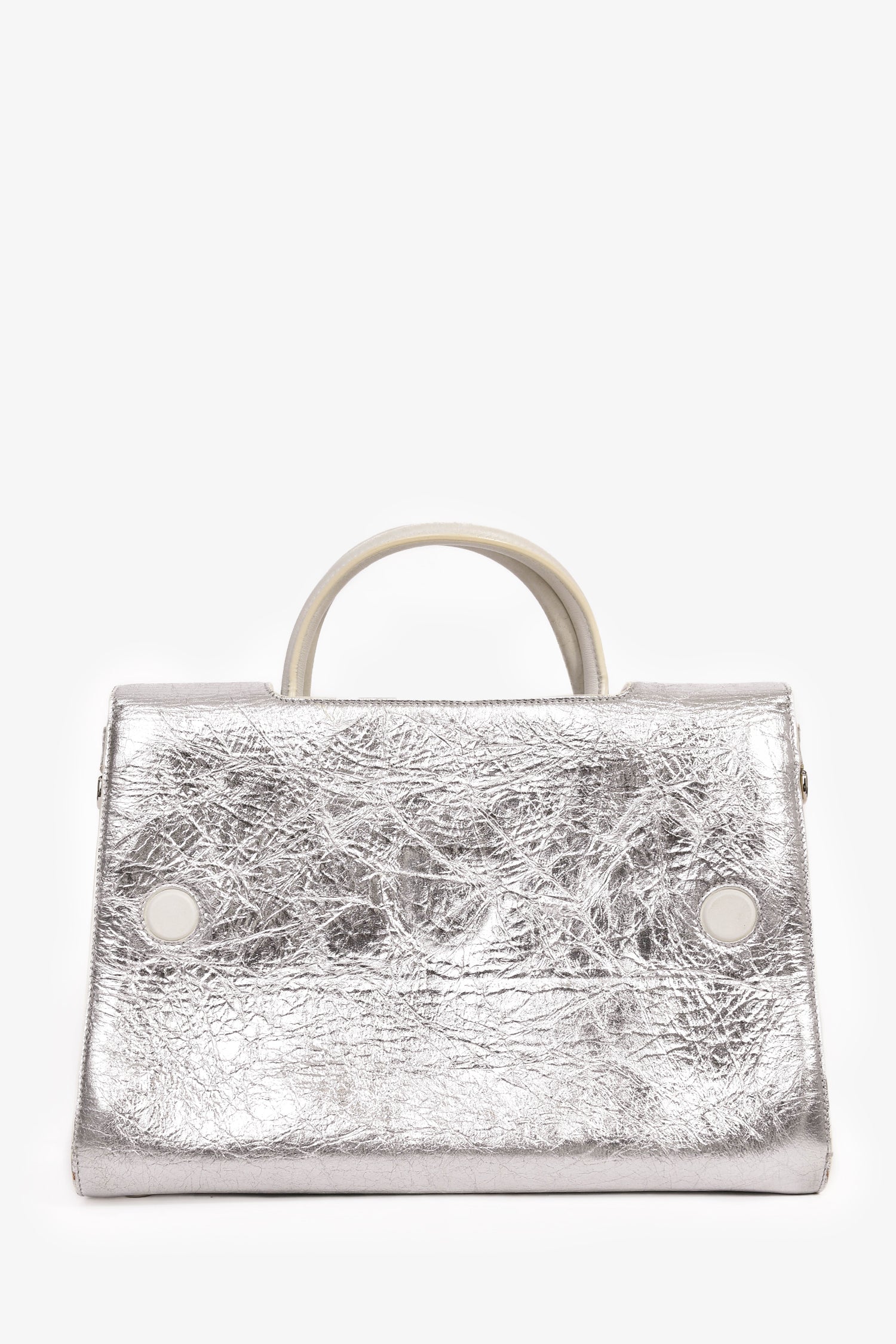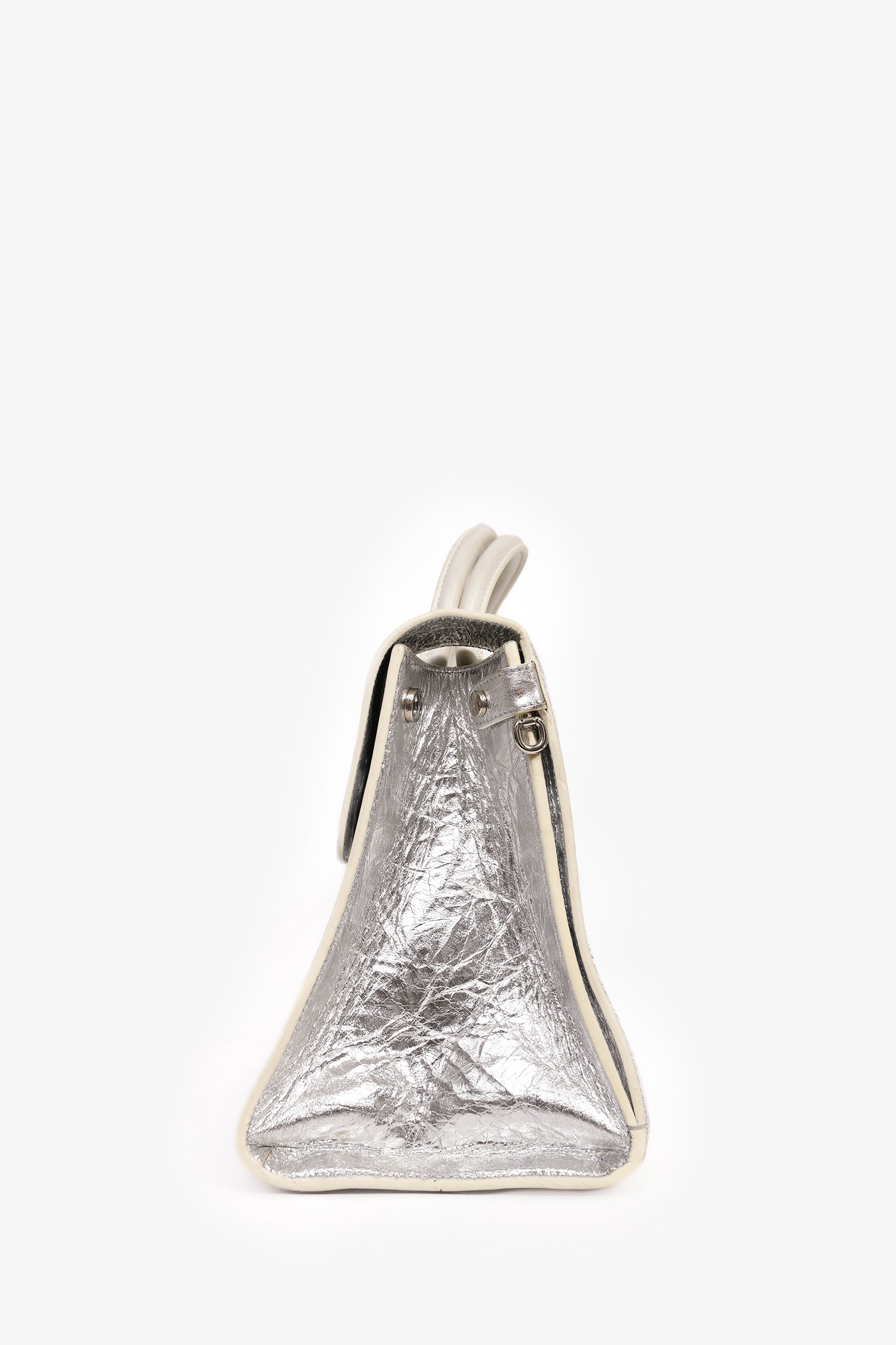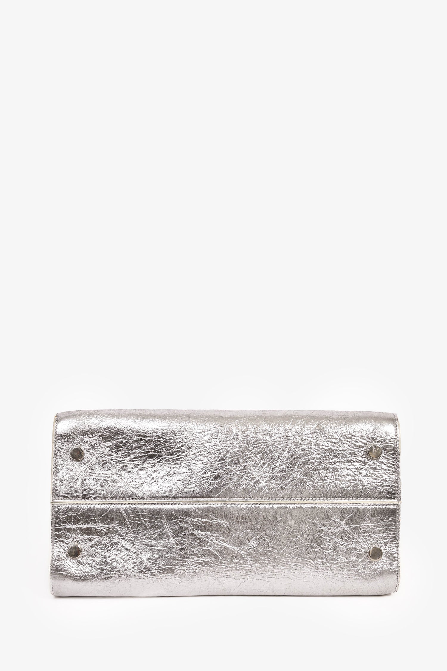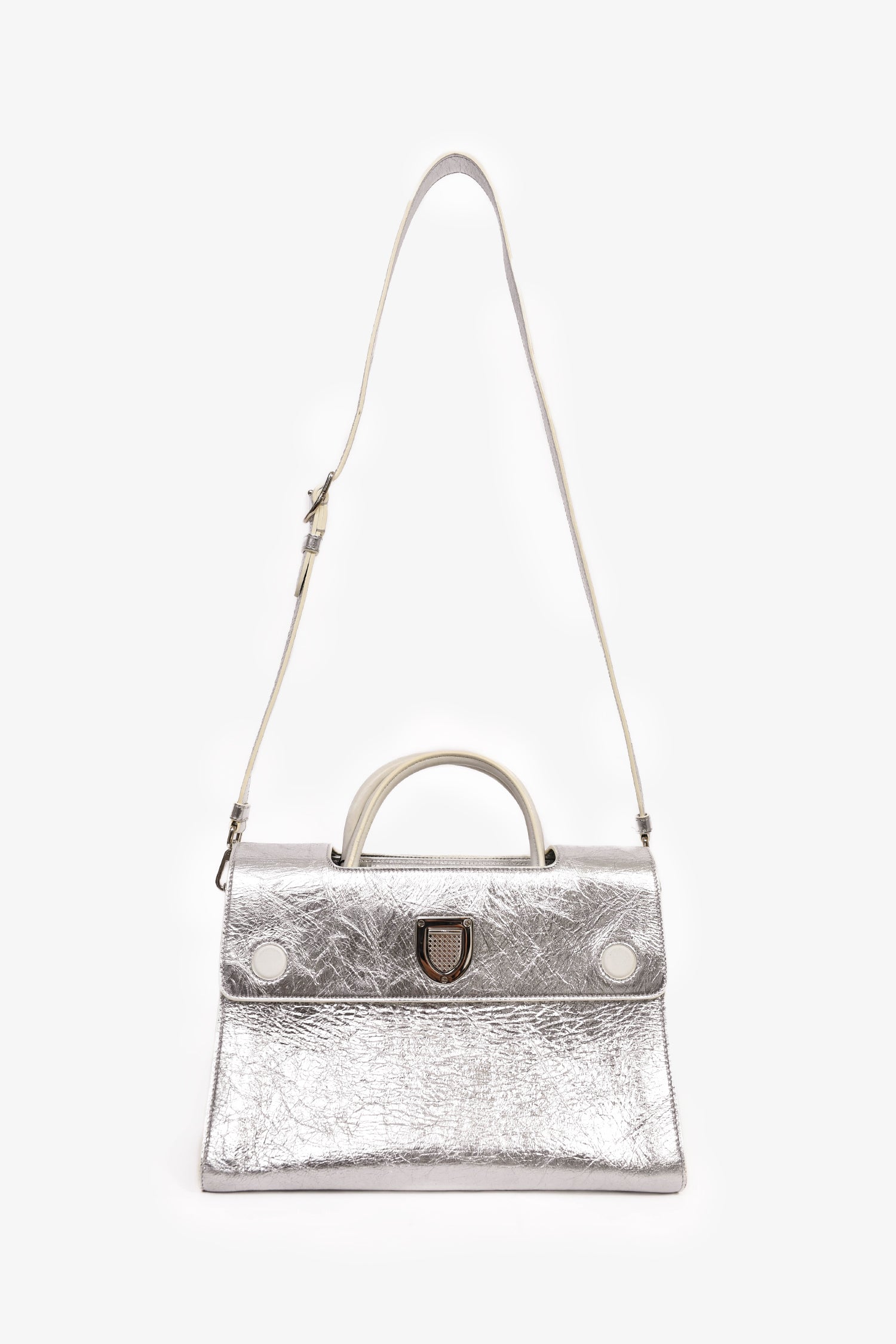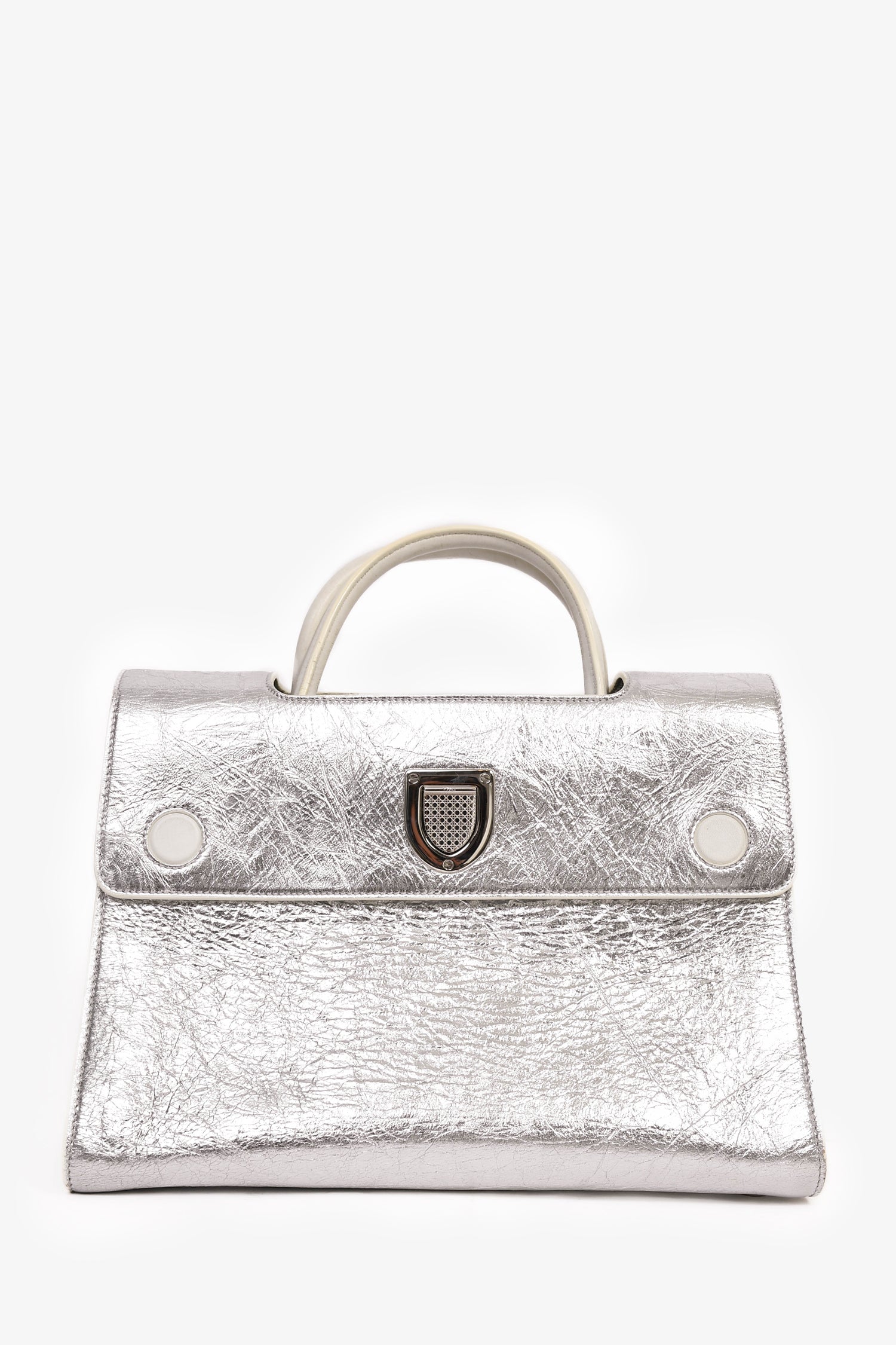 Refresh availabilityChristian Dior Silver Crinkle Leather 'Diorever' Medium Top Handle. Rolled leather top handles. Silver-tone hardware. Fold-over flap. Magnetic closures. Single fold-under flap. 3 interior pockets. Detachable strap. Tonal stitching.