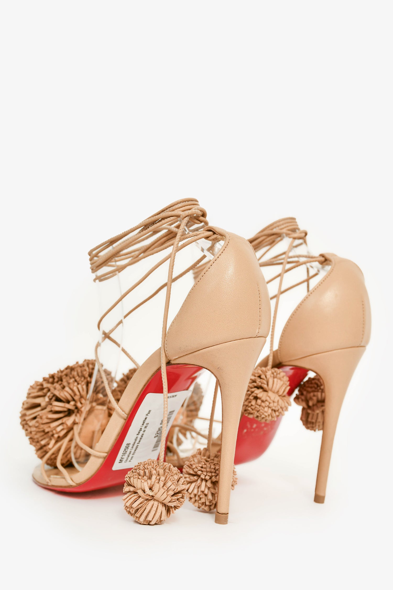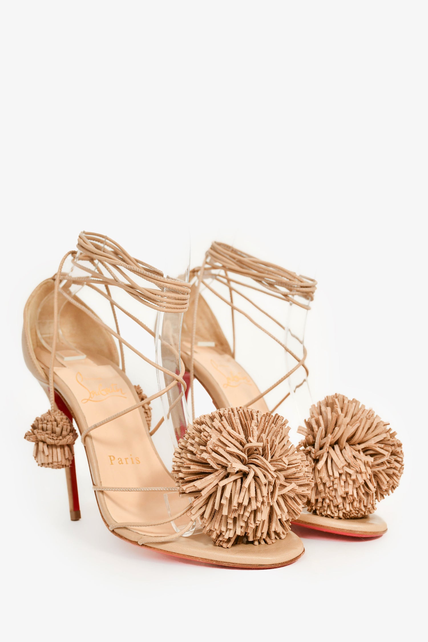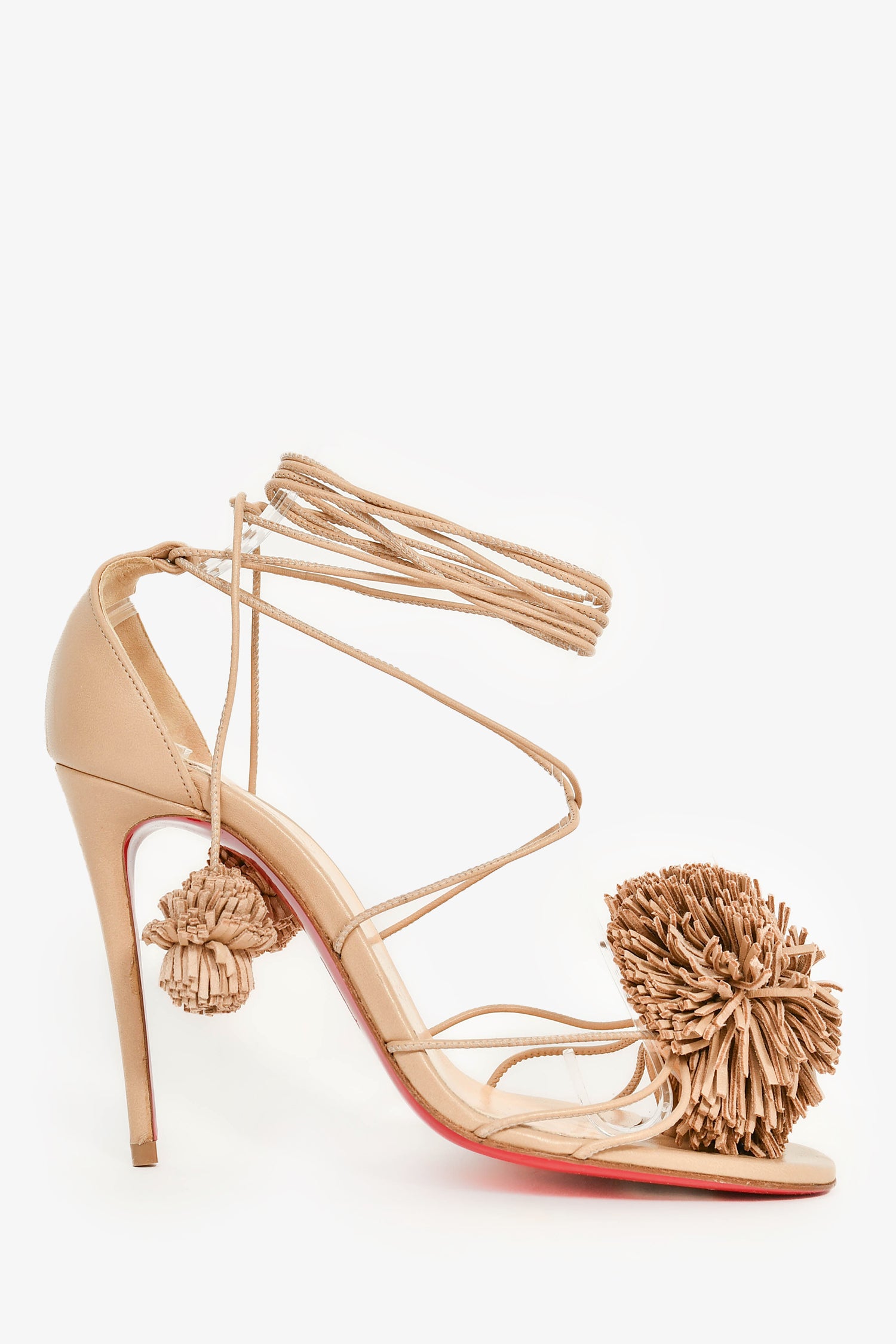 Refresh availabilityChristian Louboutin Beige Leather Pom Pom Strappy Sandals. Round toe. Leather pom poms. Stiletto heel. Tonal stitching.
