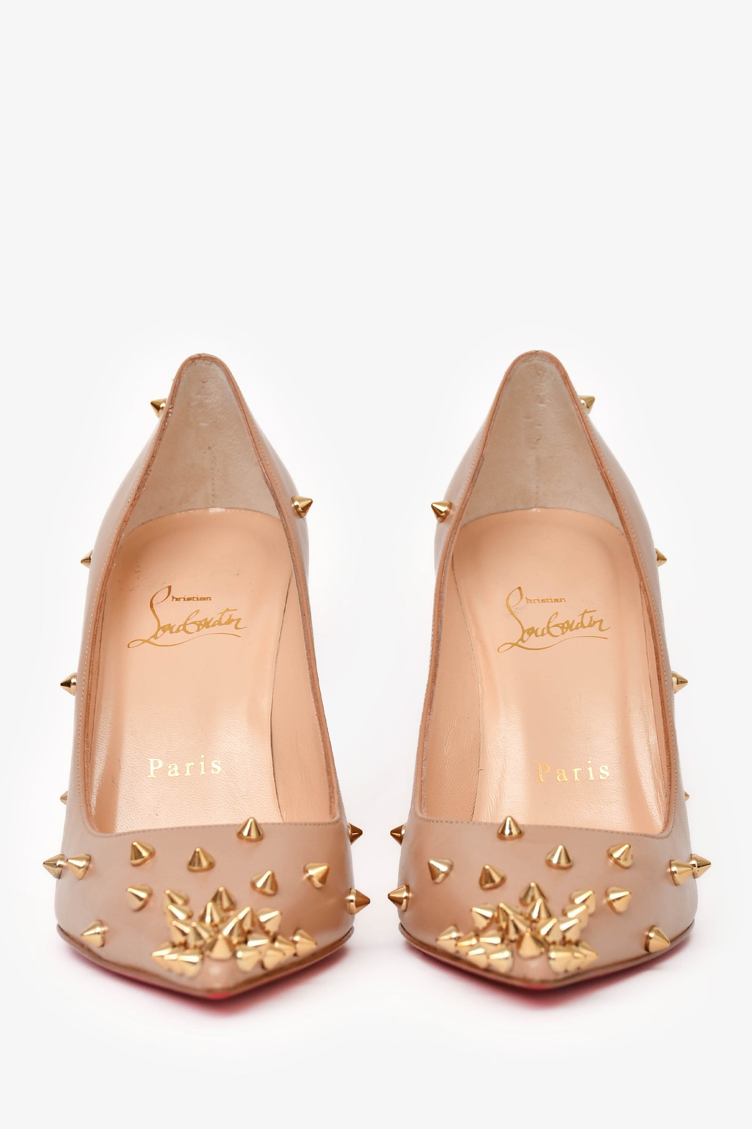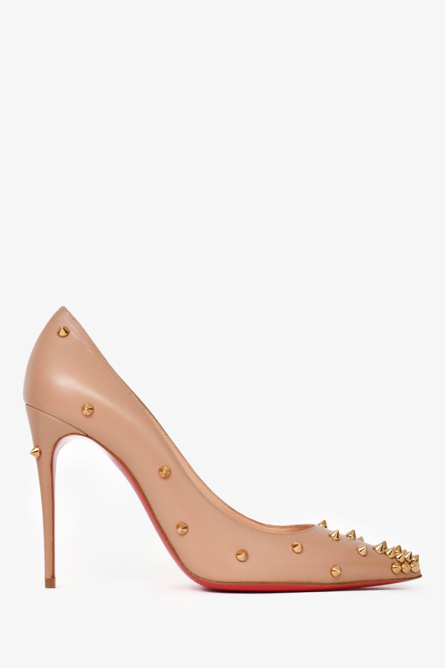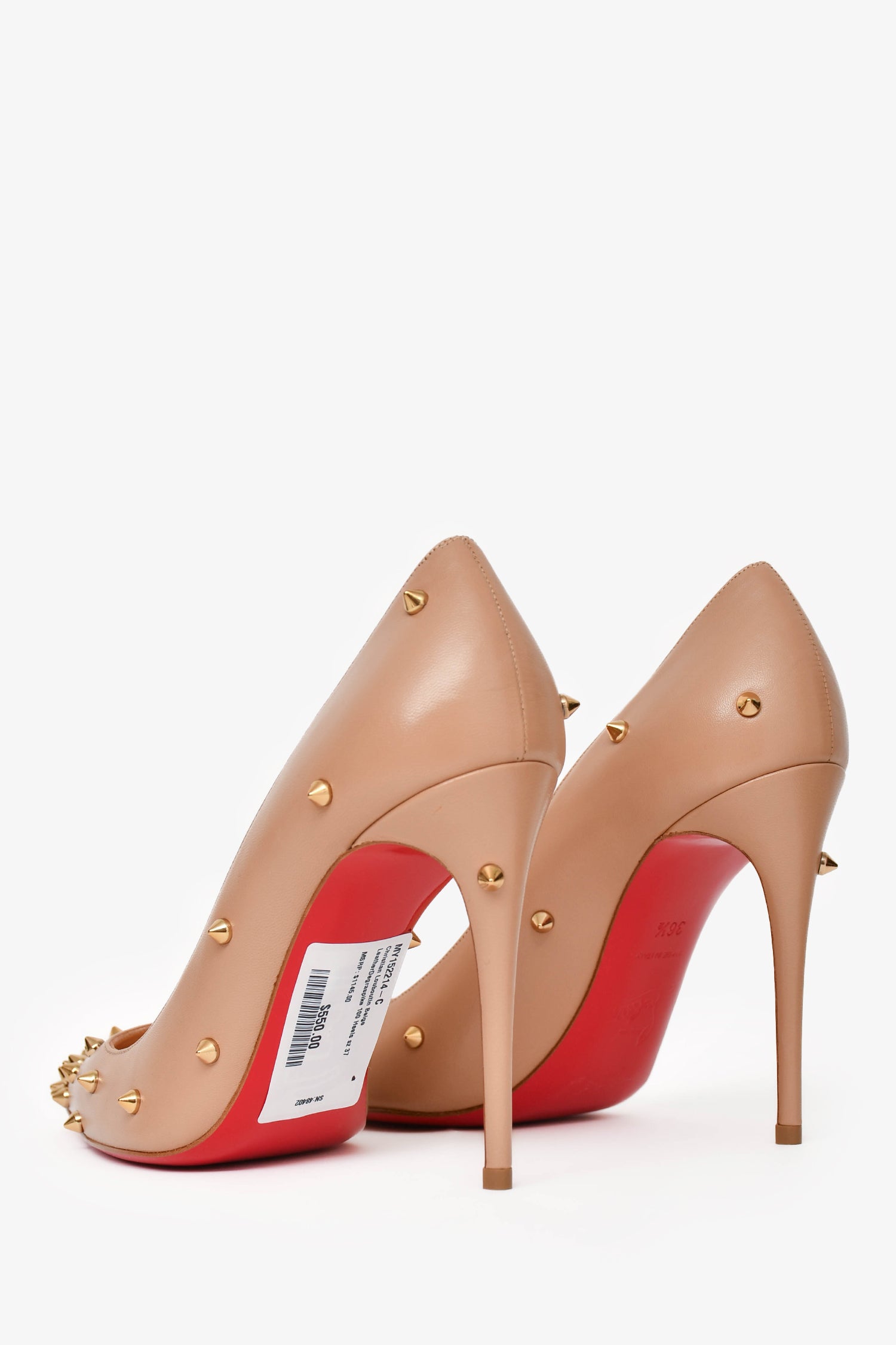 Refresh availabilityChristian Louboutin Beige Leather Degraspike 100 Heels. Slip-on and pointed toe design. Gold-tone studs detailing throughout. Tonal stitching. Comes with dust bag and box. Comes with two spare heel caps.